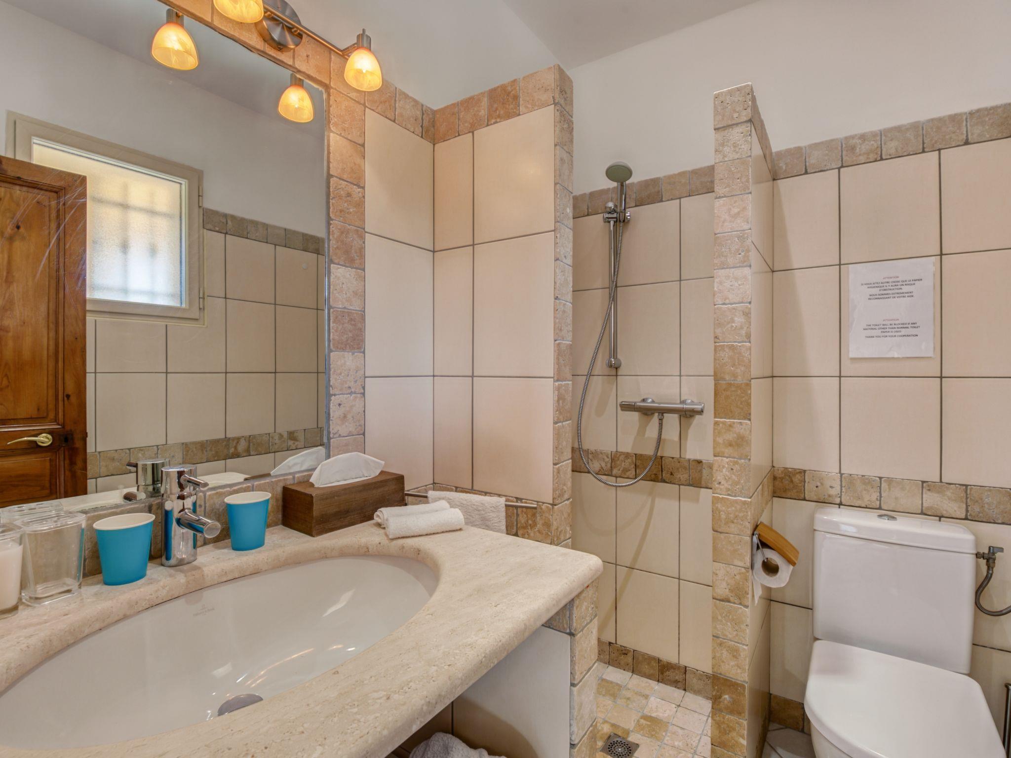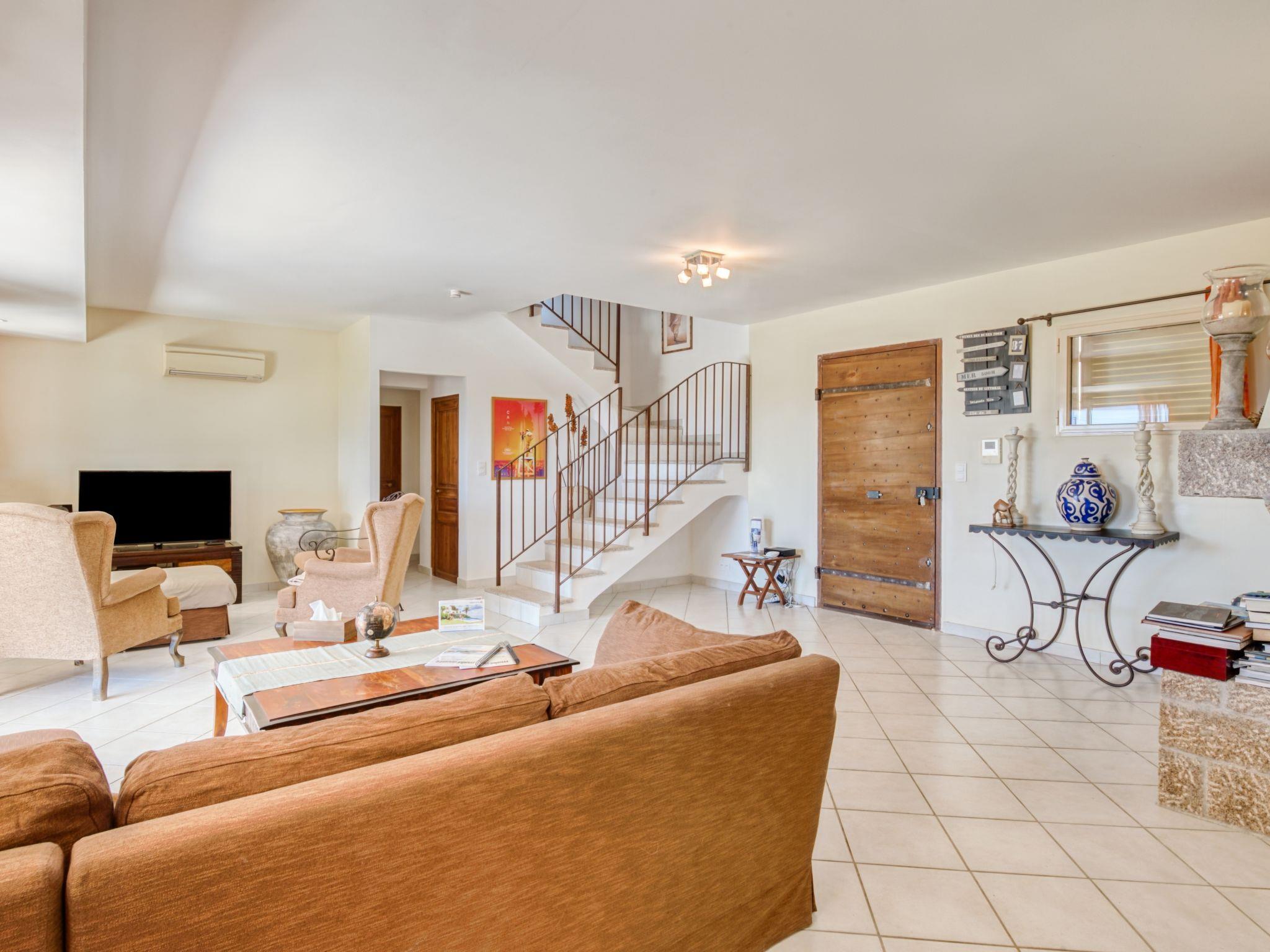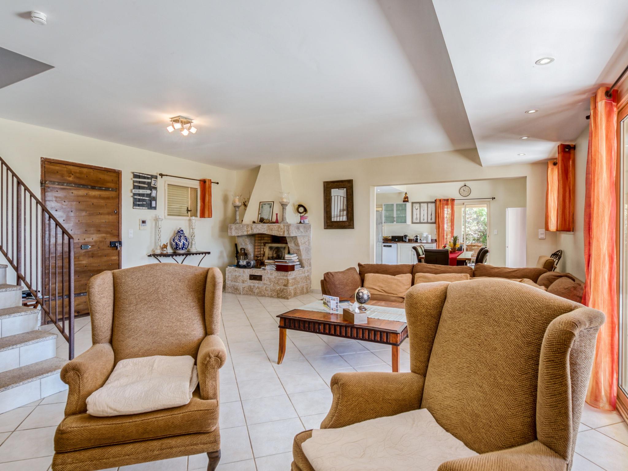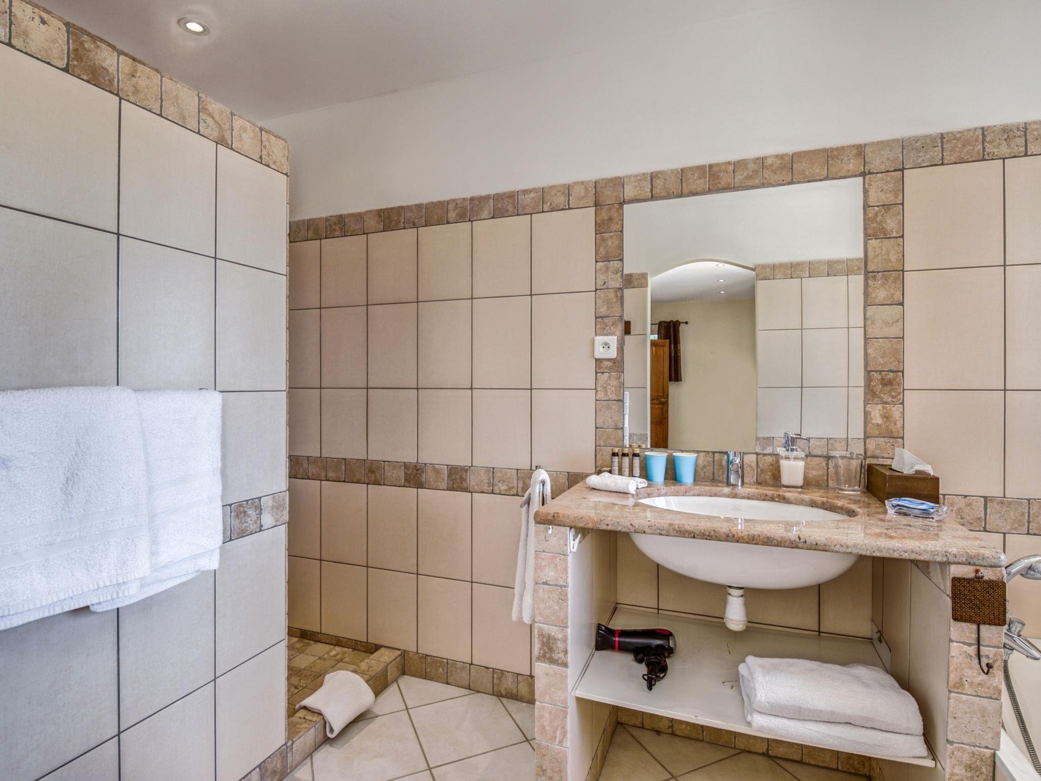 6-room villa 250 m2 on 2 levels. Beautiful and cosy furnishings: large living/dining room with TV (flat screen). Exit to the terrace. 2 rooms, each room with 1 french bed (180 cm, length 200 cm), shower/WC. Exit to the terrace. 1 room with 2 beds (90 cm, length 190 cm), shower/WC. Exit to the terrace. 1 room with 2 beds (90 cm, length 190 cm), shower/WC. Large, open kitchen (4 hot plates, oven, dishwasher, microwave, freezer, electric coffee machine). Upper floor: 1 room with 1 french bed (160 cm, length 200 cm). Exit to the balcony. Bathroom, sep. WC. Air-conditioning, forced-air heating. Large terrace 50 m2. Terrace furniture, deck chairs (10). View of the garden. Facilities: washing machine, iron, children's high chair, baby cot for up to 3 year olds, hair dryer. Internet (WiFi, free). Please note: two of the bedrooms on the ground-floor, are located in the adjoining house, with separate entrance.