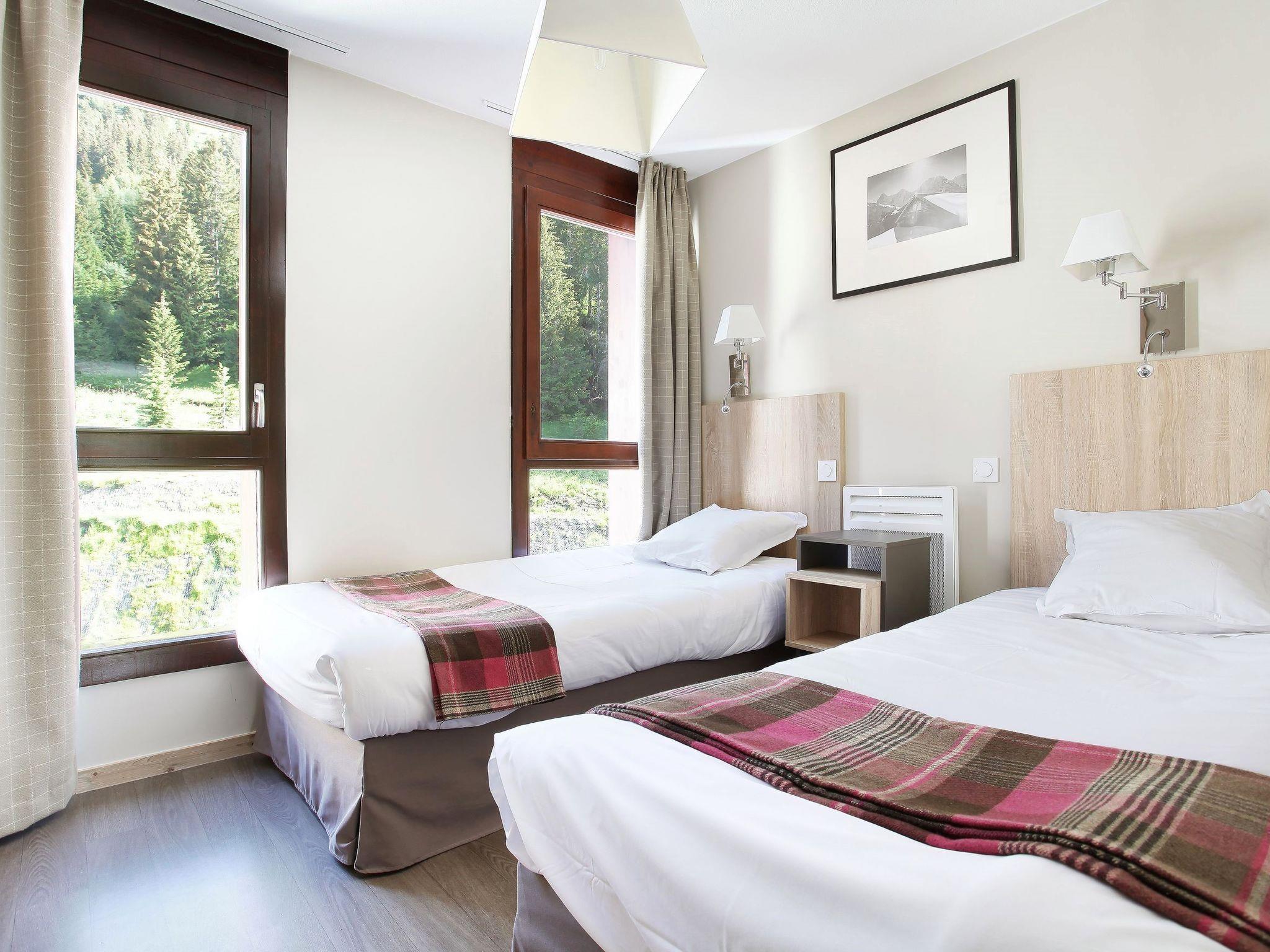 "Résidence Odalys Référence Le Panoramic", 2-room apartment 42 m2, on the ground floor. Tasteful furnishings: living/sleeping room with 2 sleeping facilities, dining table and TV. Exit to the balcony. 1 room with 1 french bed. Alcove with 1 x 2 bunk beds. Small, open kitchen (dishwasher, 2 ceramic glass hob hotplates, toaster, kettle, microwave, electric coffee machine). Bath/WC. Electric heating. Balcony. Facilities: Internet (WiFi, free). Parking (roofed, 1 car). Maximum 1 pet/ dog allowed. Instead of an enclosed bedroom, some sleeping areas are located in an open-plan area (gallery, alcove, etc.).