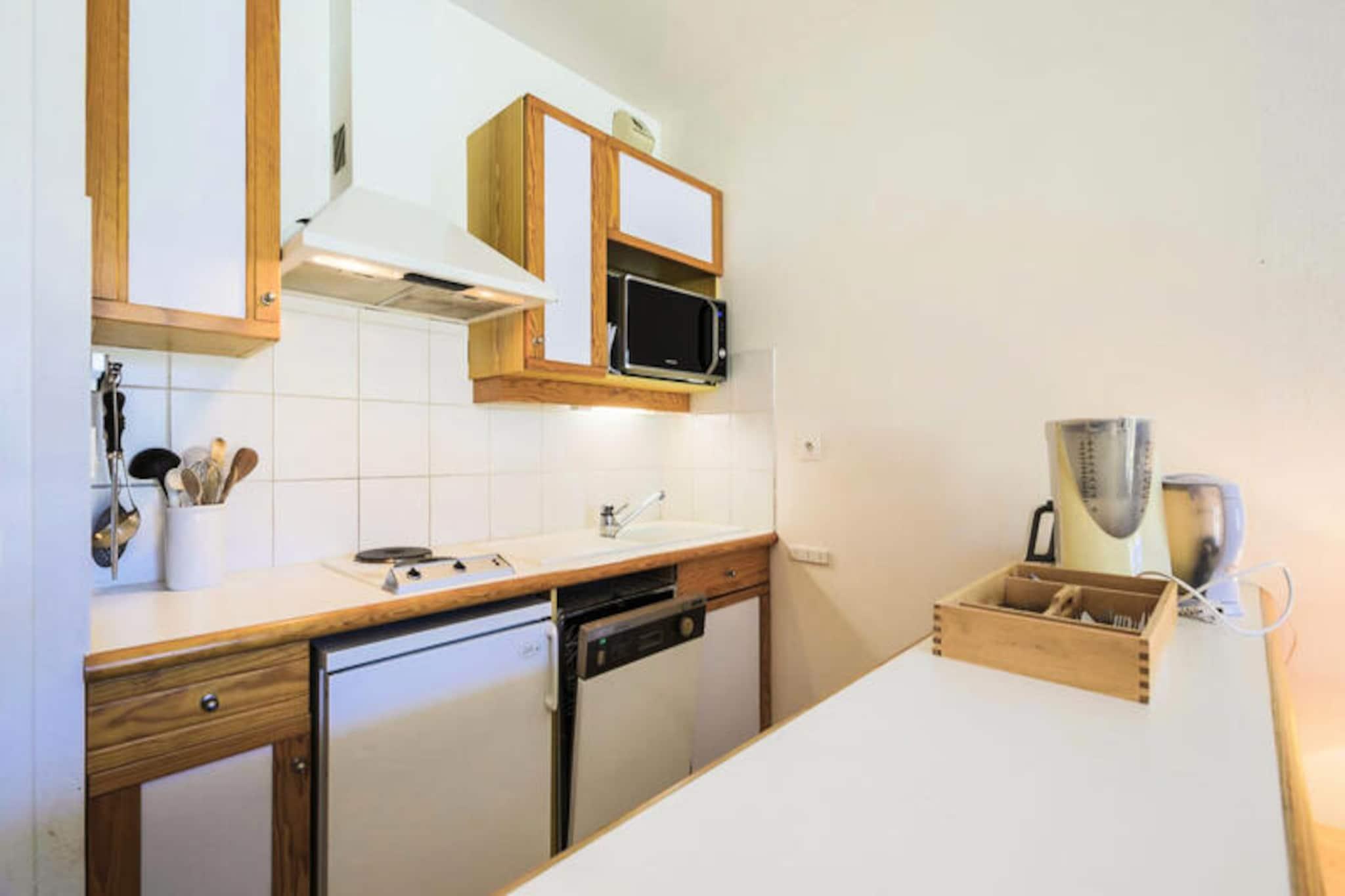 Højt over den fredfyldte landsby Flaine, i en højde af 1800 m, tilbyder Résidence Le Château de Crans et roligt tilflugtssted omgivet af de franske alpers majestætiske skønhed. Denne skandinaviske træhytte blander rustik charme med moderne komfort og skaber en indbydende atmosfære, der er perfekt til både eventyr og afslapning. Fra sin høje beliggenhed kan gæsterne nyde en betagende panoramaudsigt over snedækkede tinder og frodige alpine landskaber – et syn, der forandrer sig med årstiderne. Indvendigt er studiolejligheden omhyggeligt designet til at rumme op til fire gæster. Boligområdet er hyggeligt, men funktionelt med en komfortabel stue, et veludstyret køkken, en sovealkove, et badeværelse og et separat toilet. Maeva Home Comfort-mærket sikrer fremragende valuta for pengene med essentielle faciliteter for et problemfrit ophold. Yderligere tjenester, såsom sengelinned og slutrengøring, er tilgængelige for at forbedre din oplevelse. Uanset om du tilbereder et solidt måltid efter en dag på pisterne eller slapper af med en varm drink, tilbyder denne bolig alt, hvad du behøver for en mindeværdig alpinferie. For skientusiaster er beliggenheden ideel. ESF-skiskolen og Piou Piou Club ligger kun 500 m væk, mens