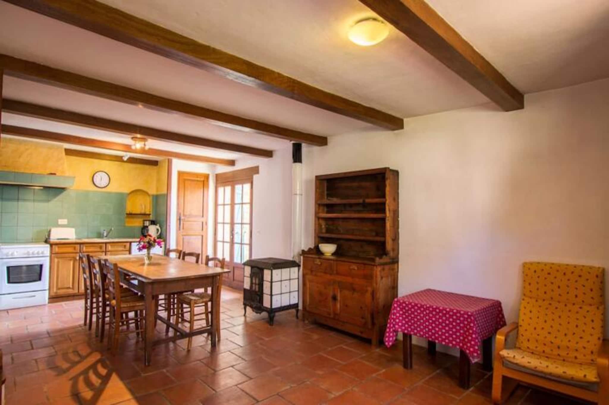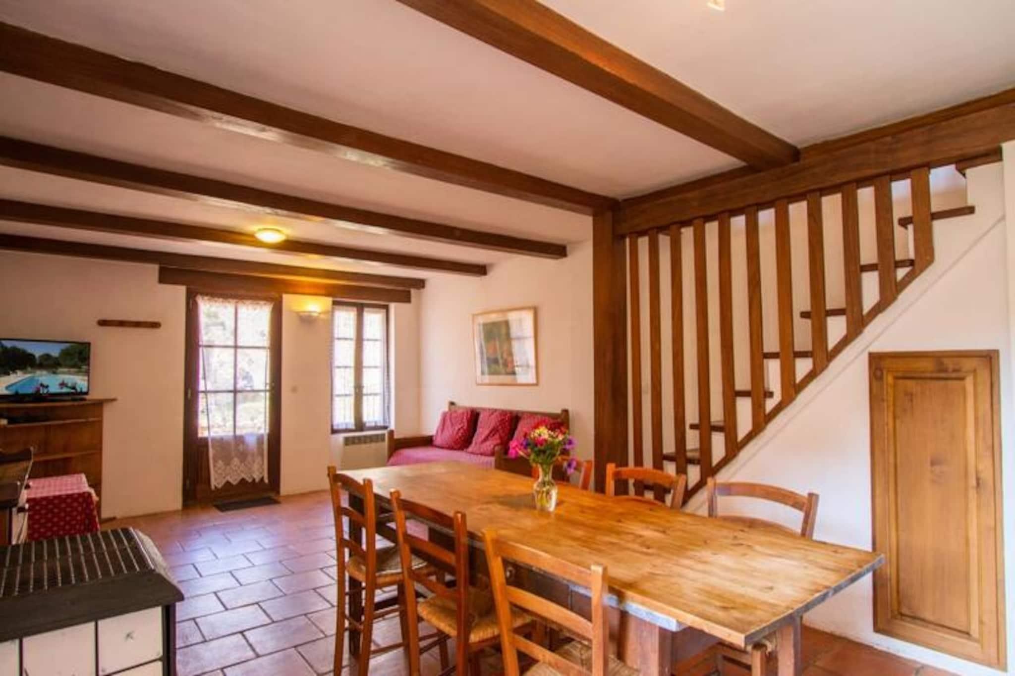 Dette rummelige feriehus, beliggende i rolige naturomgivelser, byder på 75 m² boligareal og to store terrasser mod syd og vest. Stueetagen har en stor stue med et opholdsområde, brændeovn og et fuldt udstyret køkken, mens ovenpå et stort soveværelse med en dobbeltseng (160 cm) og en ekstra enkeltseng (80 cm) komfortabelt kan sove tre gæster . Det andet soveværelse, beliggende på mezzaninen, byder på tre enkeltsenge, som kan sættes sammen til en dobbeltseng (160 cm). Der er et separat badeværelse med bruser og toilet. Kæledyr er velkomne på anmodning. Ejendommen ligger inden for seks hektar frodig natur og er en del af Domaine de la Haute Maure, en smuk ejendom med stenege, fyrretræer og middelhavsvegetation. Den fælles opvarmede swimmingpool (15 x 5 meter) ligger kun 100 meter væk, og du kan nyde de fredfyldte omgivelser til en zen- og naturfyldt ferie. Til afslapning tilbyder ejendommen adgang til en spa med sauna, hammam og jacuzzi (efter aftale). Ejendommen er udstyret med et fuldt funktionelt køkken og moderne badeværelsesfaciliteter. Du kan nyde måltider på terrasserne eller drage fordel af grillen. Huset tilbyder også et vandfiltreringssystem til at drikke og lave mad, hvilket sikrer vand af høj kvalitet under hele dit ophold. Miljøvenlige produkter bruges til rengøring og tøjvask, hvilket gør denne ejendom til et ideelt valg for miljøbevidste rejsende.