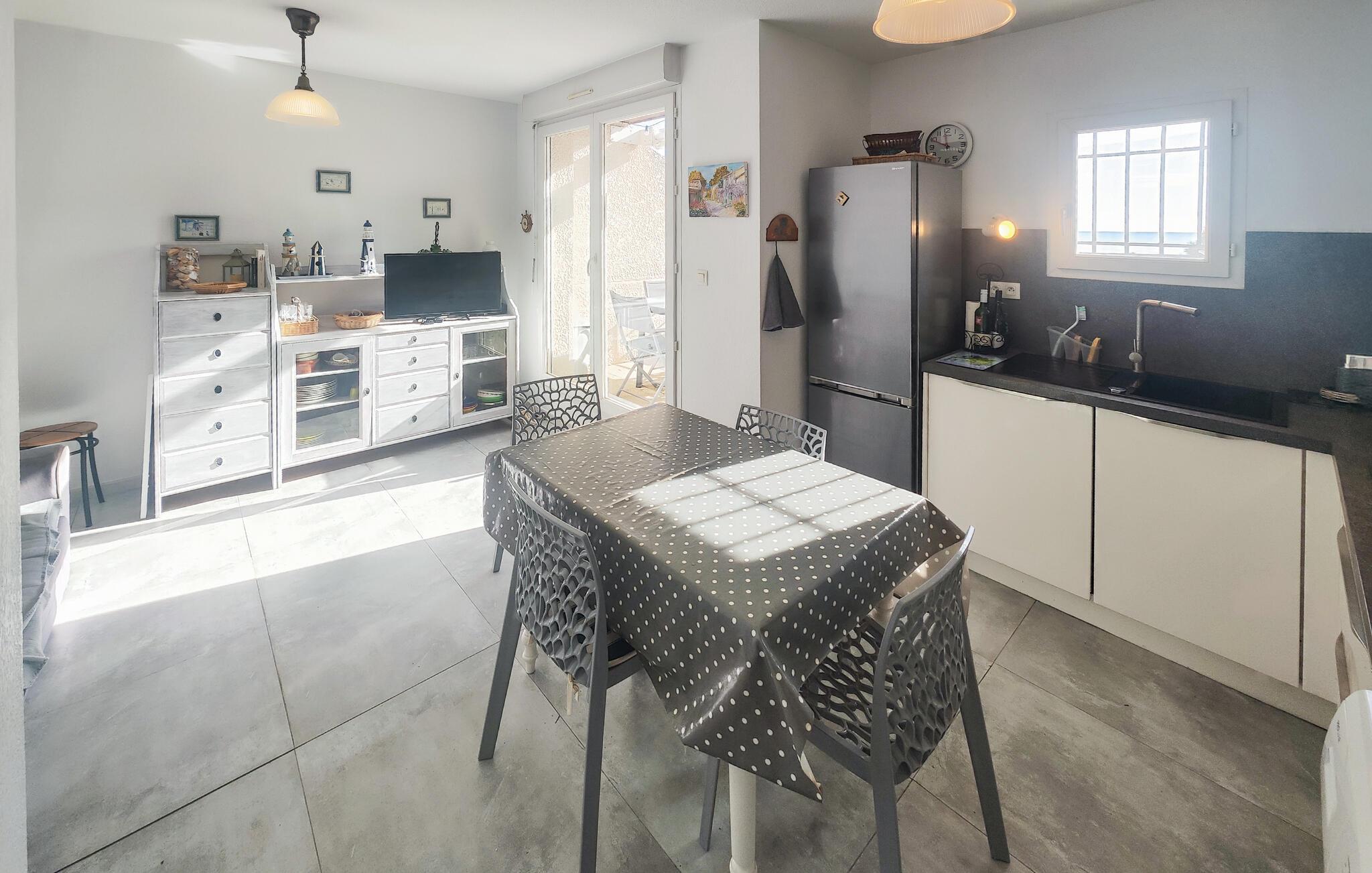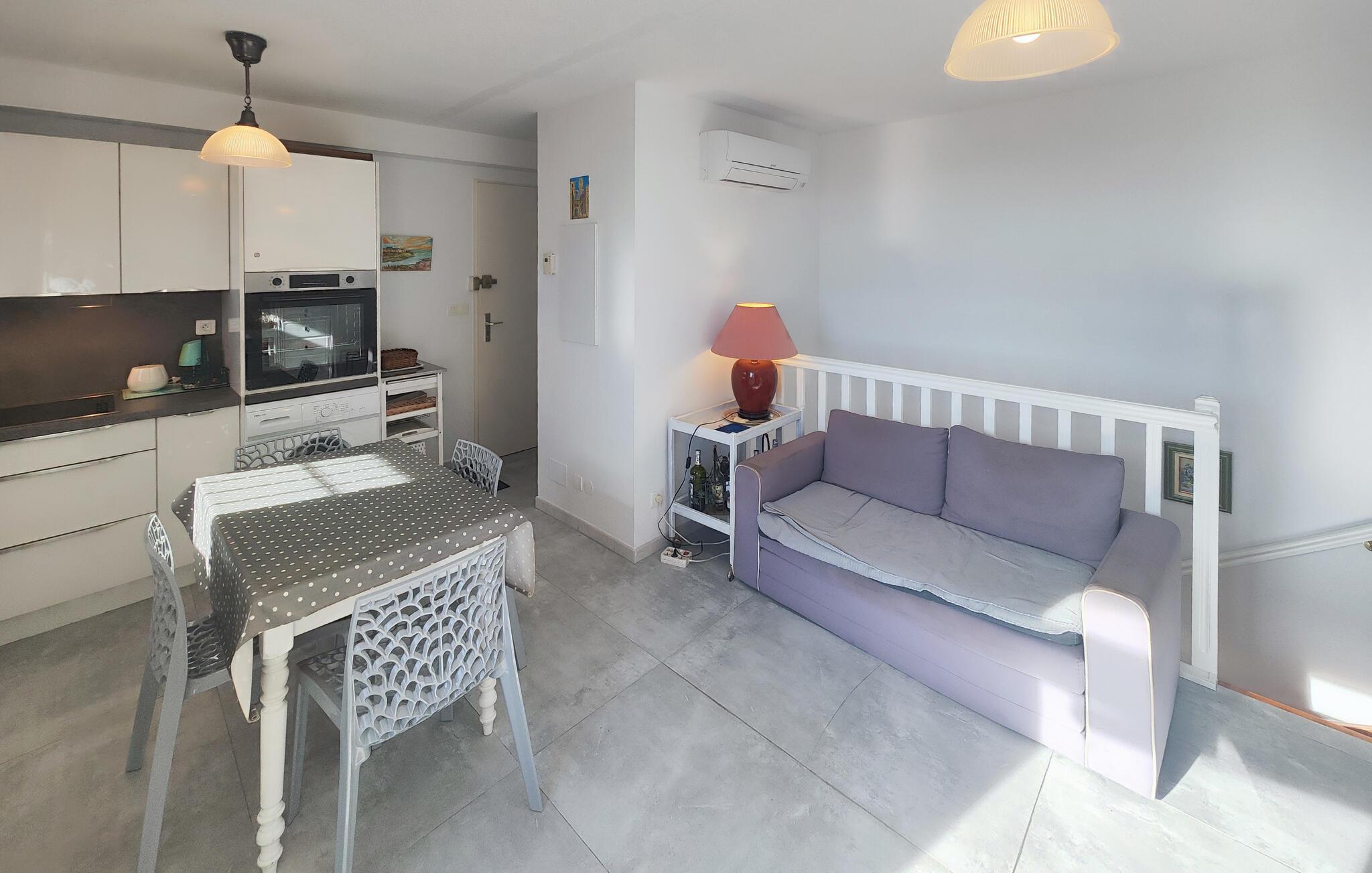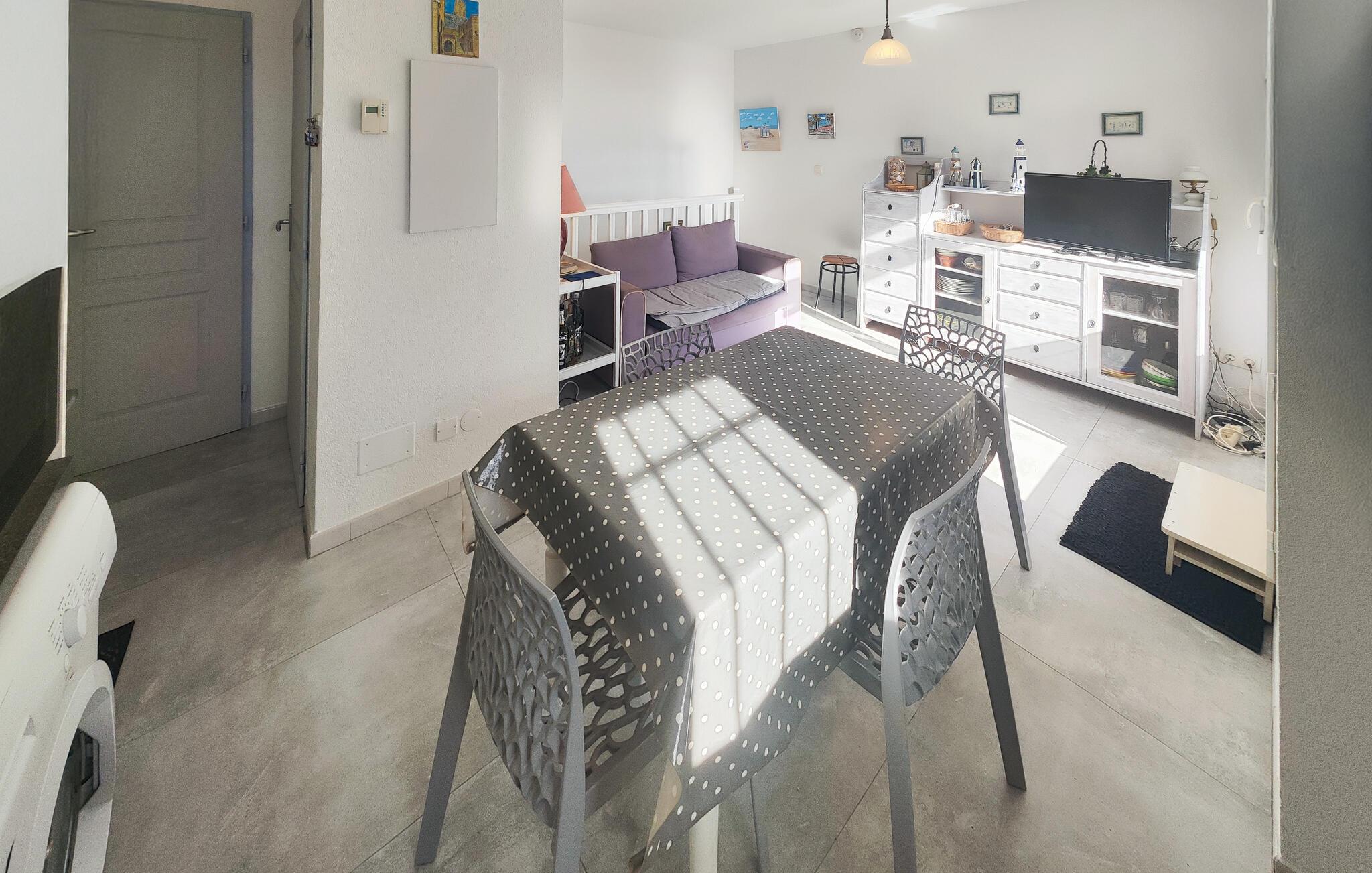 Denne indbydende lejlighed byder jer velkommen med et lyst interiør, beliggende nær Middelhavskysten. Føl jer hjemme, mens I tilbereder lækre retter sammen og nyder afslappede måltider ved det indbydende spisebord. Planlæg jeres aktiviteter og slap af om aftenen med et brætspil eller en god bog i sofaen.