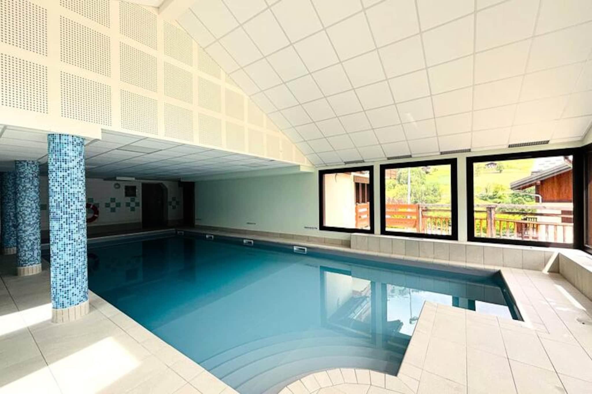 I de franske alpers fredfyldte omfavnelse tilbyder denne charmerende lejlighed i Les Chalets des Evettes-residensen et perfekt tilflugtssted for bjergentusiaster. Med sin førsteklasses beliggenhed ved foden af ??Espace Diamant-skiløjperne vågner du op til en betagende alpin udsigt og eventyrlysten blot få skridt fra din dør. Uanset om du søger spændingen ved skiløb eller roen på bjergstier, er dette din indgang til en verden af ??naturlig skønhed og udendørsaktiviteter. \n\nLejligheden er designet til komfortabelt at rumme op til fire gæster og har en hyggelig stue med åbent køkken, udstyret med moderne apparater såsom mikrobølgeovn, opvaskemaskine og køleskab. Opholdsstuen åbner ud til en vestvendt balkon, perfekt til at nyde solnedgangen efter en dag med udforskning. Sovepladserne inkluderer et soveværelse med køjesenge og en sovesofa i stuen, hvilket sikrer afslappende nætter for alle. Et badeværelse med badekar og et separat toilet bidrager til bekvemmeligheden, mens den bjerginspirerede indretning skaber en varm og indbydende atmosfære. \n\nUd over boligen tilbyder skiområdet Espace Diamant 192 km pister, der forbinder seks maleriske landsbyresorter og henvender sig til skiløbere på alle niveauer. Om sommeren forvandles regionen til et paradis for vandrere og mountainbikere, med stier, der starter lige fra boligen. Den nærliggende Evettes-stolelift giver adgang til panoramaudsigt over Aravis-bjergkæden, mens Flumet-søen og fritidscentret, kun 3 km væk, tilbyder familievenlige aktiviteter såsom minigolf, en skatepark og et klatretårn. \n\nUanset om du udforsker de elegante gader i Megève, beundrer Mont Blanc i Chamonix eller nyder det krystalklare vand i Annecy-søen, er denne lejlighed din ideelle base for uforglemmelige alpine eventyr. Med sin opvarmede indendørs pool, bekvemme faciliteter og nærhed til naturen lover den en ferie fyldt med komfort, spænding og værdsatte minder.