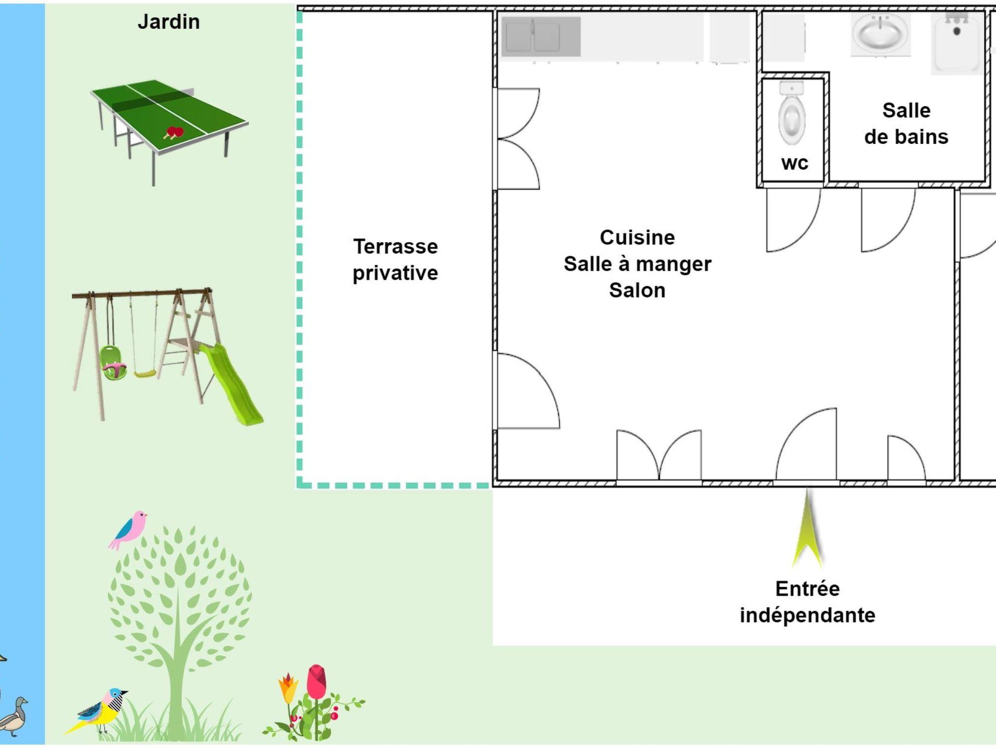 - Located on the ground floor, on the banks of the river, with its own entrance.
