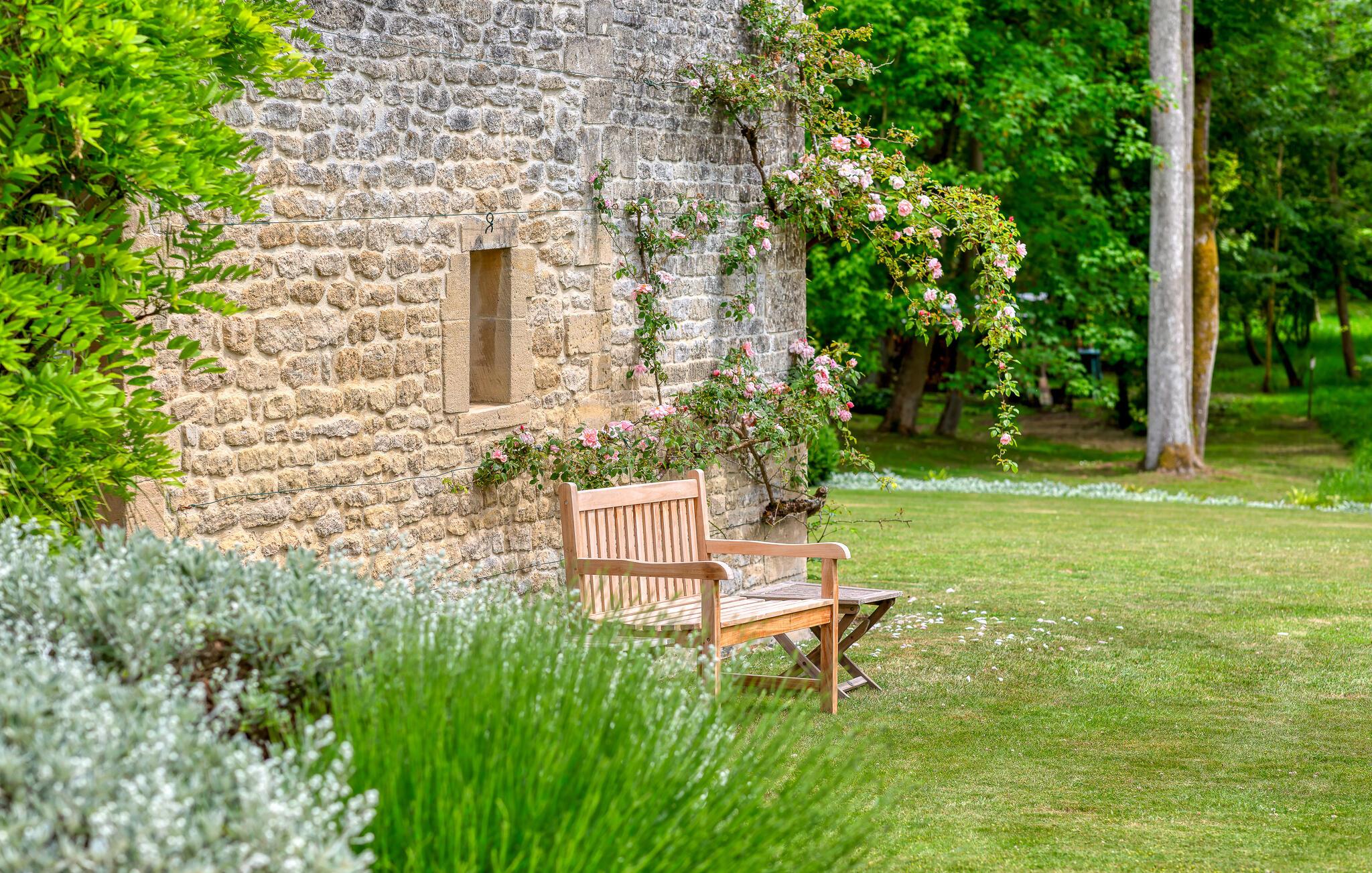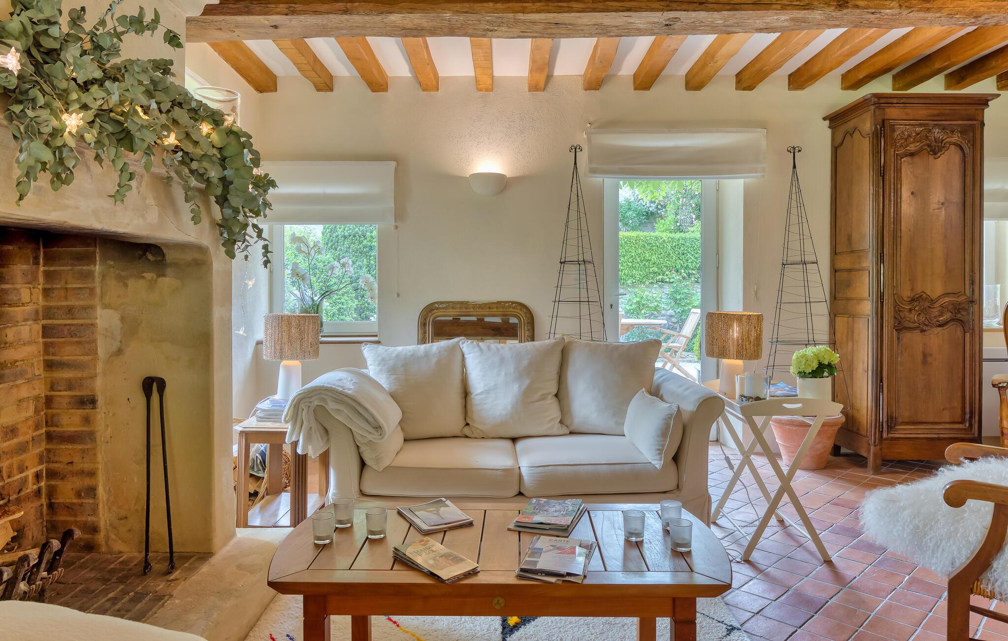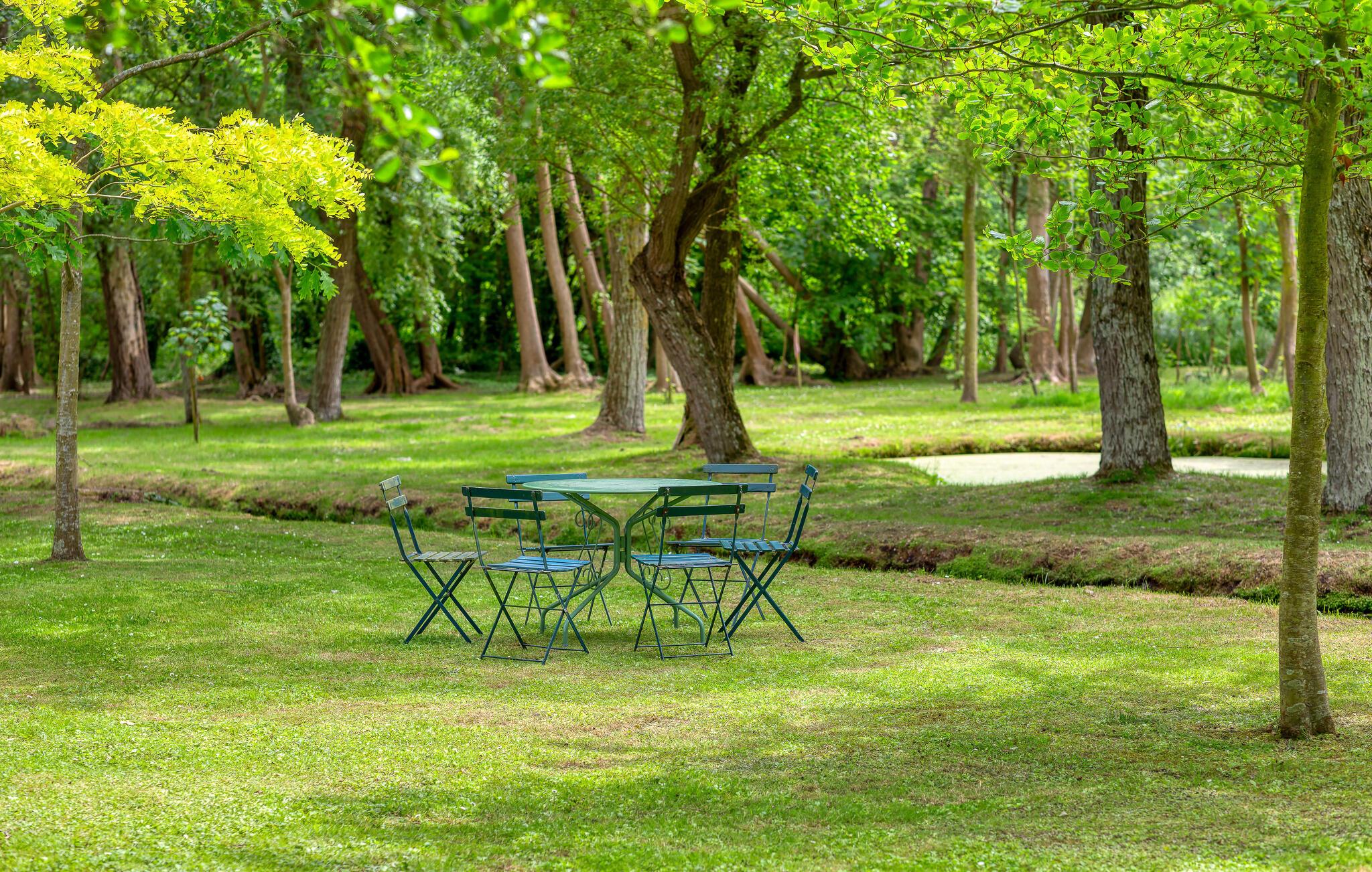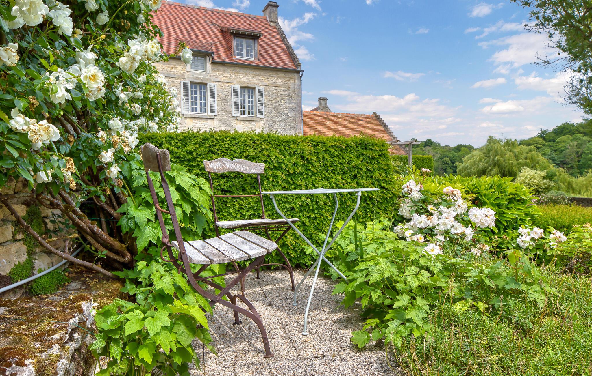Ro og afslapning i det grønne! Det kan I opnå, hvis I vælger at holde jeres ferie i dette normanniske landhus fra det 19. århundrede. Slap af i den yderst velplejede have og spis jeres måltider på den solforkælede grillterrasse. Græsplænen er delvist omgivet af vandløb, og I kan gå herlige ture på den skovdækkede ejendom. I stuen er der en åben pejs, som er med til at gøre også de kølige eftermiddage til en hyggelig oplevelse. Mod forespørgsel kan I få stillet en strandkabin til rådighed i Bernières-sur-Mer, 8,5 km herfra. Opdag Juno Beach og de andre landingsstrande af de Allierede under 2. Verdenskrig. Her bor I mellem Caen og Bayeux, det helt rette sted til at opleve denne historierige region. I kan spille golf på Golf d’Omaha Beach (29 km) eller Golf Blue Green Caen i Biéville-Beuville (15 km), og I kan ride i Bernières-sur-Mer (11 km). For afveksling sørger også tennisbanerne i Thaon (3 km) og minigolfanlægget i Courseulles-sur-Mer (8 km). Kun 50 km mod øst ligger landskabet Pays d'Auge med hestegårde, æbleplantager og en æblevinsrute, og også Côte Fleurie, blomsterkysten, er et herligt mål for en dagstur. Langs denne kyst venter seværdige byer som Cabourg, Deauville, Trouville-sur-mer og Honfleur.