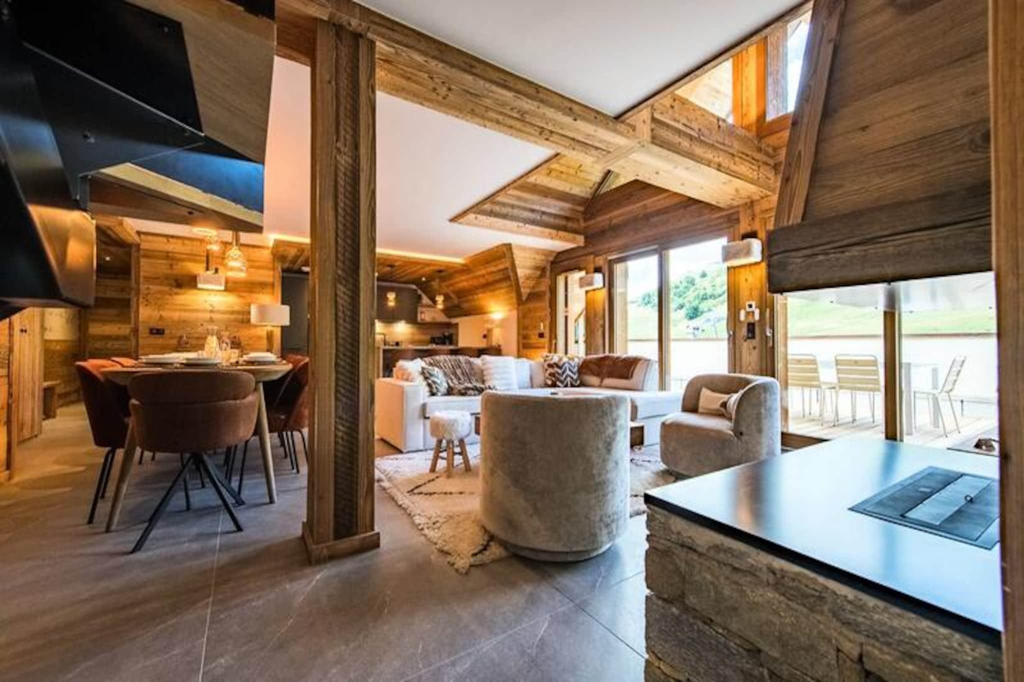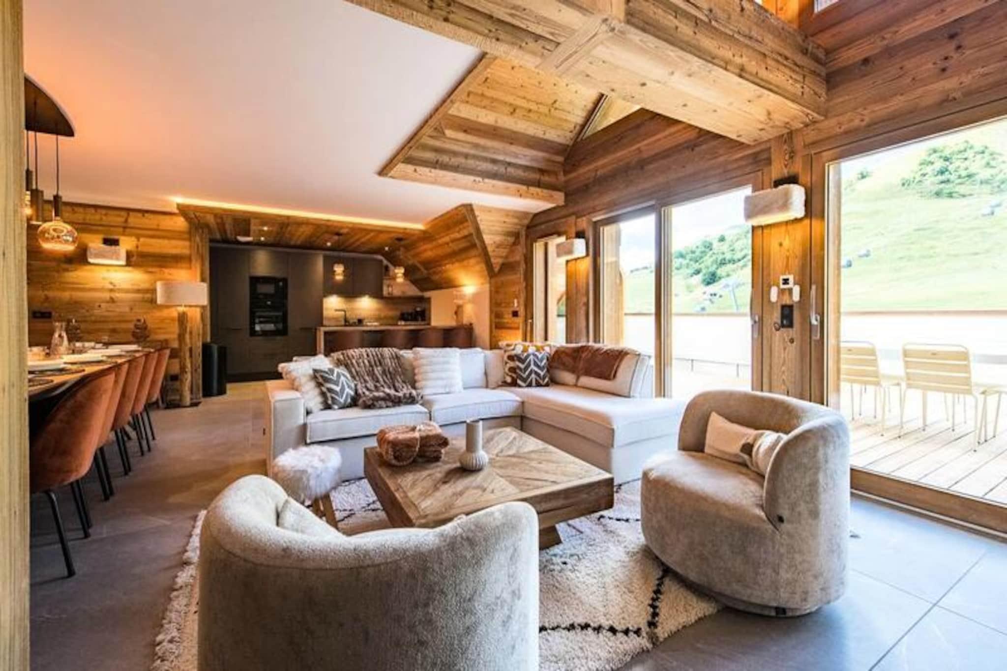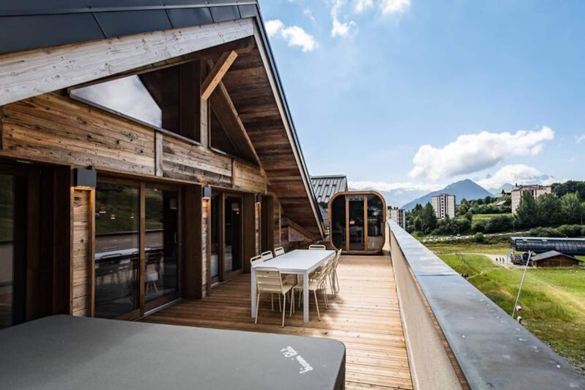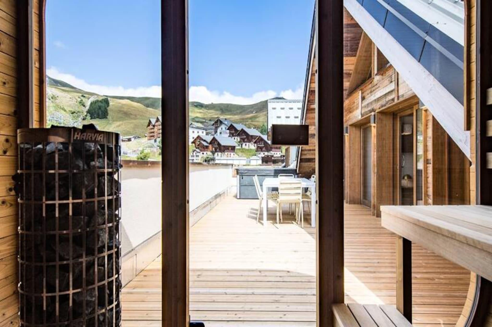 Højt over de glitrende snemarker i La Toussuire inviterer denne luksuriøse duplexlejlighed dig til at opleve de franske alper med stil. Med en betagende udsigt fra den store vestvendte terrasse, komplet med en privat sauna og udendørs jacuzzi, er hvert øjeblik her fyldt med alpin charme. Uanset om du nyder de varme bobler eller ser solnedgangen over bjergtoppene, tilbyder denne bolig et roligt tilflugtssted for familier og venner, der søger en uforglemmelig bjergflugt. \n\nLejligheden er på 130 m² og kombinerer varm, elegant indretning med materialer af høj kvalitet for at skabe en hyggelig, men sofistikeret atmosfære. Den åbne opholdsstue har et fuldt udstyret køkken, en spiseplads og en stue med en bioethanolpejs, perfekt til afslapning efter en dag på pisterne. Fem omhyggeligt designede soveværelser giver rigelig plads til op til tolv gæster, hver med sit eget badeværelse for ultimativ komfort. Yderligere faciliteter inkluderer to skibokse med støvletørrer, et vaskerum og WiFi i hele ejendommen. Slutrengøring, sengelinned og håndklæder er inkluderet, hvilket sikrer en problemfri ferieoplevelse. \n\nBeliggende direkte ved snefronten tilbyder denne lejlighed ægte ski-in/ski-out-bekvemmelighed, så du kan komme ud og prøve pisterne på få minutter. Den nærliggende La Grande Verdette tilbyder reserveret indendørs parkering, mens der er yderligere offentlig parkering i centrum af feriestedet. Ud over skiløb kan La Toussuire prale af en livlig landsbyatmosfære med butikker, restauranter og afterski-aktiviteter kun få skridt væk. \n\nUanset om du er her for at kæmpe dig gennem uberørt puddersne, slappe af i jacuzzien eller udforske det pulserende alpine samfund, leverer denne lejlighed den perfekte blanding af luksus, komfort og eventyr. Book nu for at skabe varige minder i hjertet af de franske alper.
