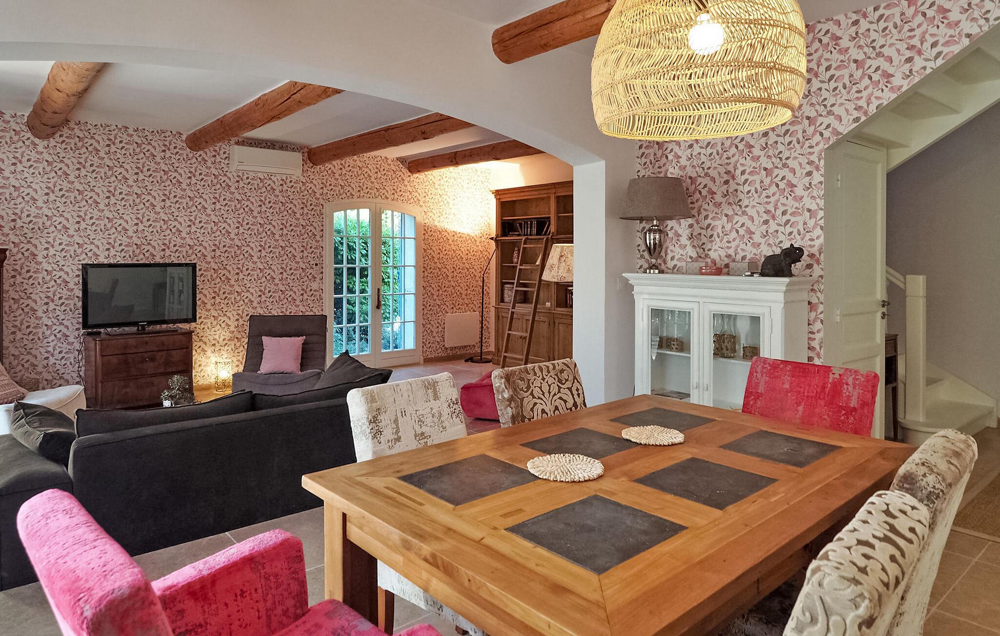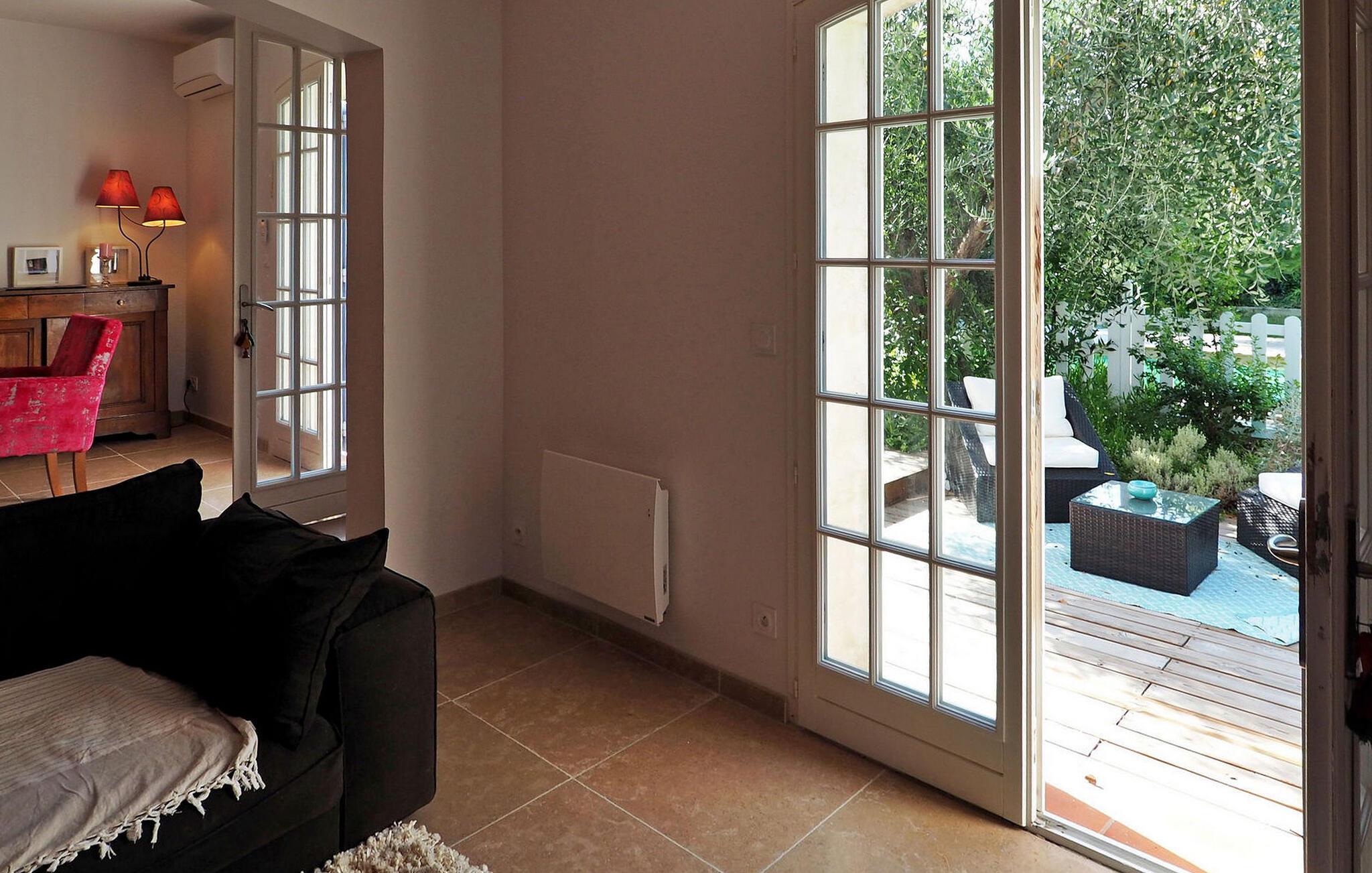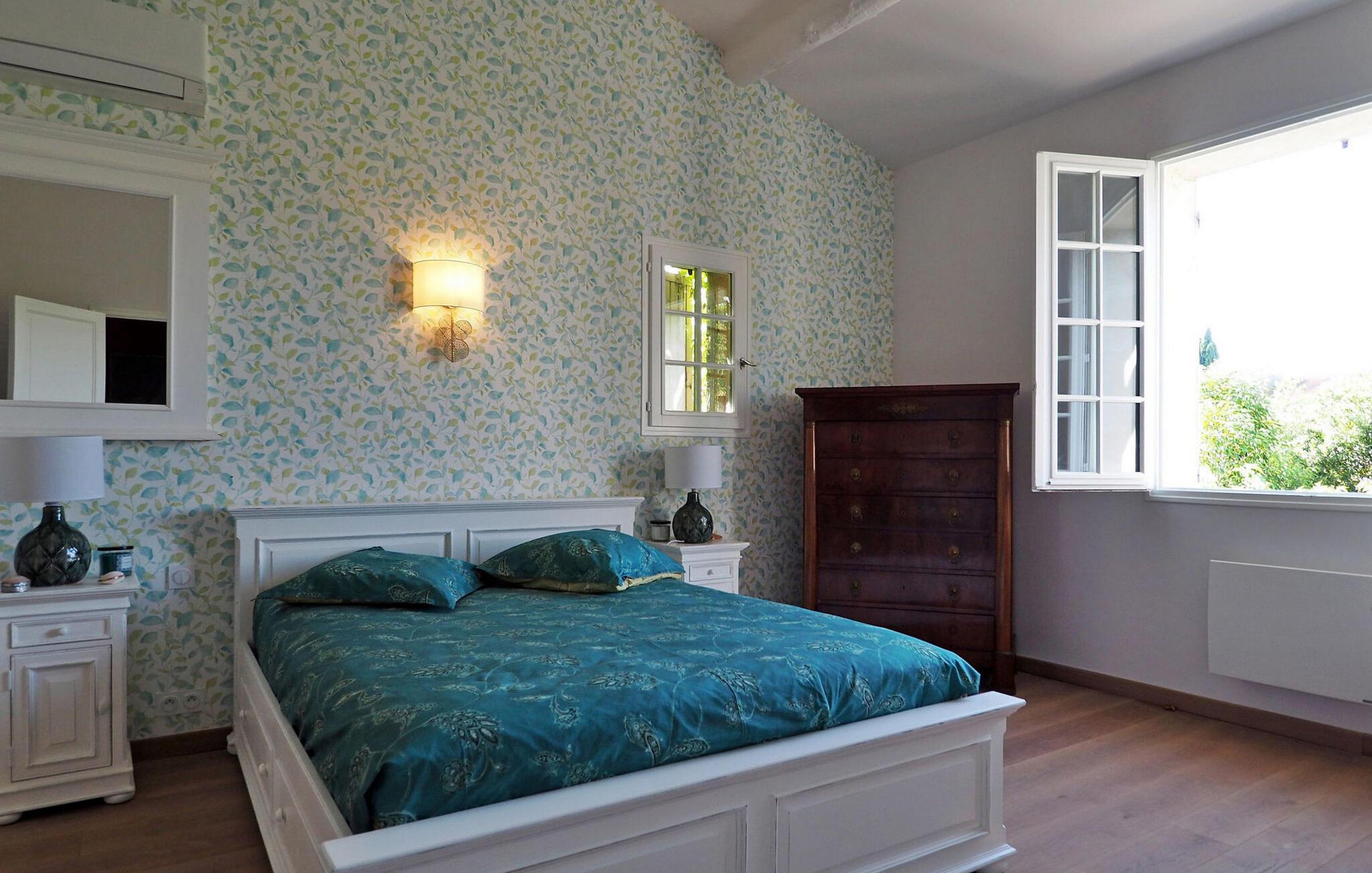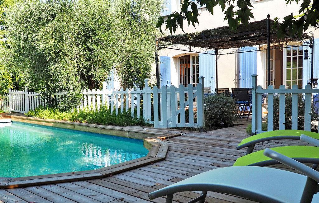 Oplev et charmerende feriested i Fontvieille, Provence. Beliggende i gåafstand fra landsbyens pulserende centrum, tilbyder denne hyggelige bolig værelser med aircondition for ultimativ komfort. Stueetagen har en rummelig opholdsstue med et veludstyret køkken, spiseplads, et hyggeligt opholdsområde med sofaer og et tv samt et praktisk vaskerum. Ovenpå kan du nyde komforten af smagfuldt indrettede soveværelser. Nyd den udendørs oase med en privat opvarmet swimmingpool, grill og pergola med siddepladser til dejlige al fresco spisning. Omfavn essensen af Provence i dette maleriske ferieparadis, perfekt til at skabe elskede minder. Fontvieilles centrum er tilgængeligt til fods fra villaen, hvor du finder mange butikker.