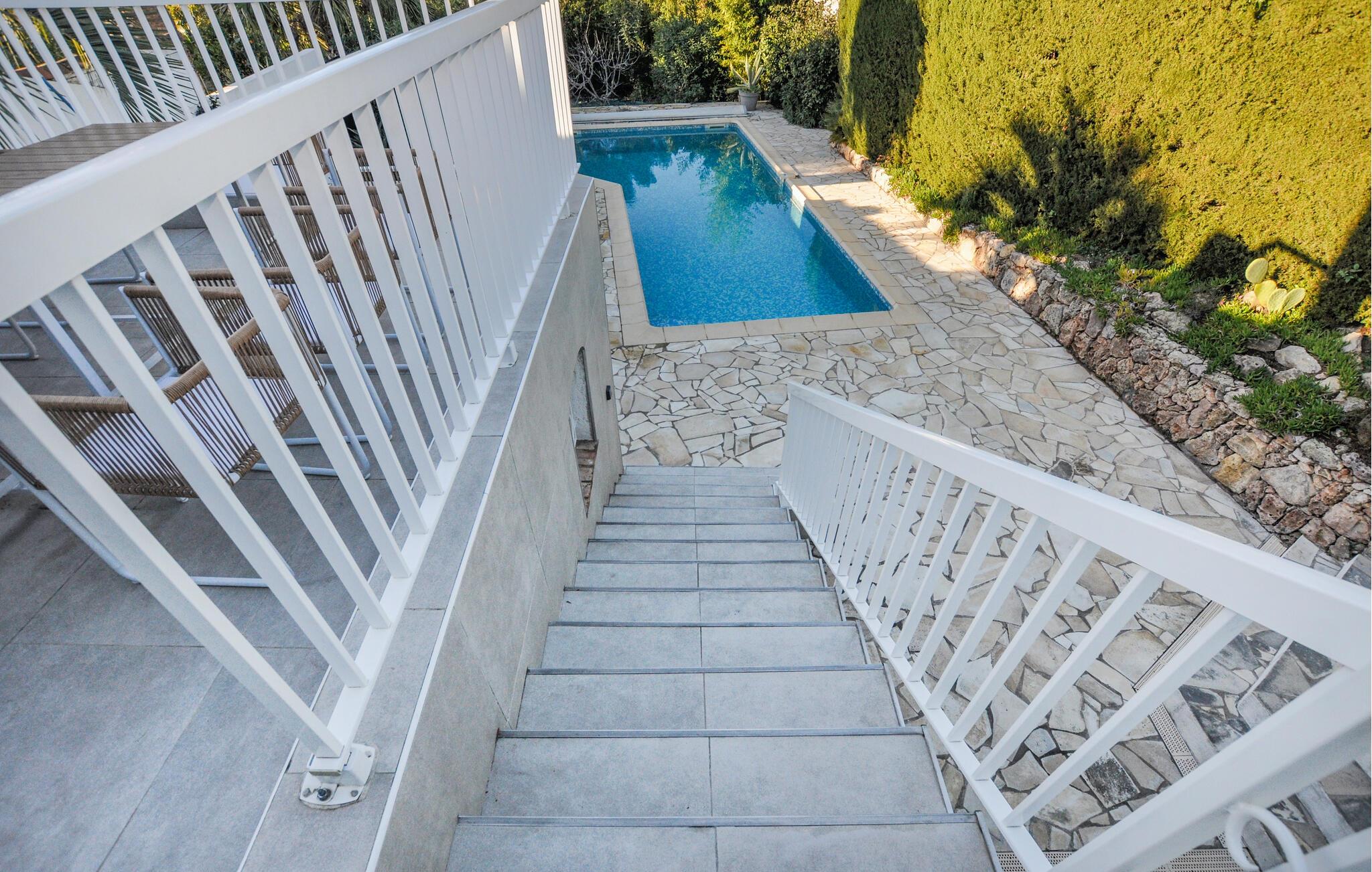 Om morgenen kan I gå ned af trappen og lade jer glide ned i poolen, hvor I kan tage et friskt dyp og soltørre i en liggestol. Om aftenen står den på lækre måltider fra grillen, mens I lægger planer for de kommende dage.