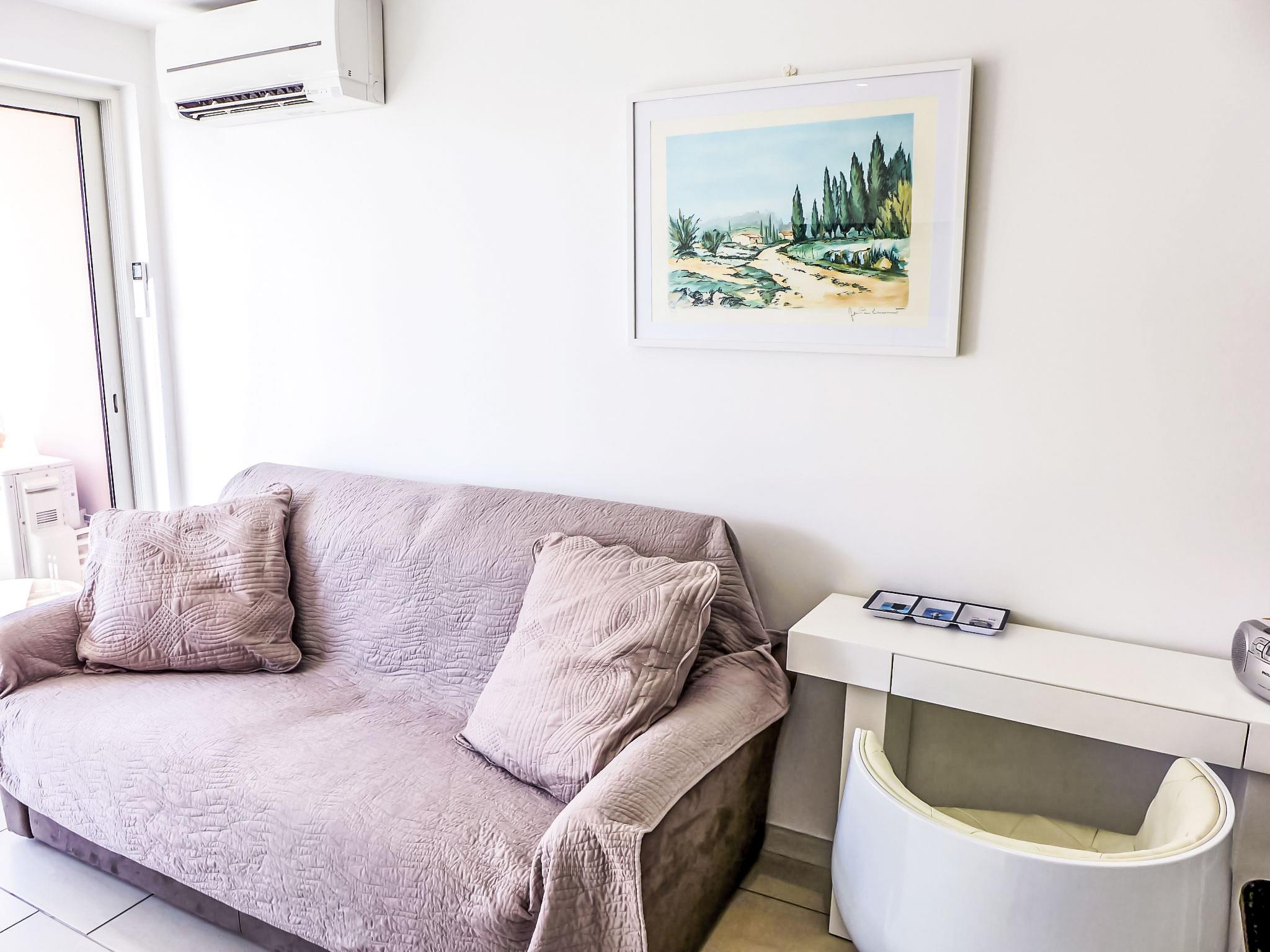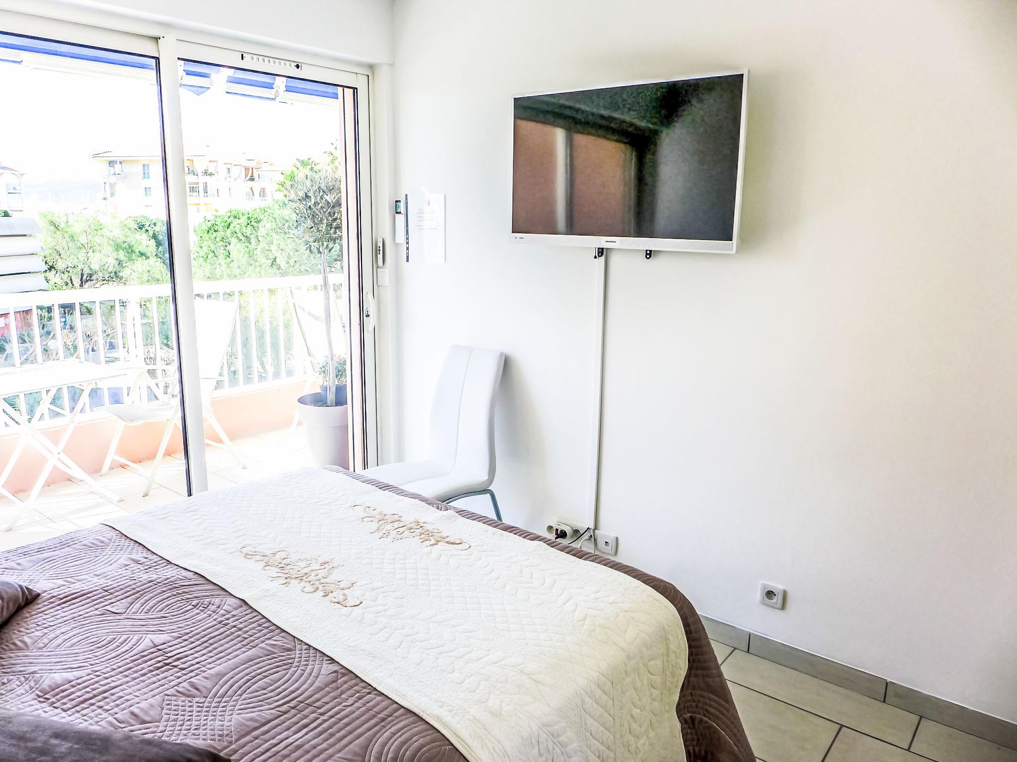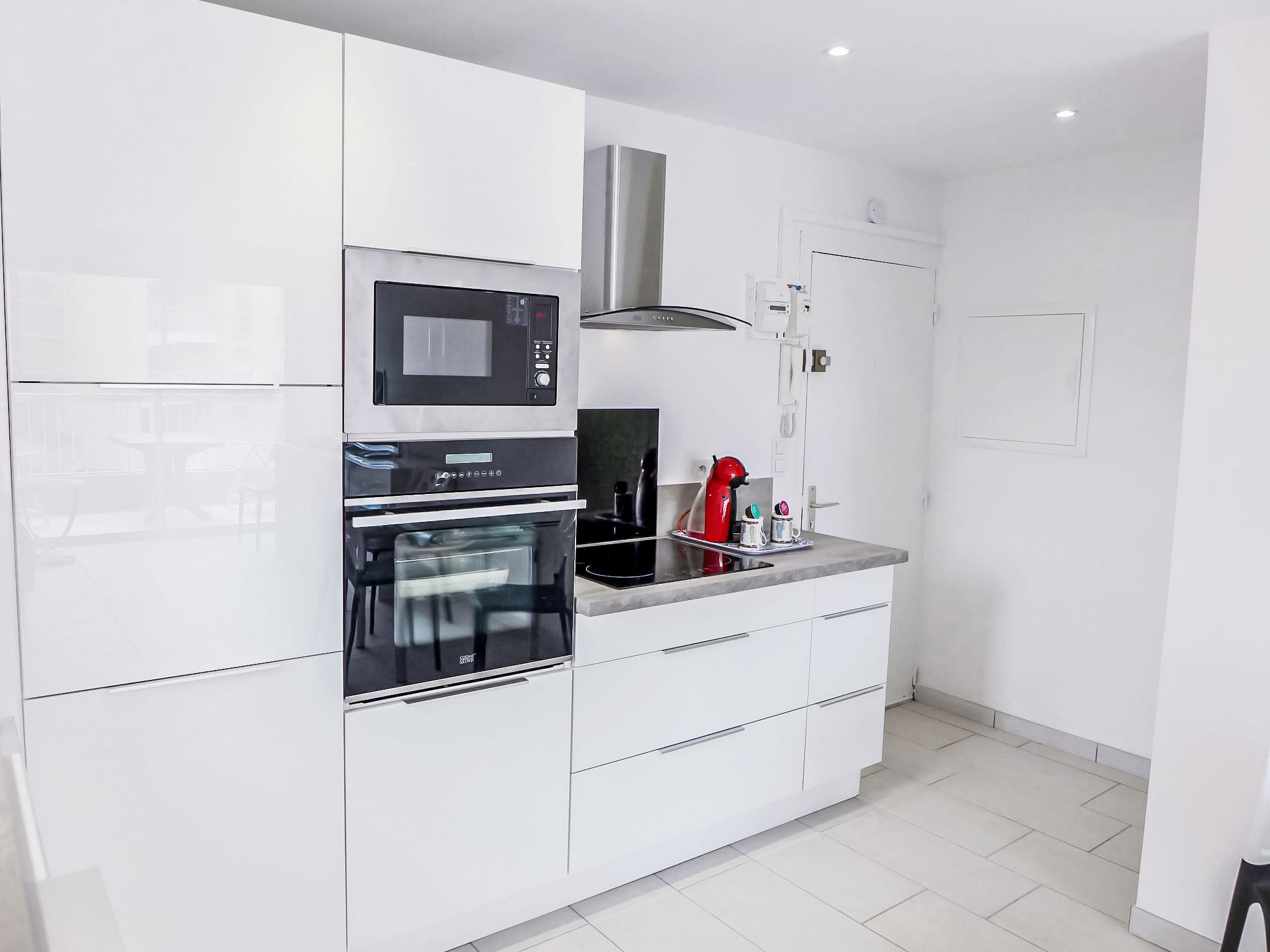 2-room apartment 36 m2 on 3rd floor. Fully renovated in 2017: living/dining room with 1 double sofabed (1 x 140 cm, length 190 cm), TV and air conditioning. Exit to the terrace. 1 room with 1 french bed (1 x 140 cm, length 190 cm), TV, electric heating and air conditioning. Exit to the terrace. Open kitchen (oven, dishwasher, 4 induction hot plates, toaster, kettle, microwave, freezer, electric coffee machine, Capsules for coffee machine (Dolce Gusto) extra). Shower/WC. Large terrace 9 m2. Terrace furniture. Side view of the sea. Facilities: washing machine, dryer, iron, hair dryer. Internet (WiFi, free). Parking space n 4 (extra, roofed), height 190 cm, width 240 cm. Please note: non-smokers only. Maximum 1 small pet/ dog allowed. TV only FR. Smoke alarm.