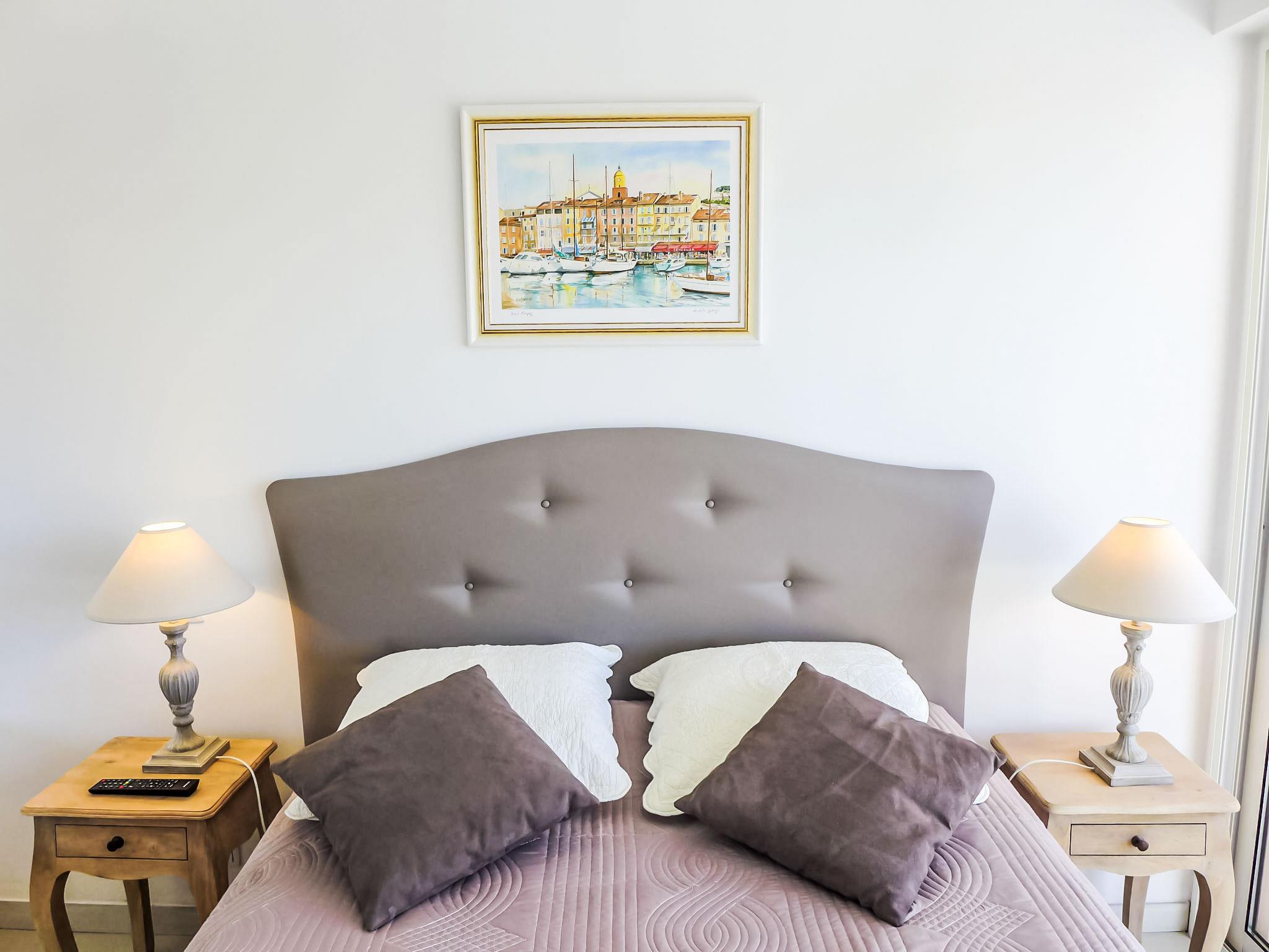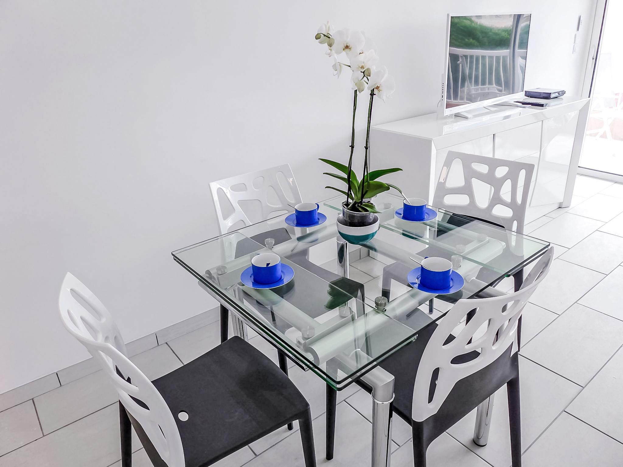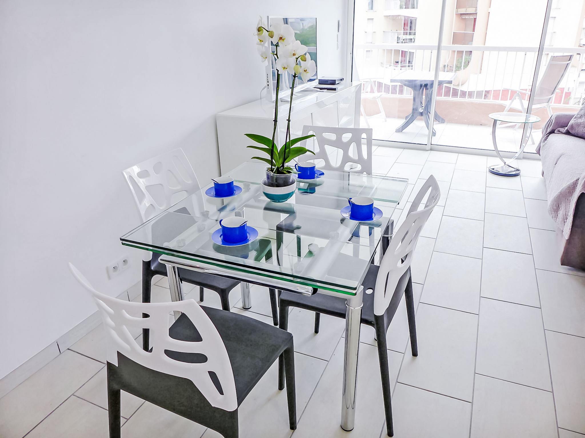 2-room apartment 36 m2 on 3rd floor. Fully renovated in 2017: living/dining room with 1 double sofabed (1 x 140 cm, length 190 cm), TV and air conditioning. Exit to the terrace. 1 room with 1 french bed (1 x 140 cm, length 190 cm), TV, electric heating and air conditioning. Exit to the terrace. Open kitchen (oven, dishwasher, 4 induction hot plates, toaster, kettle, microwave, freezer, electric coffee machine, Capsules for coffee machine (Dolce Gusto) extra). Shower/WC. Large terrace 9 m2. Terrace furniture. Side view of the sea. Facilities: washing machine, dryer, iron, hair dryer. Internet (WiFi, free). Parking space n 4 (extra, roofed), height 190 cm, width 240 cm. Please note: non-smokers only. Maximum 1 small pet/ dog allowed. TV only FR. Smoke alarm.
