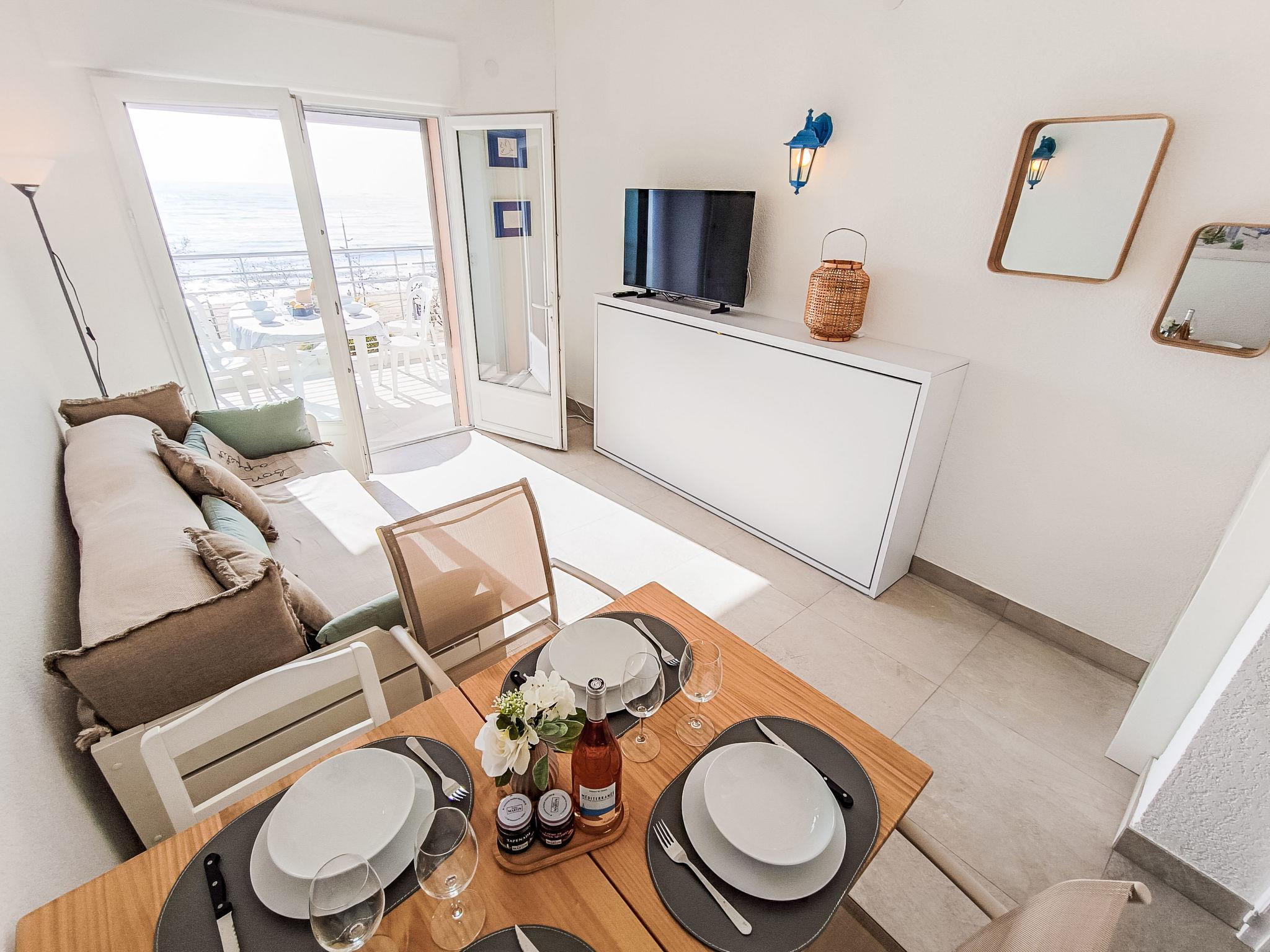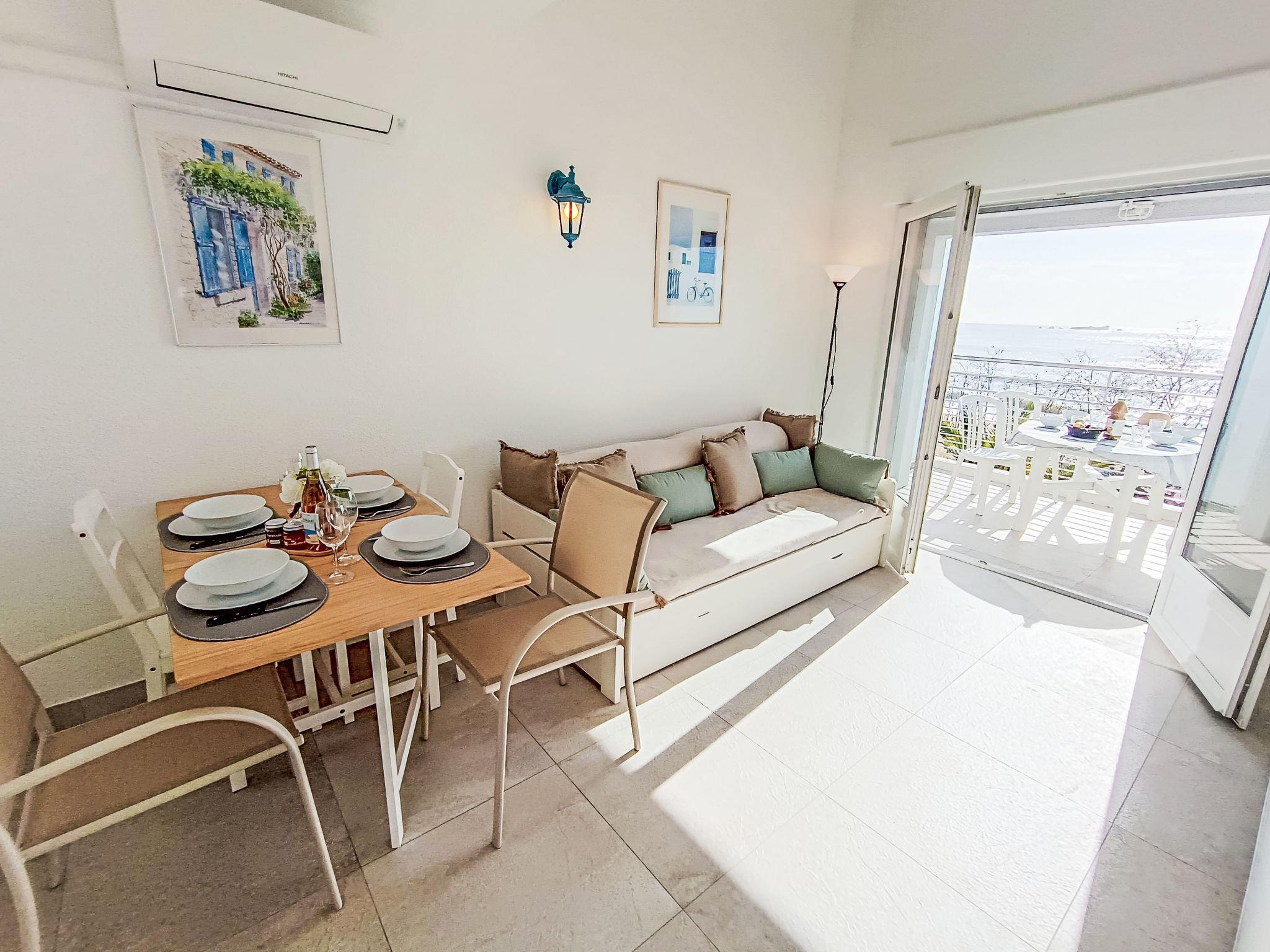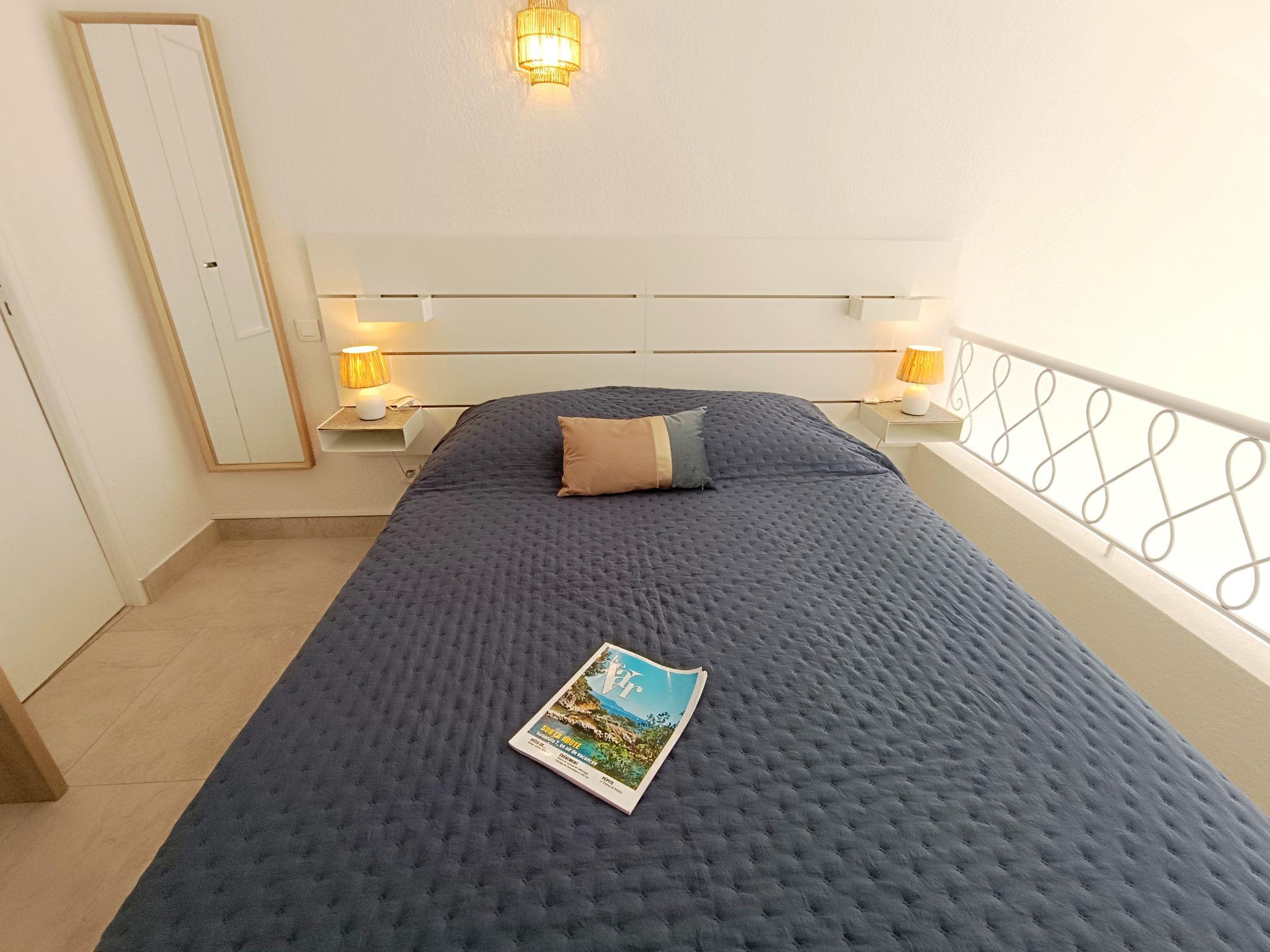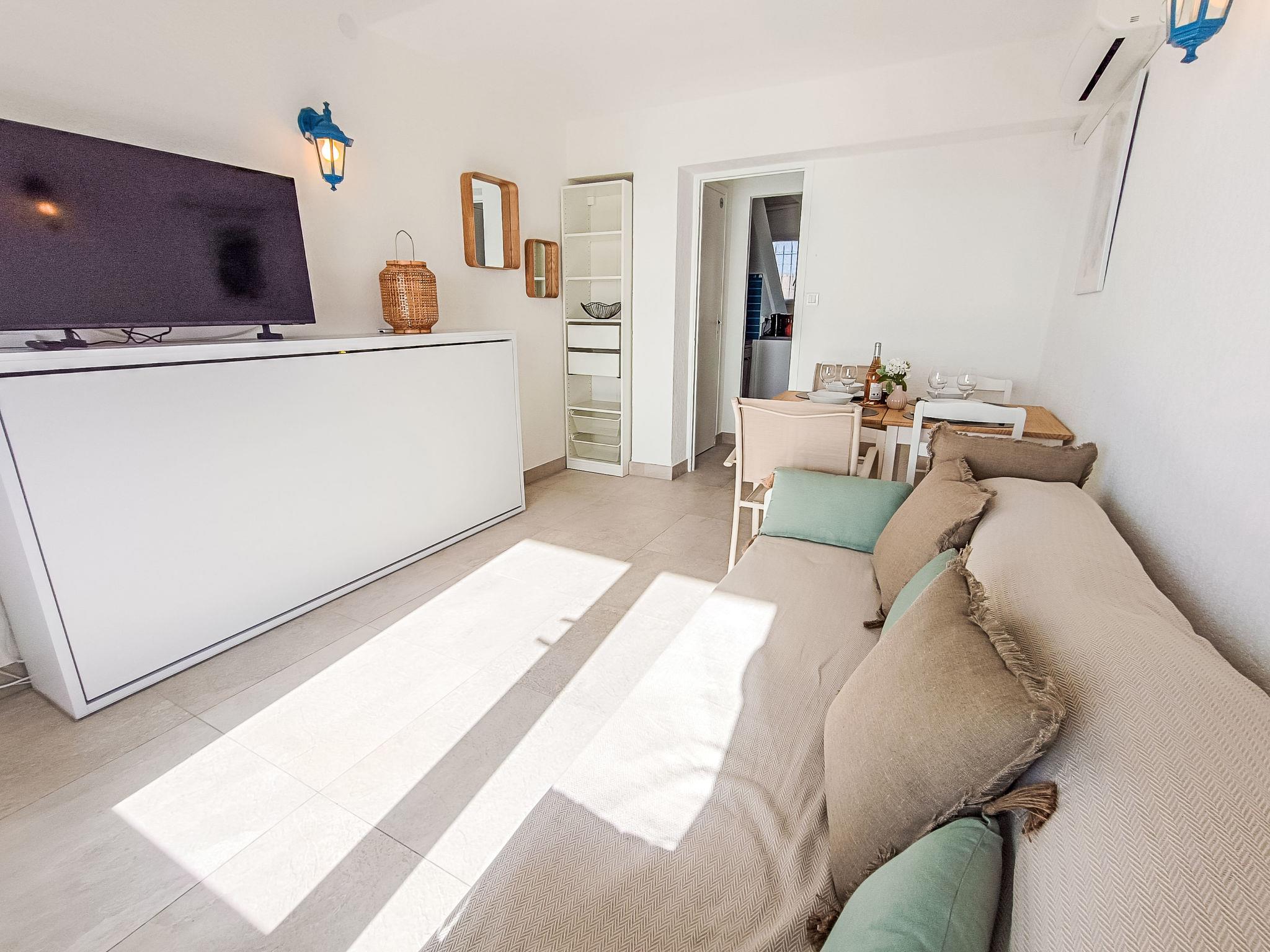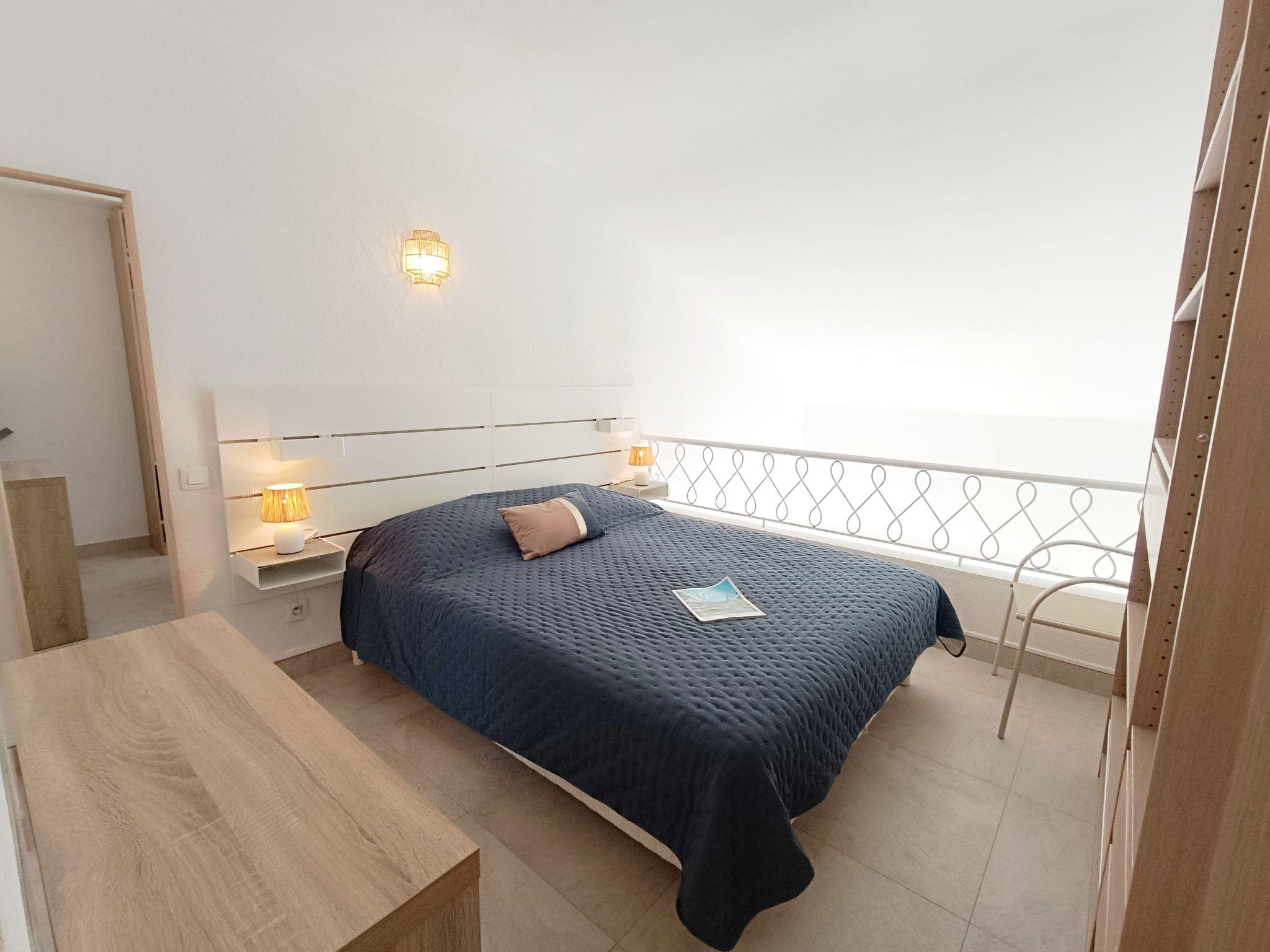 "Le domino", 2-room apartment 40 m2 on 2 levels on 3rd floor. Renovated in 2026: living/dining room with 1 pull-out bed (2 pers. 2 x 90 cm, length 200 cm), TV and air conditioning. Exit to the terrace. Open kitchen (oven, dishwasher, 3 induction hot plates, kettle, microwave, electric coffee machine). Upper floor: gallery with sloping ceilings with 1 double bed (160 cm, length 200 cm), air conditioning. Shower, sep. WC. Electric heating. Terrace 7 m2, south facing position and west facing position. Terrace furniture. Panoramic view of the sea. Facilities: washing machine, iron. Internet (WiFi, free). Garage (extra) at the house. Please note: smoke alarm. Offer by a private individual according to Art. 155, IV of CGI.