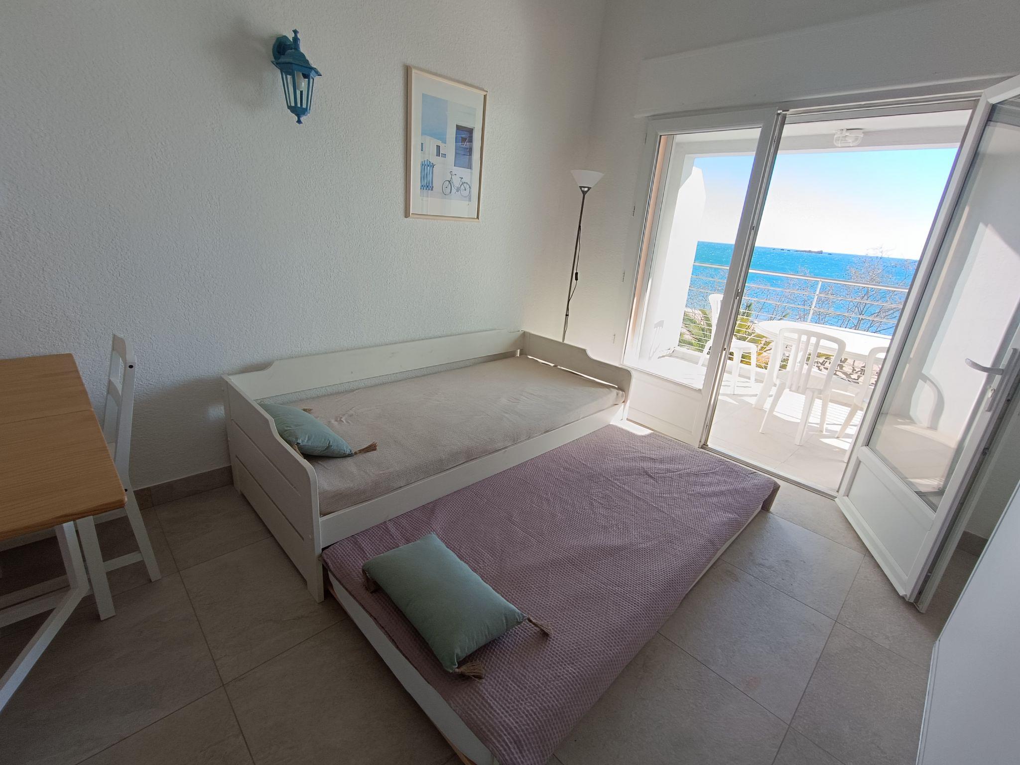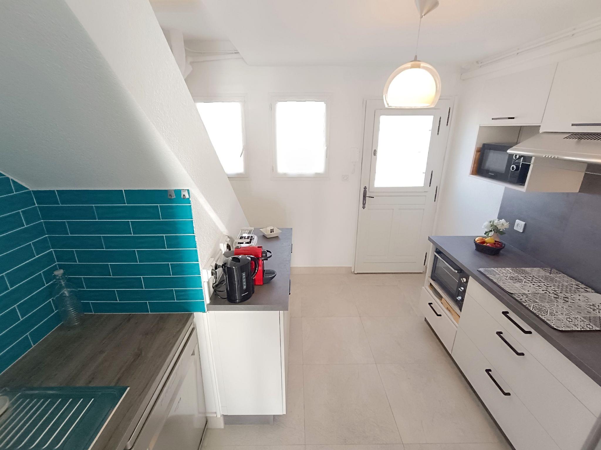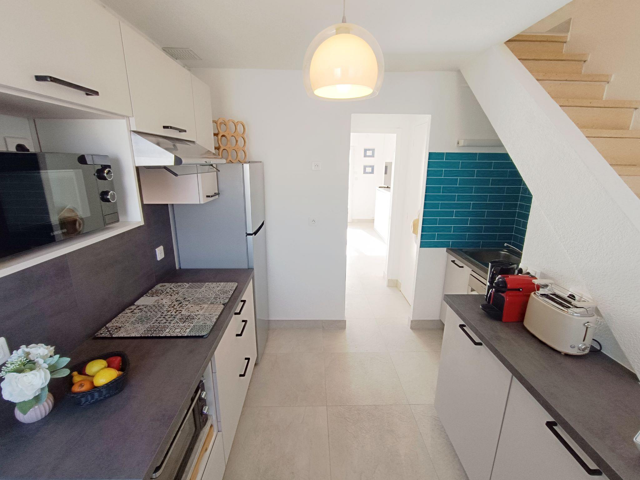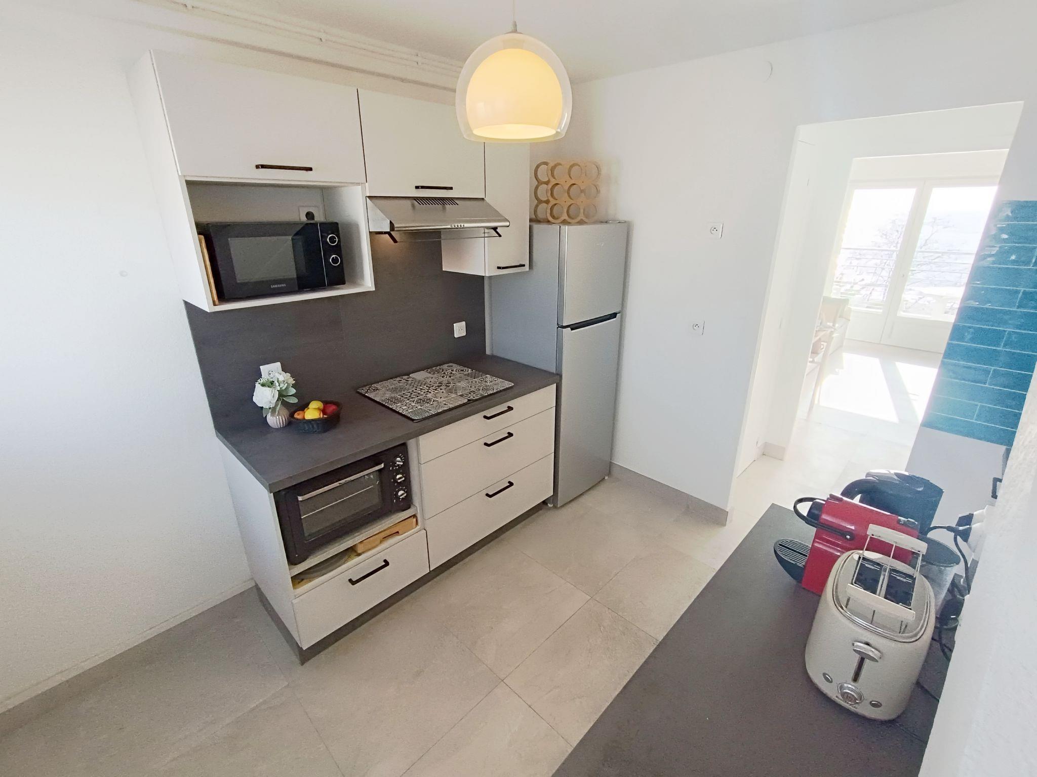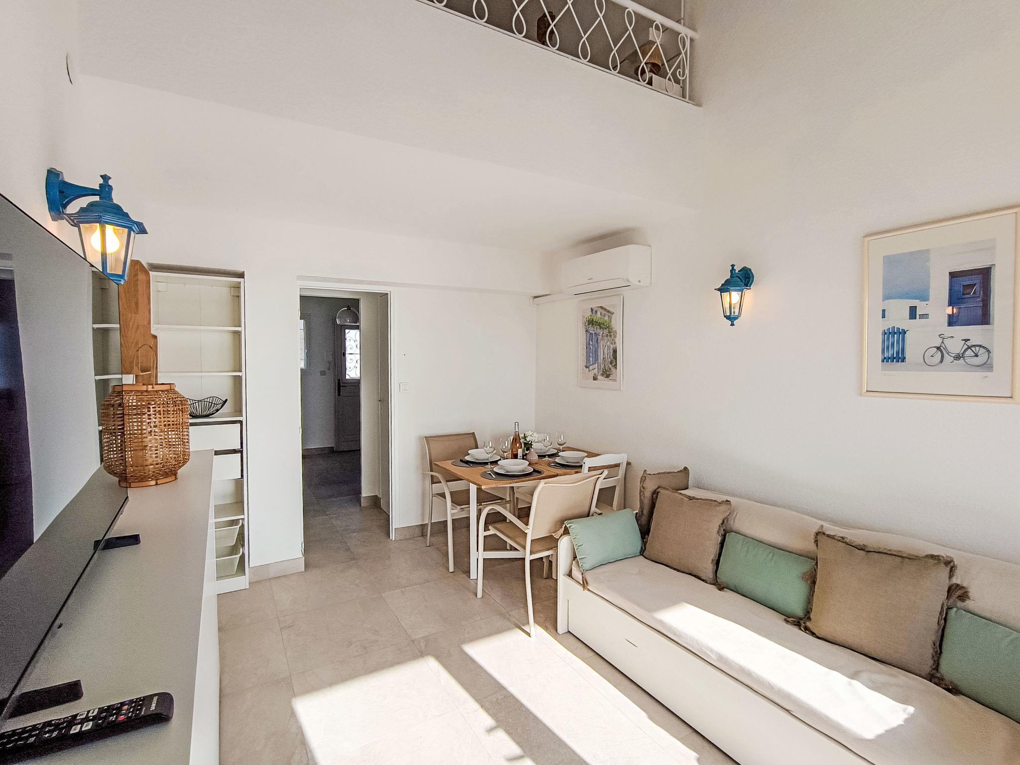 "Le domino", 2-room apartment 40 m2 on 2 levels on 3rd floor. Renovated in 2026: living/dining room with 1 pull-out bed (2 pers. 2 x 90 cm, length 200 cm), TV and air conditioning. Exit to the terrace. Open kitchen (oven, dishwasher, 3 induction hot plates, kettle, microwave, electric coffee machine). Upper floor: gallery with sloping ceilings with 1 double bed (160 cm, length 200 cm), air conditioning. Shower, sep. WC. Electric heating. Terrace 7 m2, south facing position and west facing position. Terrace furniture. Panoramic view of the sea. Facilities: washing machine, iron. Internet (WiFi, free). Garage (extra) at the house. Please note: smoke alarm. Offer by a private individual according to Art. 155, IV of CGI.