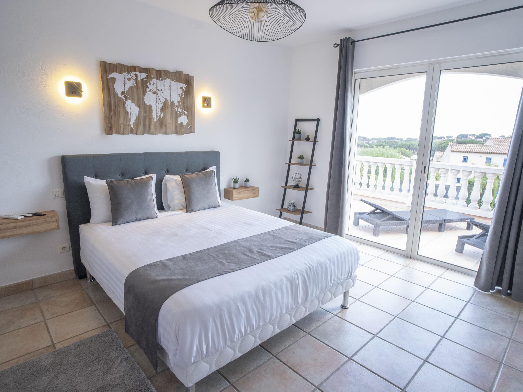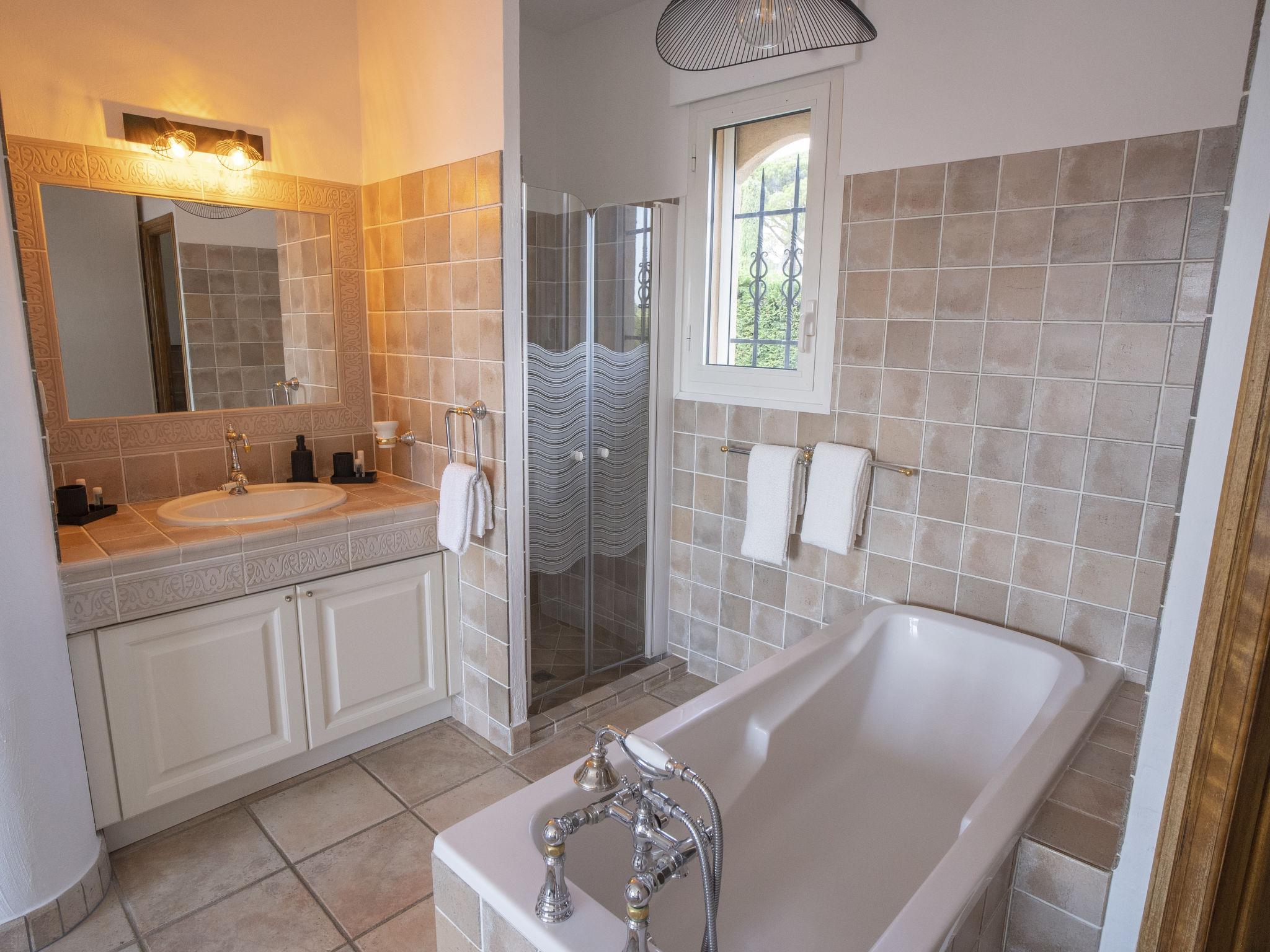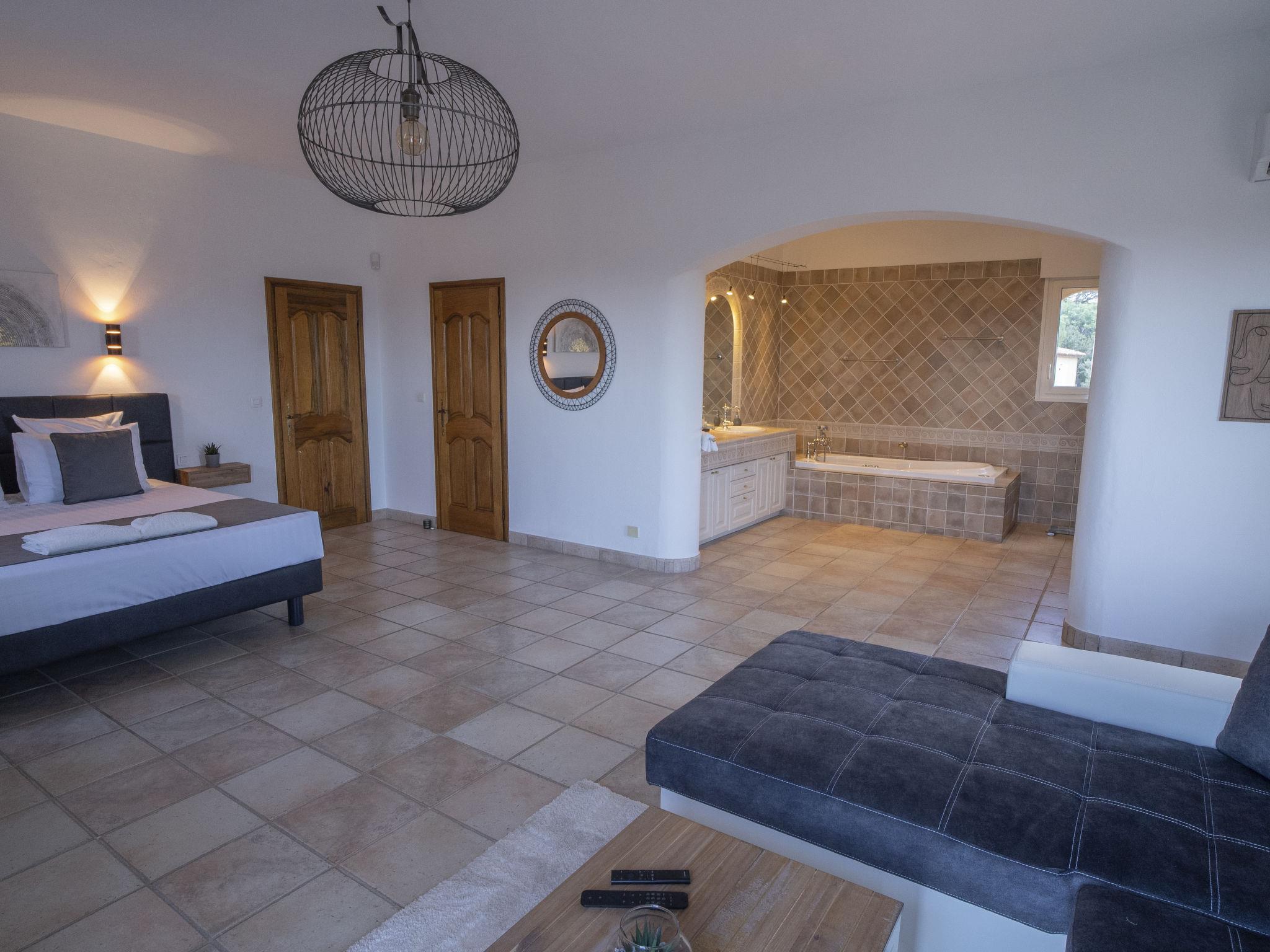 After sunset, the view over the town of Fréjus can be enjoyed with a glass of champagne on the south-facing terrace or on the terrace in the suite on the top floor. The villa has 4 bedrooms: 1 suite on the top floor, 2 bedrooms on the middle floor and a separate studio overlooking the pool at the bottom of the building. There are 6 bathrooms with showers and bathtubs, as well as a whirlpool. On colder evenings, there is a fireplace in the large lounge for cosy hours or an evening of television. The villa also offers a fully equipped kitchen on the ground floor, with a large American food centre, oven, dishwasher, Nespresso coffee machine and all the utensils you need to prepare a delicious meal. Right next to it is the dining room with a large dining table, the guest toilet and the utility room, where you will find an additional freezer, washing machine, hoover and all the necessary cleaning utensils. The entire house is equipped with air conditioning, and the bedrooms also have air conditioning, televisions and built-in wardrobes. The beds are made up with the finest hotel bed linen and there are plenty of shower, hand and washing towels available for every guest. Shower gel, shampoo and body lotion are also provided in the bathrooms. A hairdryer is also available if required. You can also enjoy a bath in the whirlpool in the suite on the top floor. The 2 bedrooms on the ground floor are separated from the rest of the living area by a door to ensure a peaceful night's sleep. The sleeping area in the studio by the swimming pool has its own separate access. All bedrooms have direct access to the large terrace and WLAN. The property is fully video-monitored, but the cameras are switched off when the property is rented out, which is contractually guaranteed.
