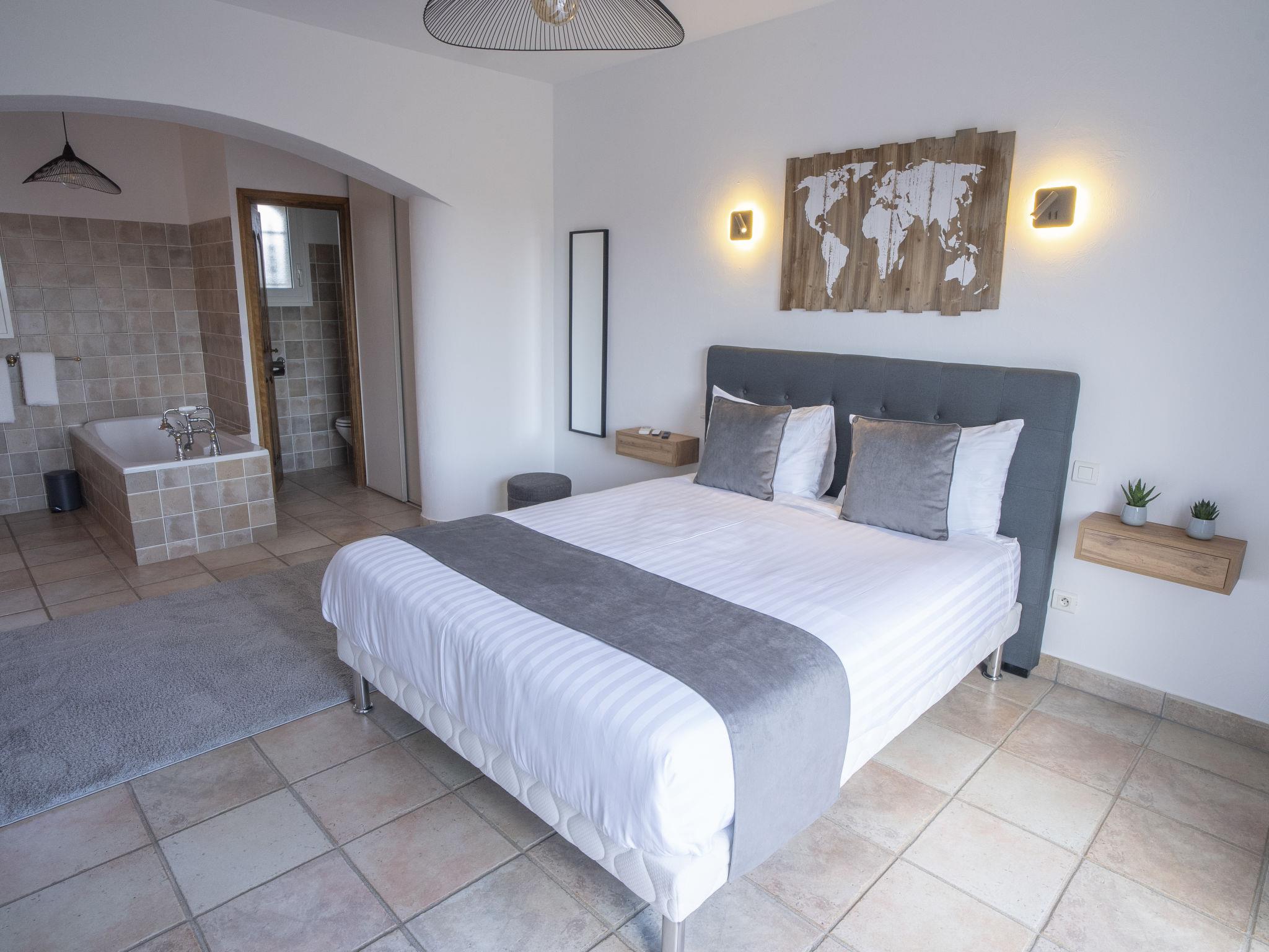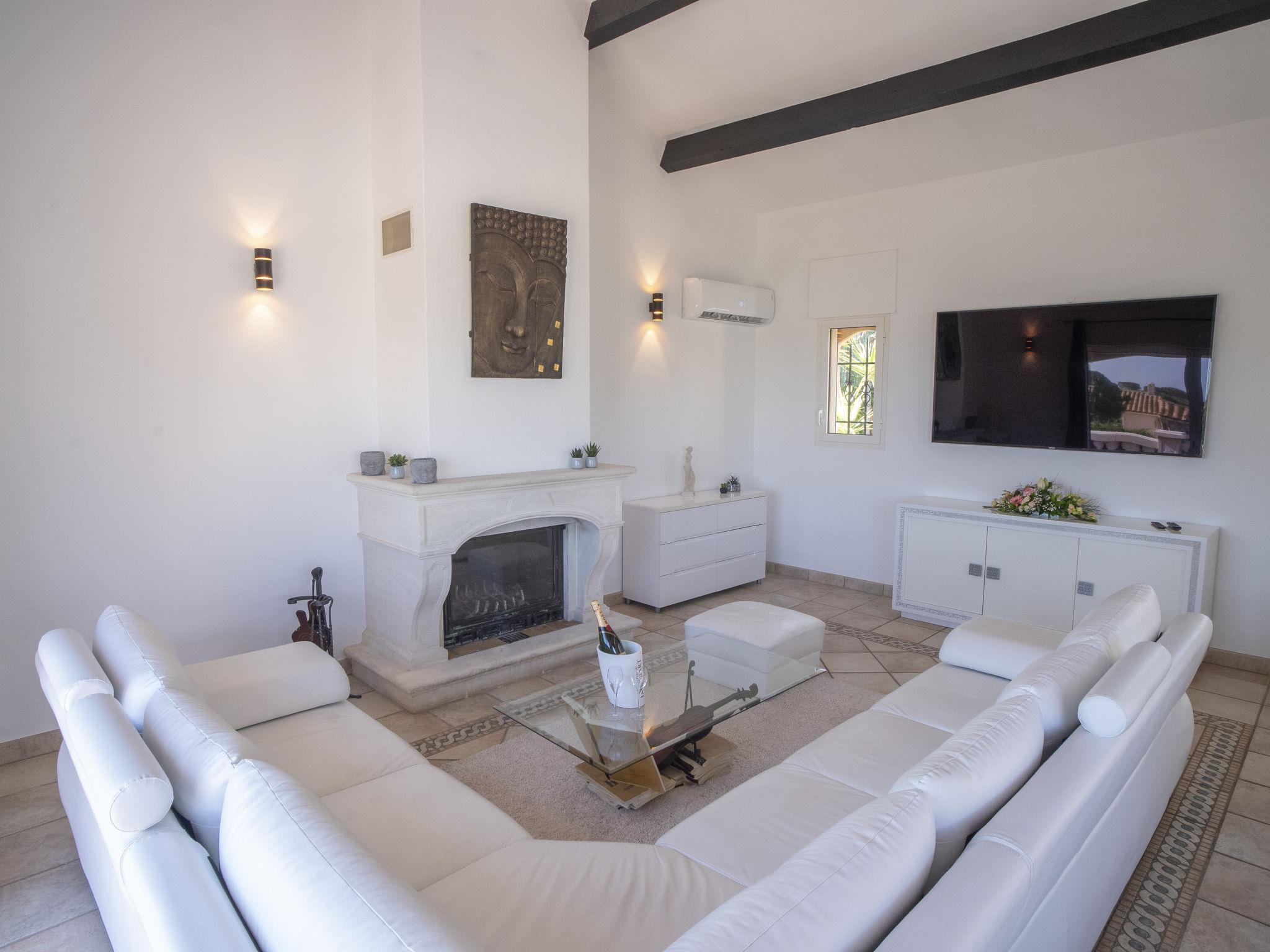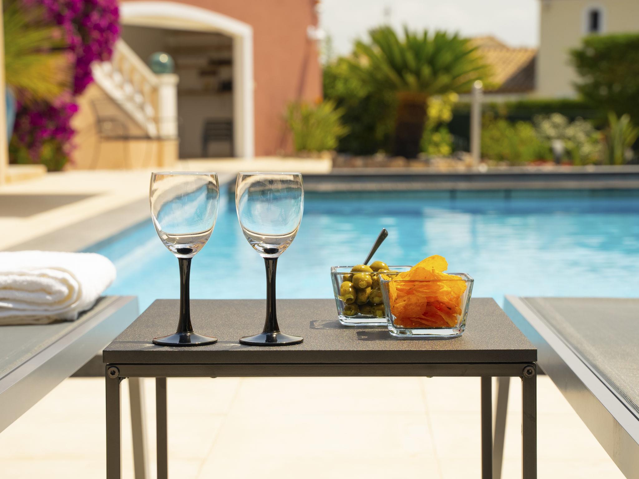 After sunset, the view over the town of Fréjus can be enjoyed with a glass of champagne on the south-facing terrace or on the terrace in the suite on the top floor. The villa has 4 bedrooms: 1 suite on the top floor, 2 bedrooms on the middle floor and a separate studio overlooking the pool at the bottom of the building. There are 6 bathrooms with showers and bathtubs, as well as a whirlpool. On colder evenings, there is a fireplace in the large lounge for cosy hours or an evening of television. The villa also offers a fully equipped kitchen on the ground floor, with a large American food centre, oven, dishwasher, Nespresso coffee machine and all the utensils you need to prepare a delicious meal. Right next to it is the dining room with a large dining table, the guest toilet and the utility room, where you will find an additional freezer, washing machine, hoover and all the necessary cleaning utensils. The entire house is equipped with air conditioning, and the bedrooms also have air conditioning, televisions and built-in wardrobes. The beds are made up with the finest hotel bed linen and there are plenty of shower, hand and washing towels available for every guest. Shower gel, shampoo and body lotion are also provided in the bathrooms. A hairdryer is also available if required. You can also enjoy a bath in the whirlpool in the suite on the top floor. The 2 bedrooms on the ground floor are separated from the rest of the living area by a door to ensure a peaceful night's sleep. The sleeping area in the studio by the swimming pool has its own separate access. All bedrooms have direct access to the large terrace and WLAN. The property is fully video-monitored, but the cameras are switched off when the property is rented out, which is contractually guaranteed.