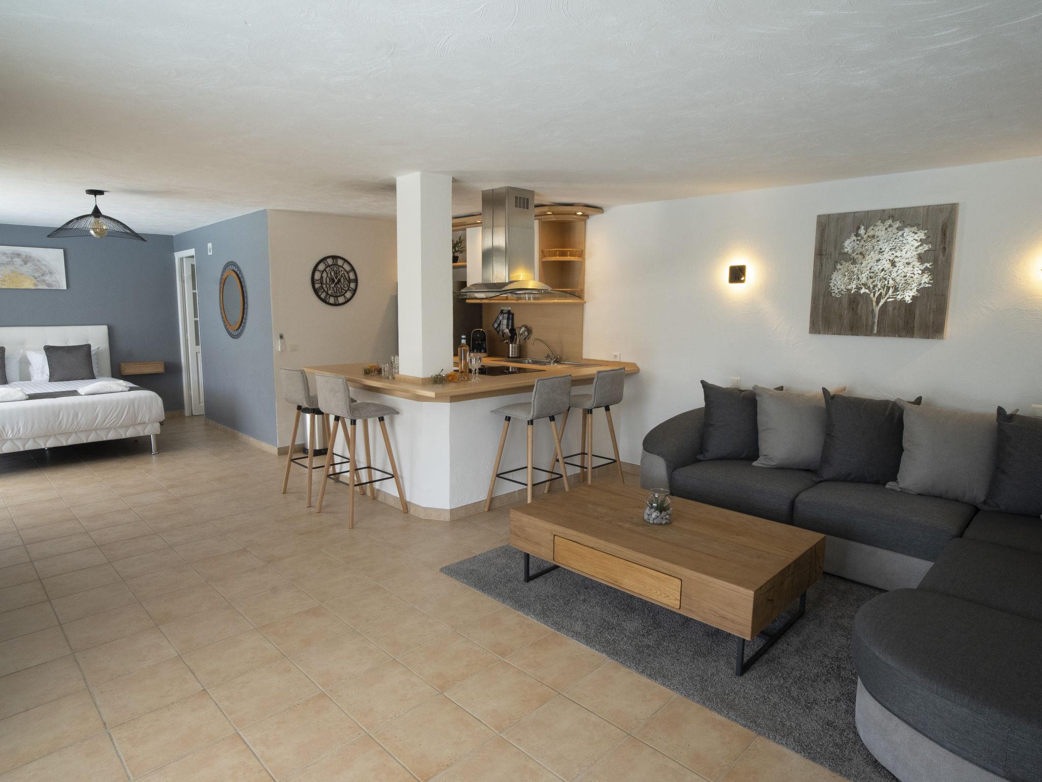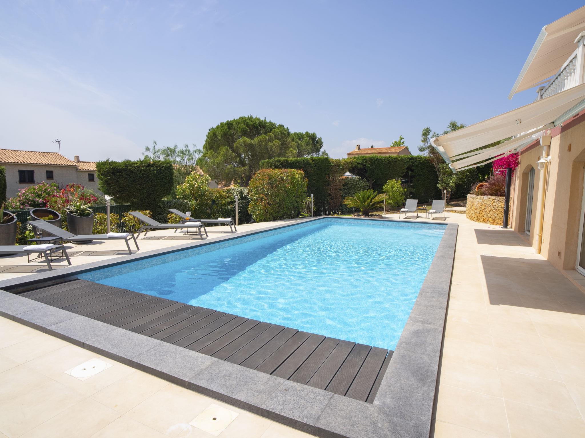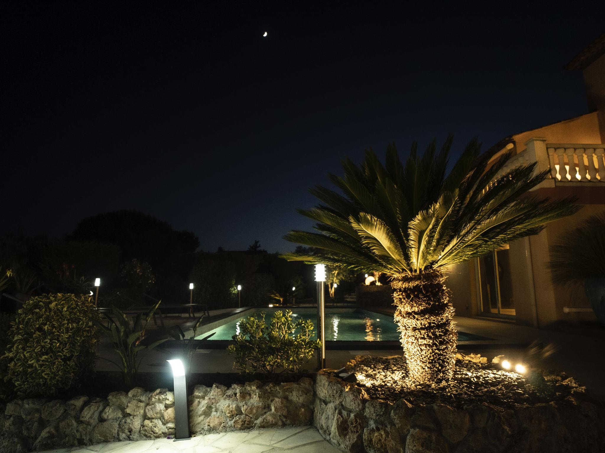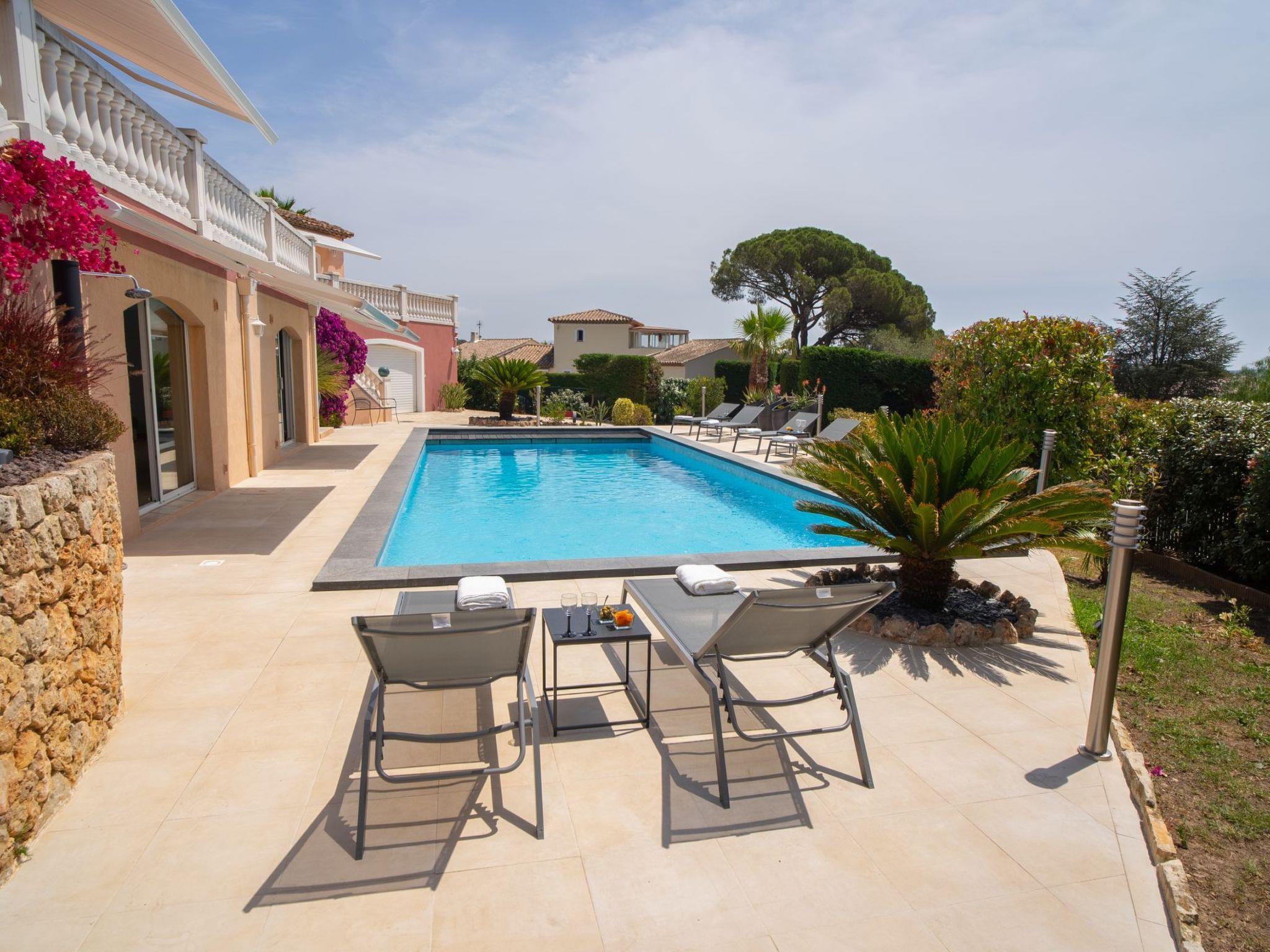 The fully fenced villa, with 3 parking spaces on the property and 2 parking spaces next to the villa, is located above Fréjus overlooking the sea and is surrounded by many palm trees and tropical plants, making Villa Riposa the perfect relaxation paradise. The villa is characterised by its very large pool (15mx5m), which allows guests to start their day with a morning swim and relax all day on one of the 12 sun loungers. The pool area also has a shower room right by the pool, which has a shower and WC. There is also an outdoor shower with hot water right by the pool. There are plenty of places to stay to escape the Mediterranean sun. At the rear of the house, guests can gather around a garden table with a large barbecue grill and enjoy relaxed barbecue evenings.
