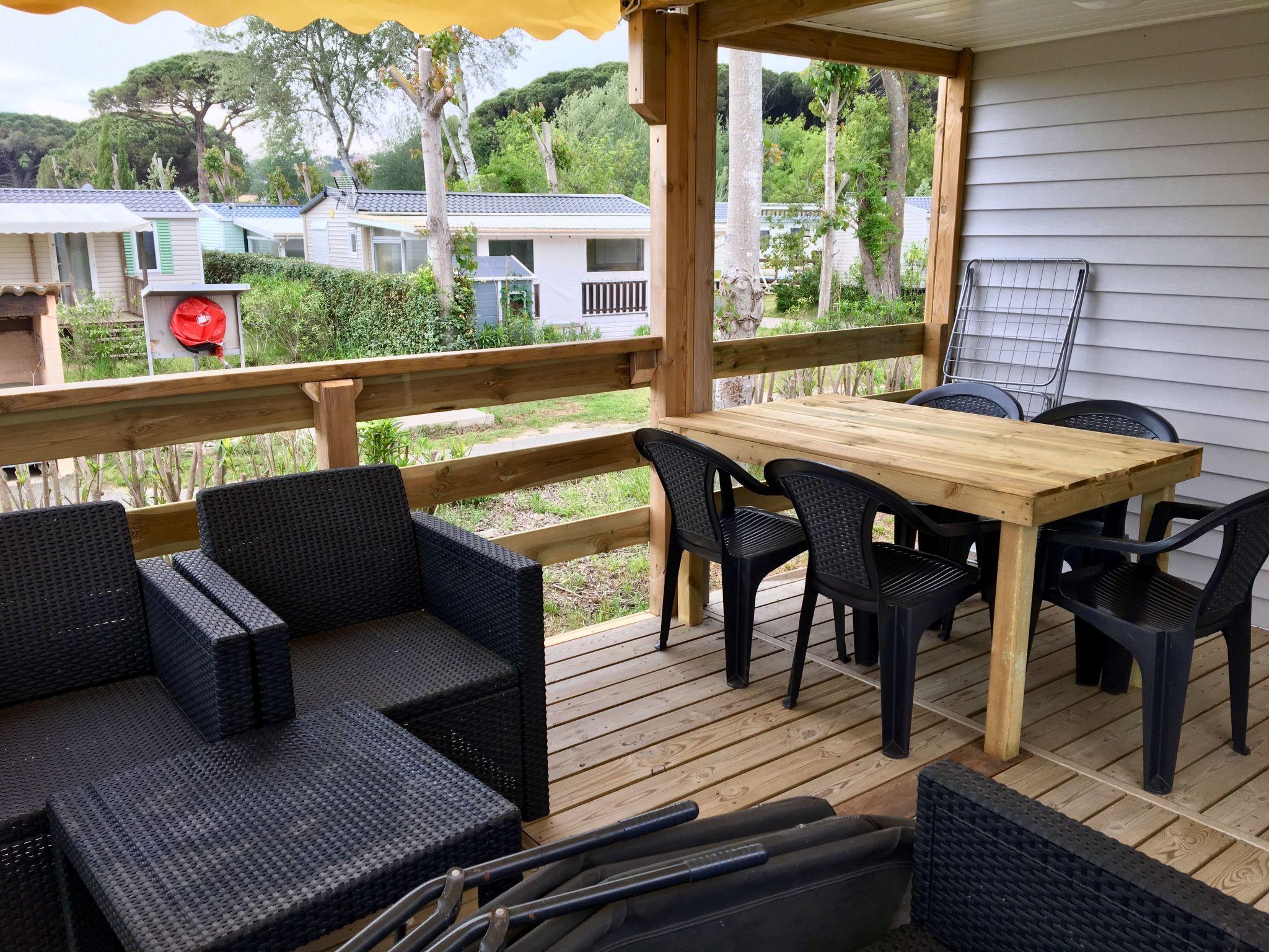 All mobile homes are fully equipped for 5 persons and include duvets (all 1-person), pillows, kitchen inventory, standard coffee machine, kettle, microwave and air conditioning (at extra cost). In terms of outdoor furniture, there is a table, chairs, a lounge set and two sun chairs.