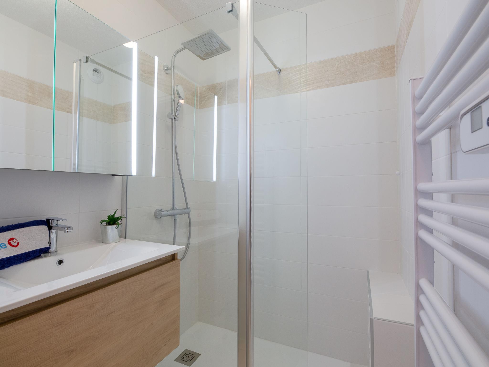 2-room apartment 35 m2 on 3rd floor. Practical furnishings: living/dining room with 1 double sofabed (1 x 130 cm, length 190 cm), TV and air conditioning. Exit to the terrace. 1 room with 1 french bed (1 x 140 cm, length 190 cm). Exit to the terrace. Open kitchen (dishwasher, 4 ceramic glass hob hotplates, toaster, kettle, freezer, electric coffee machine, combination microwave). Bathroom, sep. WC. Electric heating. Small terrace. Balcony furniture. View of the swimming pool. Facilities: washing machine, iron. Internet (WiFi, extra). Parking space n 6042 (roofed), height 180 cm, width 230 cm. Please note: non-smokers only. Smoke alarm. FR8509.800.2