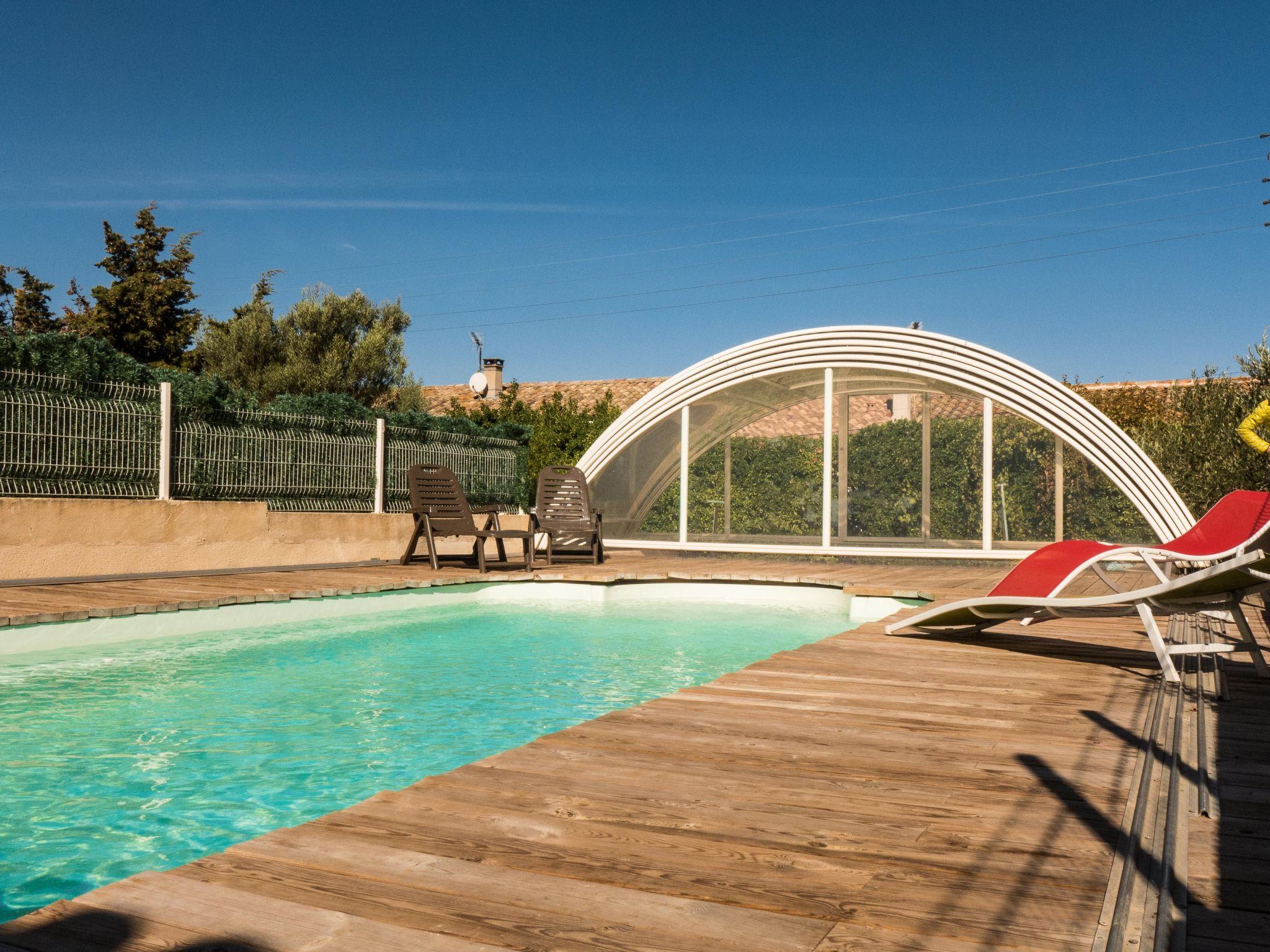 The cottage has just been completely renovated and decorated with great taste. The materials are noble and warm colors, stone and wood are featured. It opens onto a private terrace and a green area of over 2,000 m². This swimming pool, open for swimming between mid-April and the end of October, is covered approximately from mid-September to mid-June. The cottage of 110 m² is very comfortable for 6 people. At ground floor: spacious living room of 50 m² with lounge and dining room, 1 large kitchen, 1 queensize bedroom and its private shower room, 1 separate toilet. Access to the floor by a passage with 1 beam at 1.70 m, 2 twin bedrooms, 1 bathroom and 1 independent toilet. Safe code to enter the house. Views on corbières. Sorry no pets.