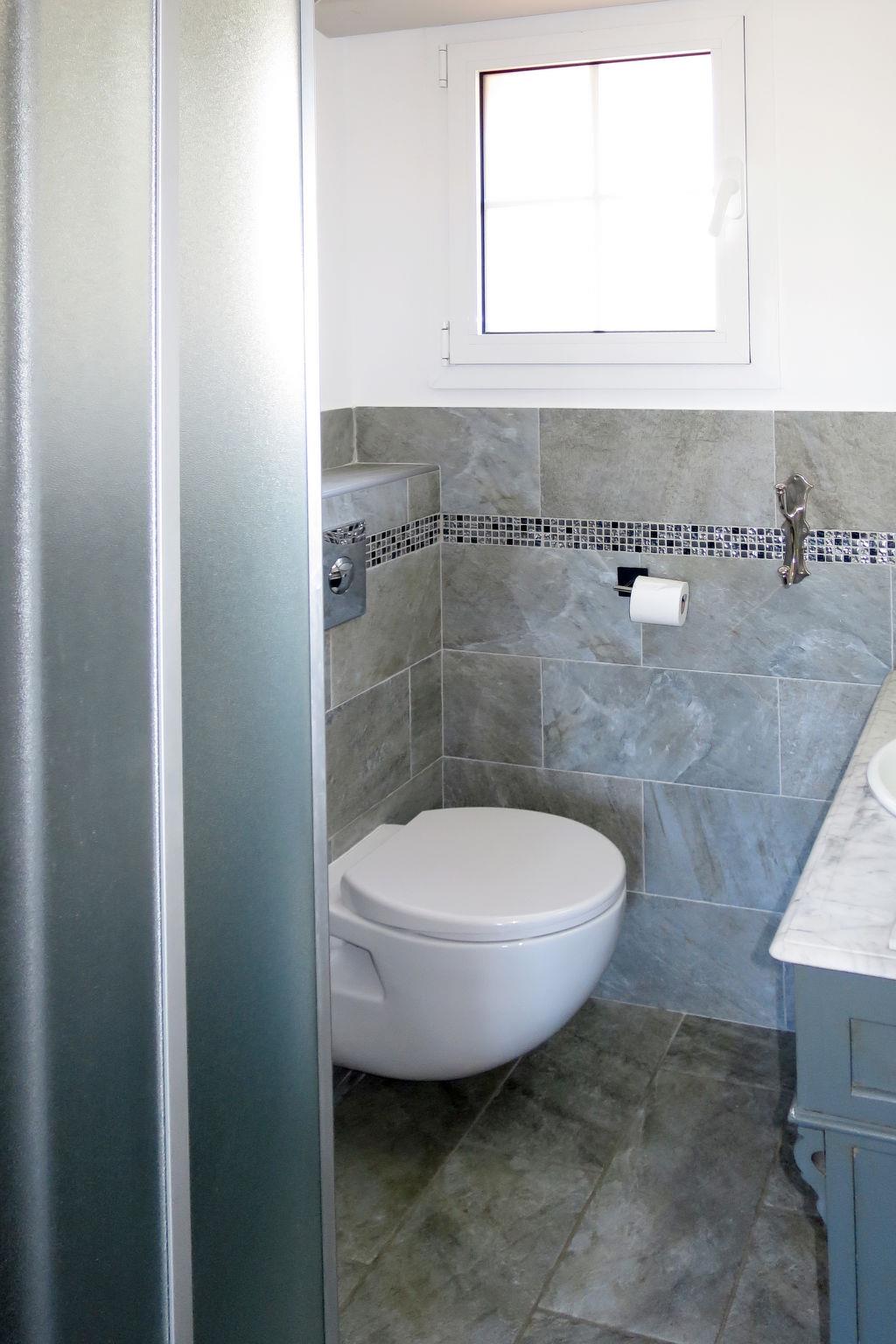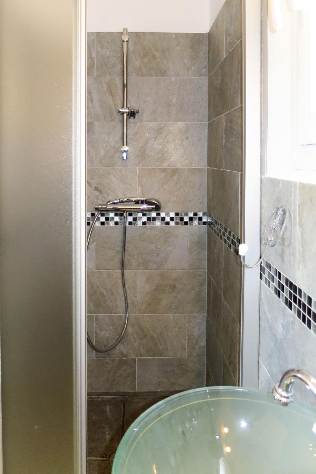 "Primavera", 3-room terraced house 60 m2 on 2 levels. Antique and stylish furnishings: living/sleeping room with 1 sofabed (90 cm), dining table and satellite TV. Exit to the terrace. Open kitchen (oven, dishwasher, 3 ceramic glass hob hotplates, toaster, kettle, microwave, freezer, electric coffee machine). Shower/WC. Upper floor: 2 rooms, each room with 1 double bed (160 cm), shower/WC. Electric heating, air-conditioning. Terrace partly roofed. Terrace furniture. Facilities: Internet (WiFi, free). Please note: not suitable for children under 4 years. Non-smokers only. Smoke alarm. Offer by a commercial proprietor according to Art. 155, IV, CGI