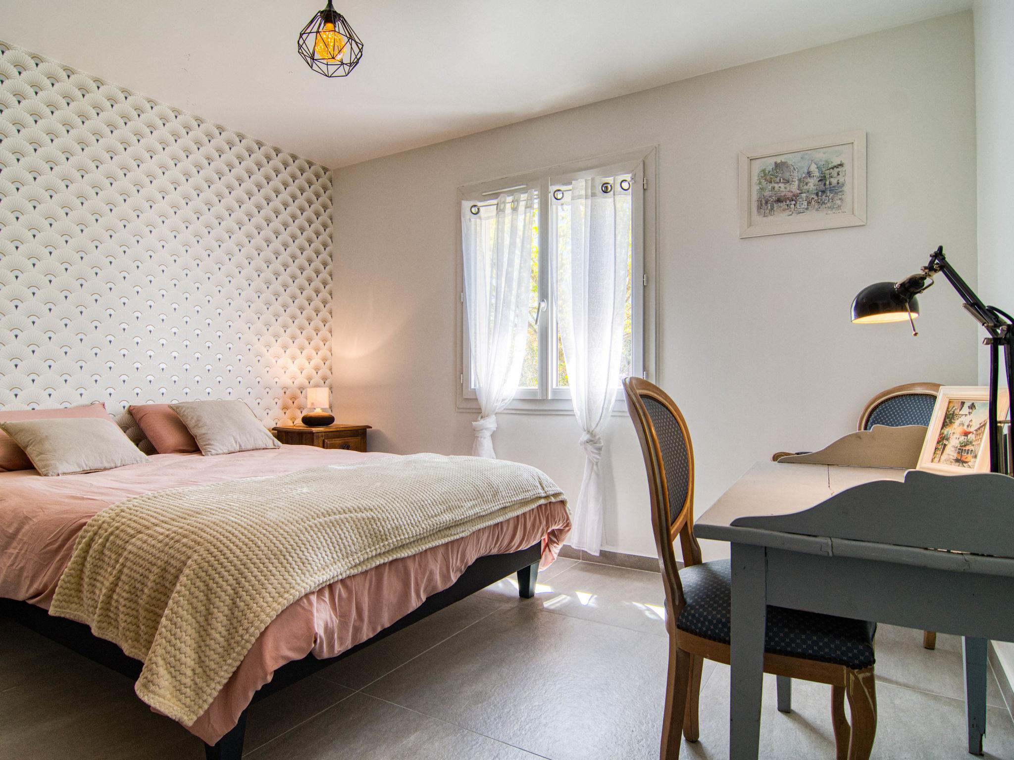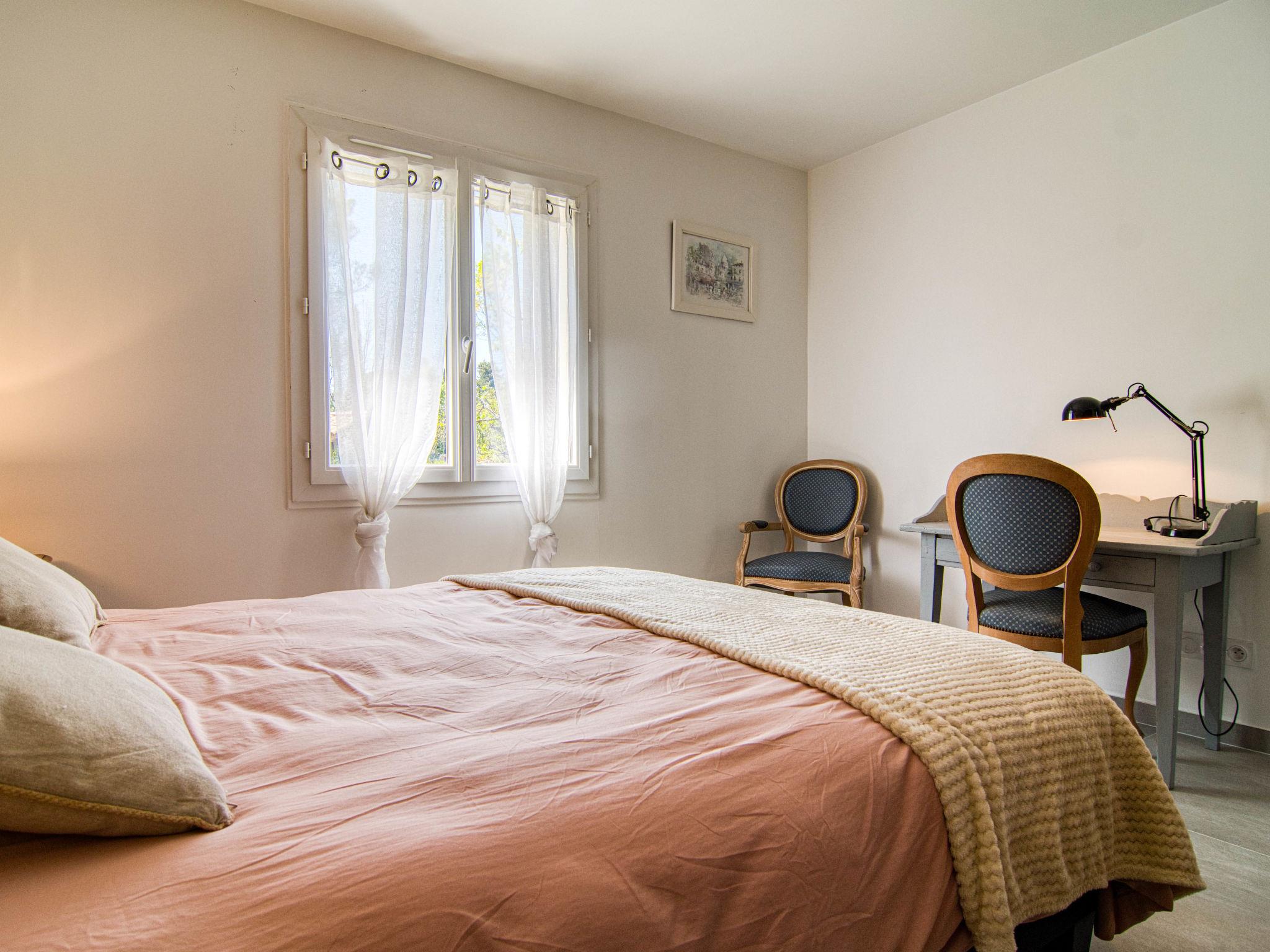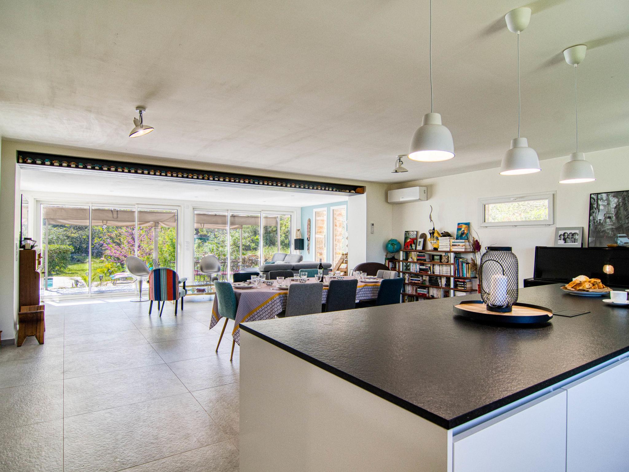 "Villa Azurine", 4-room villa 145 m2. Comfortable and beautiful furnishings: large living/dining room with open-hearth fireplace (only for decoration), dining table and TV (flat screen), air conditioning. Exit to the terrace. Open office with 1 double sofabed (140 cm, length 190 cm), air conditioning. 1 room with 1 french bed (160 cm, length 200 cm), shower. 1 room with 1 french bed (160 cm, length 190 cm). 1 room with 2 beds (90 cm, length 200 cm). Kitchenette (oven, dishwasher, 4 ceramic glass hob hotplates, toaster, kettle, microwave, electric coffee machine, cooking island). Bath/WC, sep. WC. Terrace furniture, barbecue, deck chairs (4). Facilities: washing machine, baby cot for up to 3 year olds. Internet (WiFi, free). Please note: suitable for families. Non-smoking house. Smoke alarm. Offer by a private individual according to Art. 155, IV of CGI. 83064000078AF