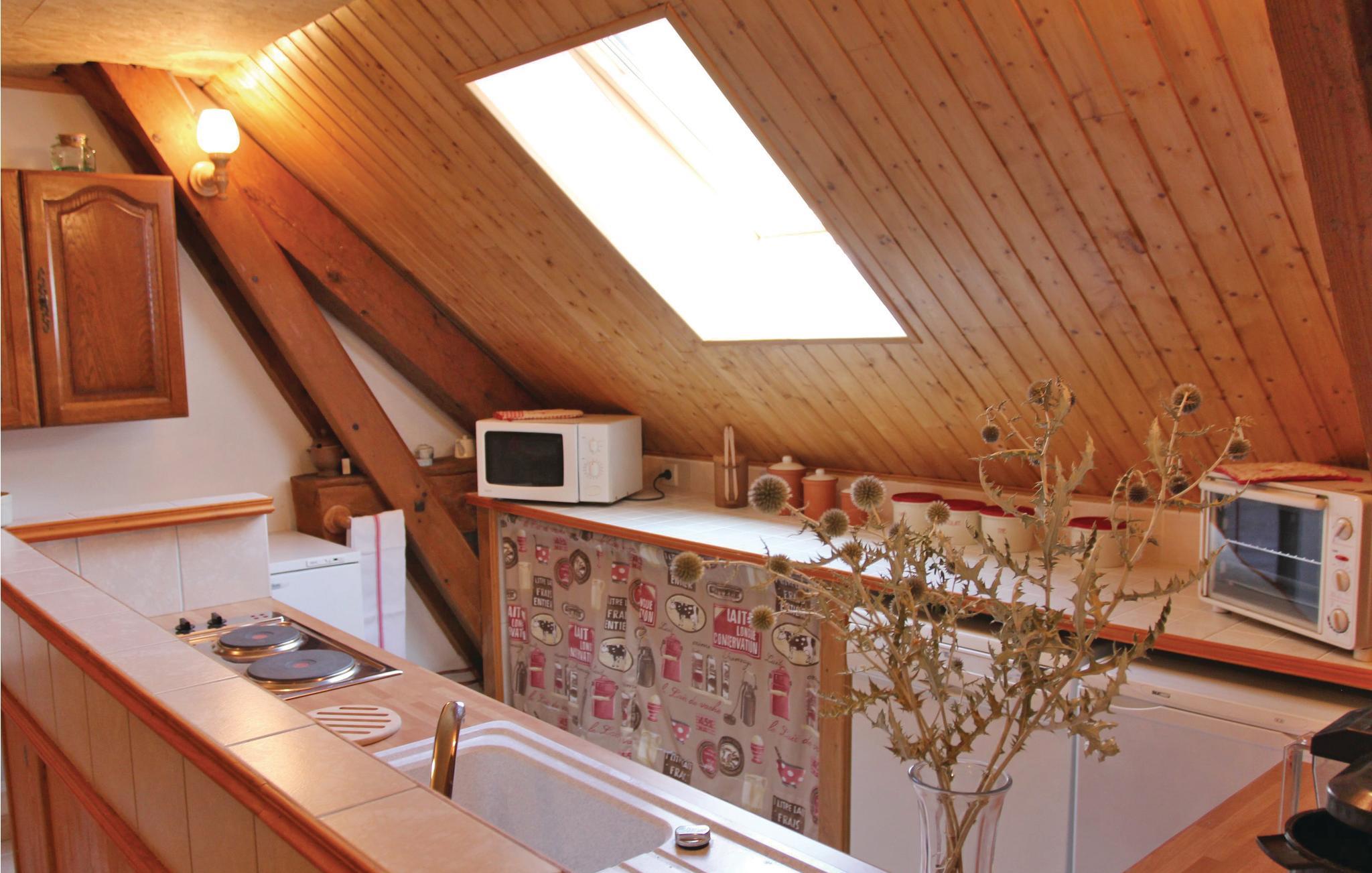 Sæt jer til rette i den hyggelige stue. Sæt jer i sofaen eller nyd dagens måltider ved det rustikke spisebord. Brug det lille tekøkken, der er udstyret med basale apparater, til at tilberede enkle måltider. Træpanelerne og de skrånende lofter skaber en varm atmosfære, der lægger op til hyggestunder.