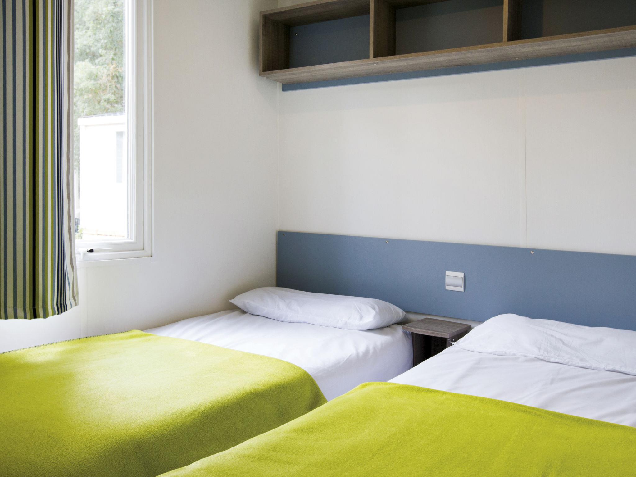 "Domaine de Château Laval", 4-room mobile home 38 m2. Practical furnishings: living/dining room with dining table and TV. Exit to the terrace. 1 room with 1 french bed. 1 room with 2 beds. 1 room with 1 x 2 bunk beds. Kitchenette (4 gas rings, microwave, freezer, electric coffee machine). Shower, sep. WC. Electric heating. Terrace roofed. Terrace furniture. Facilities: children's high chair, baby cot. Please note: non-smoking house. Maximum 1 small pet/ dog allowed. Smoke alarm.