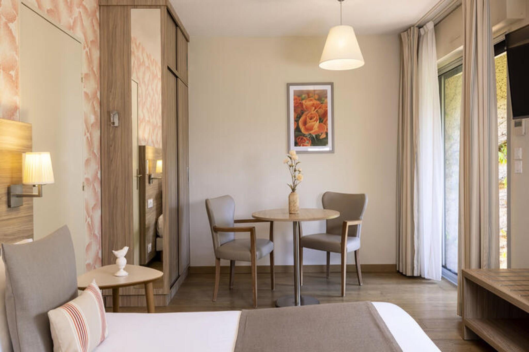 Beliggende i det naturskønne Alpes-de-Haute-Provence tilbyder denne charmerende ferieresidens et behageligt og afslappende tilflugtssted, ideelt for par, familier eller spa-entusiaster. Hver bolig har et valg mellem en dobbeltseng eller to enkeltsenge, aircondition og en privat balkon eller terrasse. Gæster, der rejser med kæledyr, er velkomne, mod tillægsgebyrer. Essentials som sengetøj, håndklæder og Wi-Fi-adgang er inkluderet, hvilket sikrer et stressfrit ophold. En opvarmet udendørs pool, åben fra maj til oktober, og wellness-faciliteter såsom sauna og hammam forbedrer oplevelsen. Ejendommen ligger kun 400 meter fra de berømte termiske bade i Gréoux-les-Bains og en kort gåtur fra det pulserende landsbycentrum og har en misundelsesværdig beliggenhed. Gå en tur gennem maleriske middelaldergader, opdag charmerende caféer og shop på lokale markeder, der tilbyder regionale delikatesser. Områdets rige historie og maleriske arkitektur gør det til en ideel destination for dem, der søger afslapning og kulturel fordybelse. Hver enhed er designet med bekvemmelighed i tankerne og har et moderne tekøkken udstyret med essentielle apparater, perfekt til at tilberede dine måltider. Nyligt renoverede badeværelser har enten bruser eller badekar samt toilet. Privat parkering og babyudstyr, såsom vugger og høje stole, er tilgængelige efter anmodning. Gæsterne kan også nyde morgenmaden på den solbeskinnede terrasse, hvilket tilføjer et strejf af ro til deres morgener.