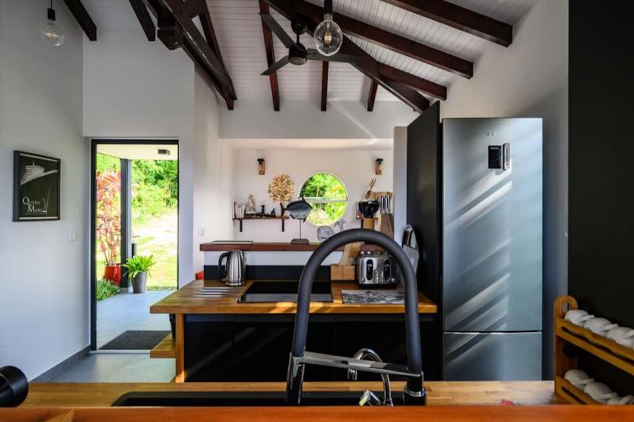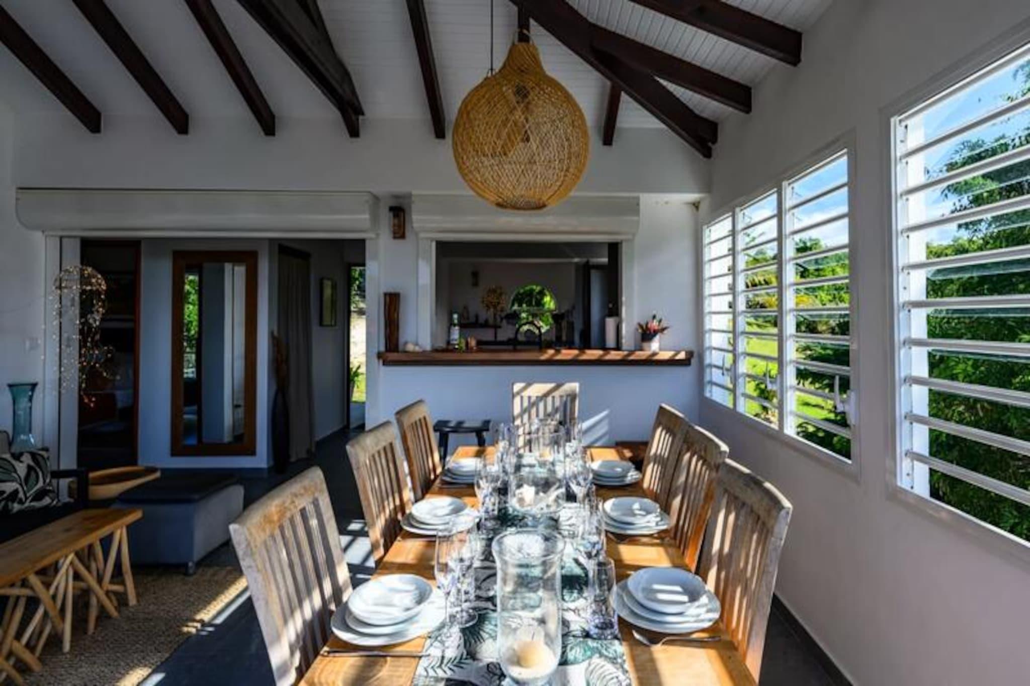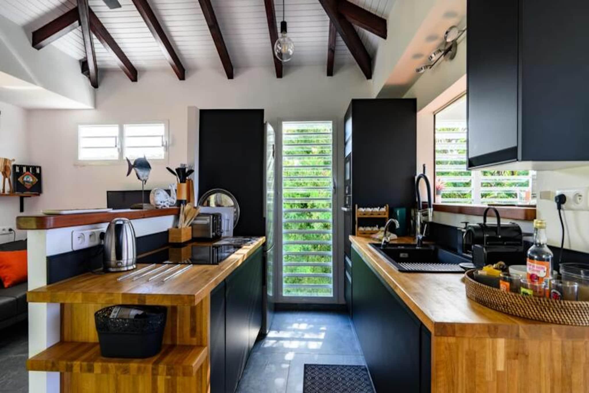 Beliggende på de fredfyldte højder i Grand-Bourg inviterer Villa Bwacajou dig til en tropisk ferie, hvor luksus møder natur. Med en betagende udsigt over havet og øen Dominica er denne 4-stjernede villa en oase af ro, kun fem minutter fra uberørte strande og det pulserende lokale liv. Omgivet af det frodige Murat-landskab tilbyder denne ejendom idylliske omgivelser til en uforglemmelig ferie. Villaen kan prale af tre soveværelser med aircondition, der hver har en queensize-seng og et privat badeværelse for ultimativ komfort. Et af soveværelserne, der er tilgængeligt udefra, sikrer ekstra privatliv for gæsterne. Det moderne køkken er fuldt udstyret med alt det nødvendige, fra en keramisk kogeplade til en opvaskemaskine, hvilket gør det perfekt til at tilberede lækre måltider. Den hyggelige stue, komplet med et fladskærms-tv, åbner ud til en lys og rummelig spiseplads. Store vinduer indrammer en fantastisk udsigt over haven og havet, hvilket skaber en problemfri forbindelse mellem indendørs komfort og udendørs skønhed. Træd udenfor til en overdækket terrasse, der omgiver en charmerende swimmingpool, smukt oplyst om aftenen. Slap af på komfortable liggestole under parasoller, mens du nyder panoramaudsigten. Den store, skovklædte park, der er direkte tilgængelig fra terrassen, tilbyder et fredeligt tilflugtssted for afslappende gåture. Til aftener fyldt med latter og god mad er kulgrillen perfekt til at holde mindeværdige sammenkomster med familie og venner. Villaen er ideelt beliggende i hjertet af Marie-Galante og tilbyder nem adgang til øens mest fantastiske strande, såsom Anse Canot og La Feuillère, der er ideelle til svømning eller kitesurfing. Udforsk den lokale kultur med besøg på Murat-plantagen, romdestillerier eller den pulserende Terre de Blues-festival. Uanset om du vandrer gennem sukkerrørsmarker, beundrer Grand Gouffre eller nyder kreolsk køkken på nærliggende restauranter, tilbyder Villa Bwacajou den perfekte blanding af afslapning, eventyr og kulturel opdagelse. Din drømmeferie i Guadeloupe venter!