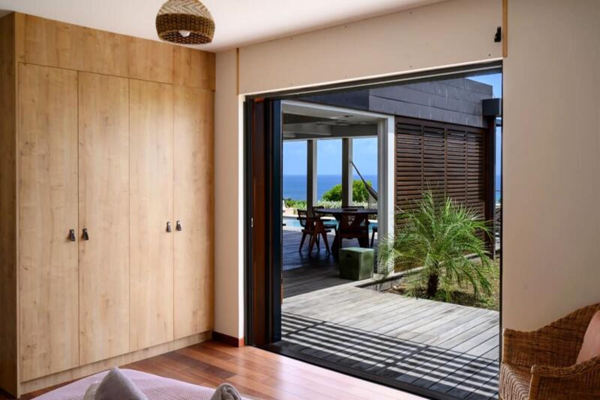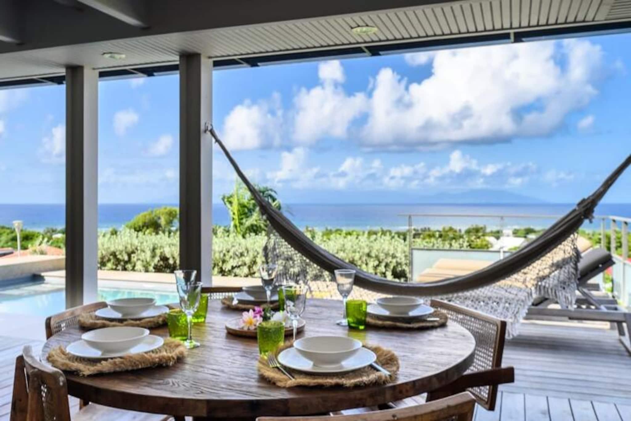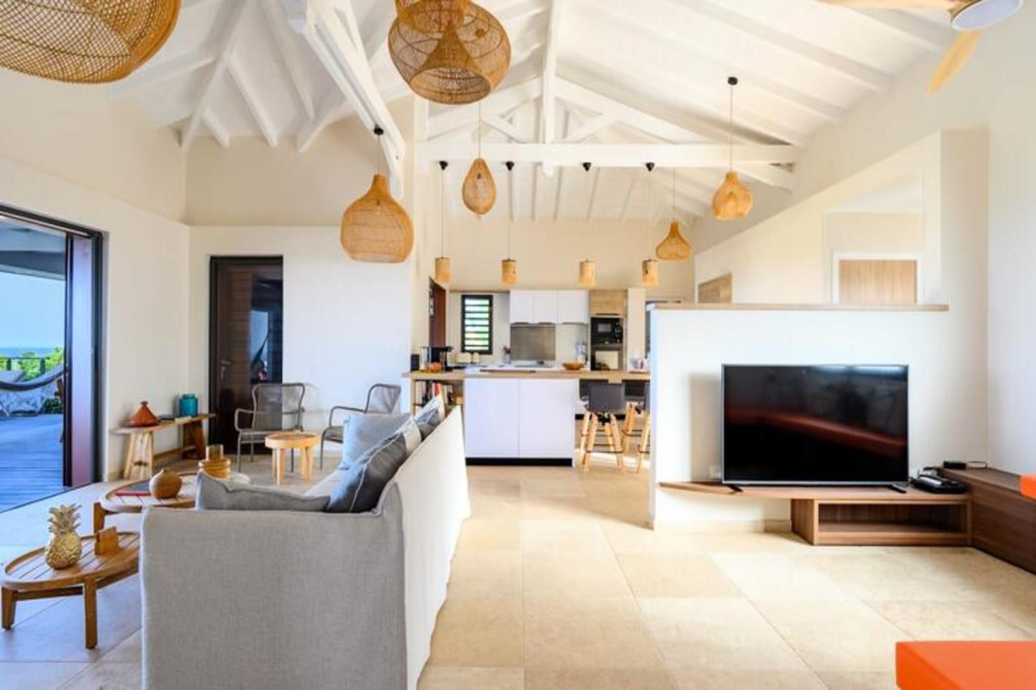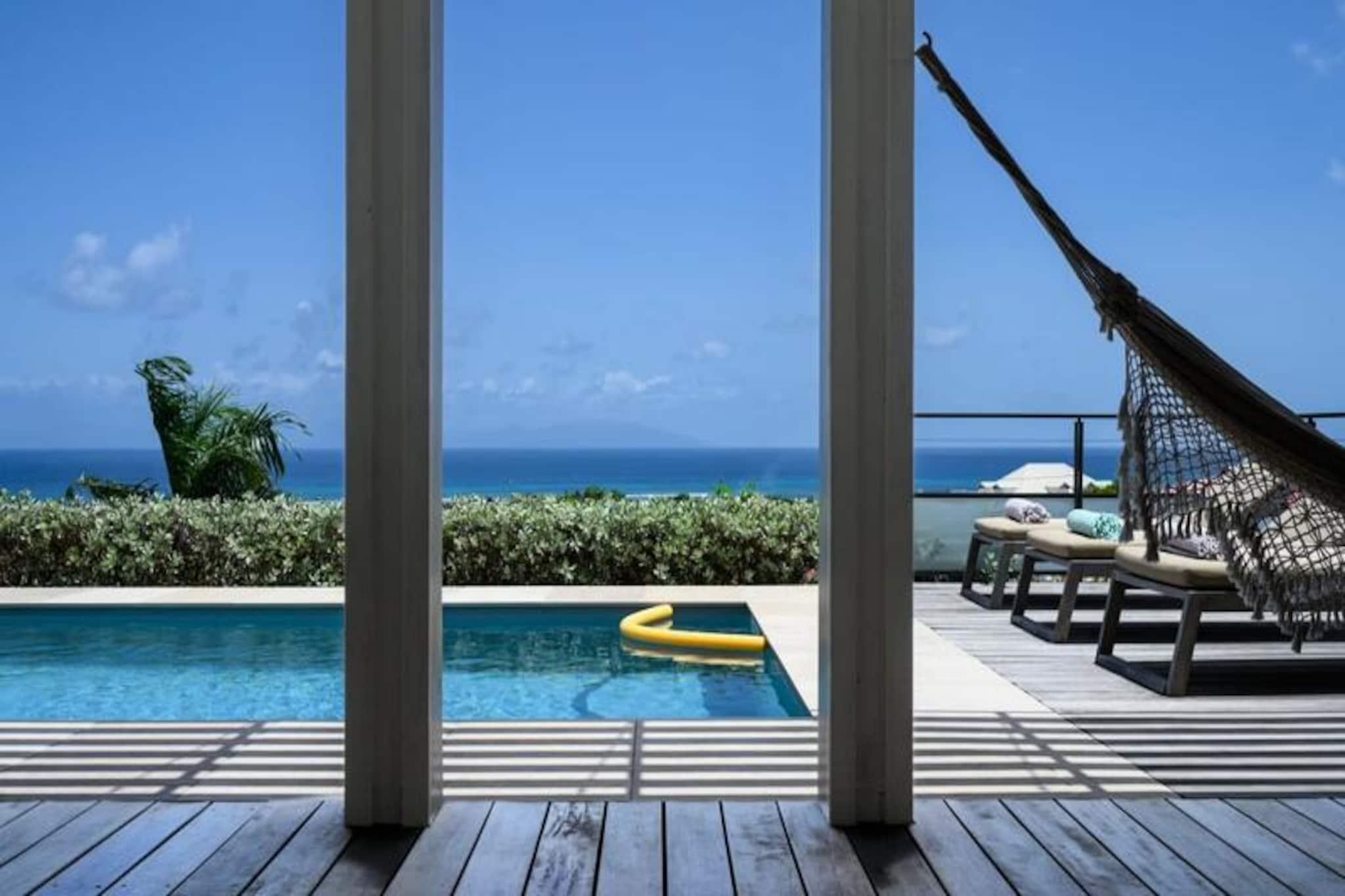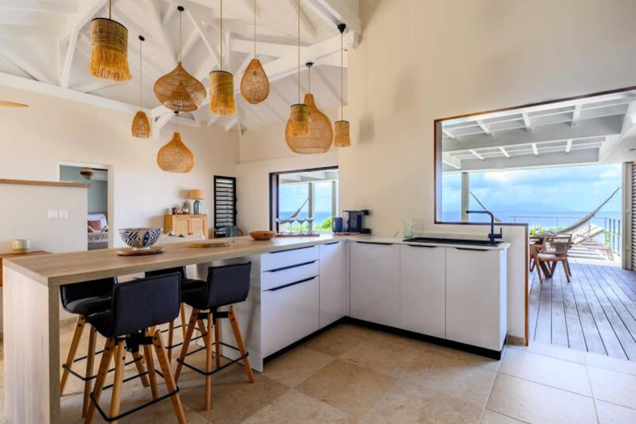 Forestil dig at vågne op til den blide caribiske brise og lyden af ??bølger i det fjerne, mens solen står op over den idylliske ø Marie-Galante. Denne moderne villa, beliggende i de rolige omgivelser i Grand-Bourg, tilbyder et luksuriøst tilflugtssted, hvor komfort møder betagende naturlig skønhed. Med panoramaudsigt over Dominica og Les Saintes føles hvert øjeblik her som et postkort, der kommer til live. Villaen er designet med elegance og afslapning i tankerne og har to rummelige suiter med aircondition, der hver er udstyret med premium 160 cm sengetøj og private badeværelser i italiensk stil med bruseniche. Det fuldt udstyrede køkken inviterer dig til at tilberede lækre måltider, mens den lyse og stilfulde stue åbner ud til en solbeskinnet terrasse. Udenfor er den private pool, omgivet af et terrasseområde, perfekt til at køle af eller nyde solen, alt imens du nyder den fantastiske havudsigt og de uforglemmelige solnedgange. Kun få minutter væk finder du den charmerende by Grand-Bourg, kendt for sine pulserende markeder, kreolske restauranter og indbydende atmosfære. Udforsk de uberørte hvide sandstrande ved Anse Canot og La Feuillère, der er ideelle til svømning og kitesurfing. Oplev lokale destillerier, vandre gennem sukkerrørsmarker, eller deltag i livlige strandkoncerter for at få en smagsprøve på øens rige kultur og traditioner. Uanset om du søger ro, eventyr eller en blanding af begge dele, tilbyder denne villa den perfekte base for en uforglemmelig caribisk flugt. Lad Guadeloupes skønhed og den varme befolkning skabe minder, der vil vare hele livet.