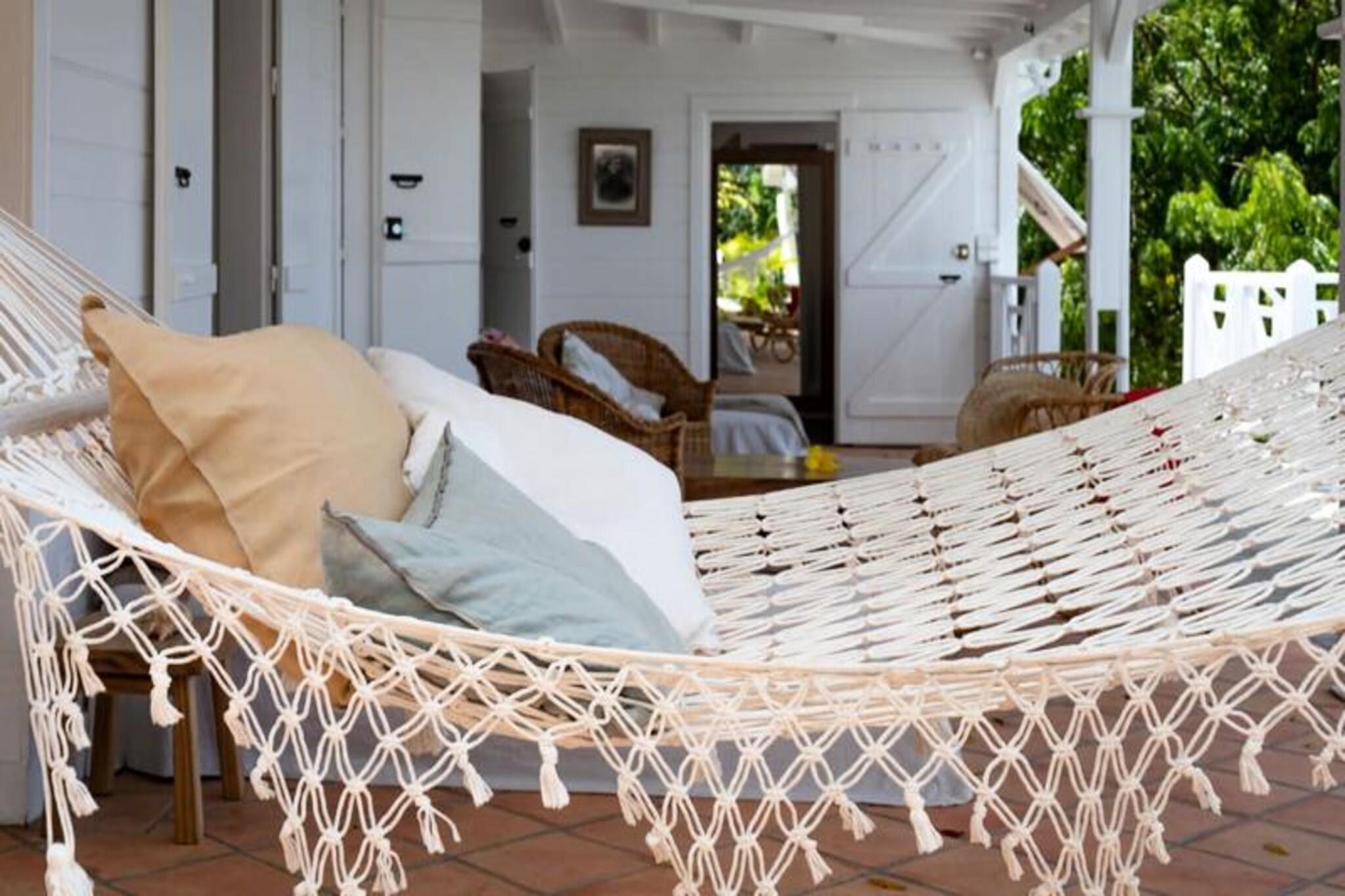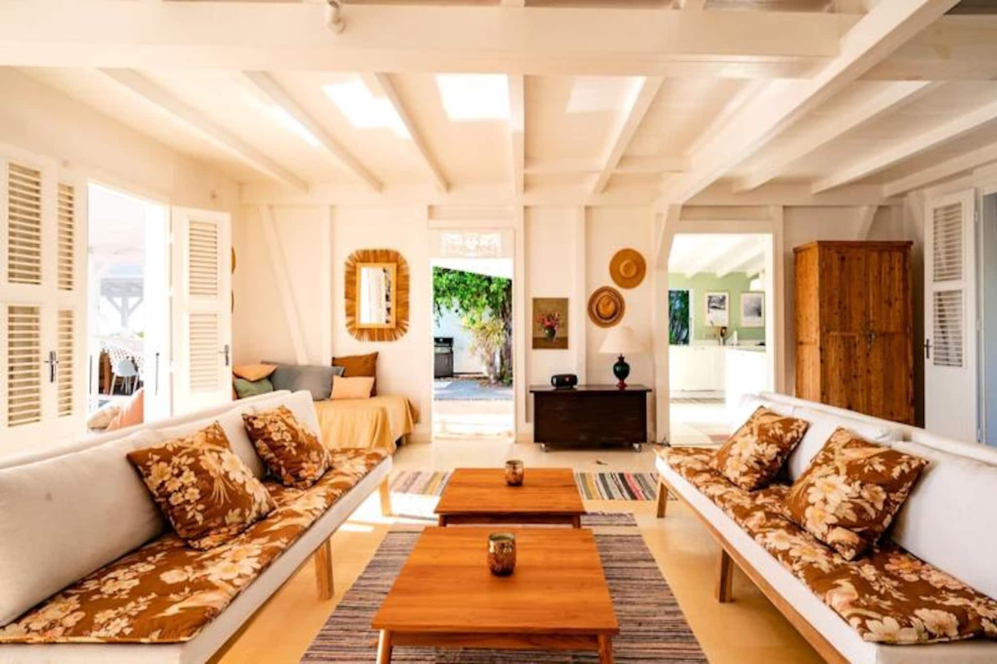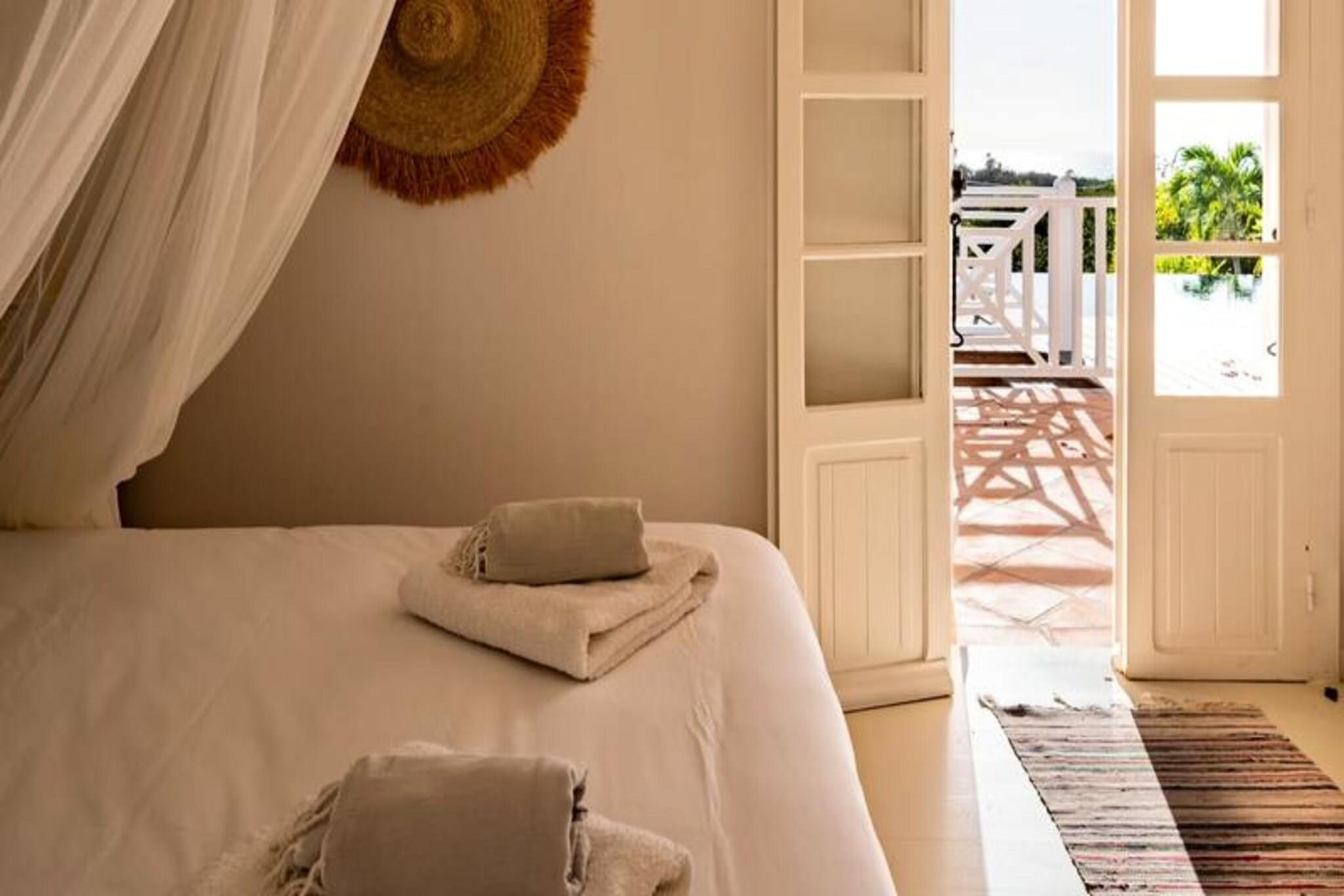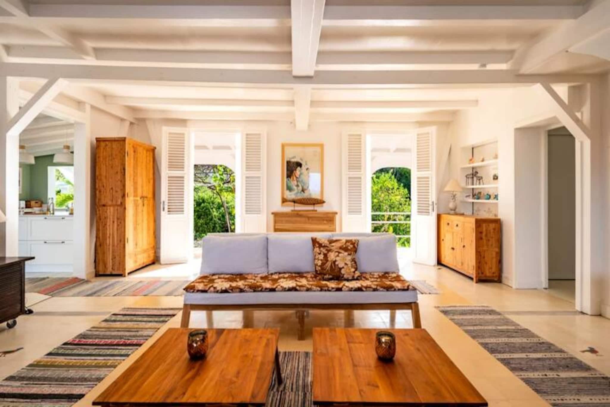 På den fredfyldte ø Marie-Galante, hvor det turkisblå Caribiske Hav møder uberørt hvidt sand, tilbyder Villa Blanche en uovertruffen flugt ind i naturen og roen. Gemt i en frodig tropisk have fyldt med banantræer og livlige kolibrier, inviterer dette fristed dig til at genoprette forbindelsen med livets enkle glæder. Her er de eneste lyde brisens hvisken, fuglenes kvidren og lejlighedsvise tropiske regnbyger, hvilket skaber en atmosfære, der føles tidløs og uberørt. Denne udsøgte ejendom har plads til op til 11 gæster fordelt på fem smukt designede soveværelser, hver med sit eget private badeværelse. To af disse er beliggende i uafhængige bungalows, der tilbyder ultimativ privatliv, mens master-suiten kan prale af en betagende havudsigt. Villaens hjerte er en rummelig opholdsstue, der problemfrit blander indendørs og udendørs ophold. Et fuldt udstyret italiensk køkken, en skyggefuld terrasse og en infinity-pool med udsigt over havet giver de perfekte rum til afslapning og kontakt. Den en hektar store have, oversået med frugttræer og snoede stier, bidrager til charmen, mens faciliteter som aircondition, højhastigheds-Wi-Fi og en petanquebane sikrer moderne komfort. Kun fem minutter fra Grand-Bourg finder du livlige markeder, kreolske restauranter og lokale destillerier, du kan udforske. De nærliggende strande Anse Canot og La Feuillère tilbyder rolige svømningsmuligheder og spændende kitesurfingmuligheder. Uanset om du vandrer gennem sukkerrørsmarker, nyder en ti-punch på terrassen eller tager en stjerneklar dukkert i infinity-poolen, lover Villa Blanche et uforglemmeligt caribisk tilflugtssted. Med en dedikeret concierge-service, der kan hjælpe med udflugter, biludlejning og lokale anbefalinger, vil dit ophold være lige så problemfrit, som det er magisk. Oplev essensen af ??Guadeloupes naturlige skønhed og autentiske charme på Villa Blanche - et paradis, hvor luksus møder enkelhed.