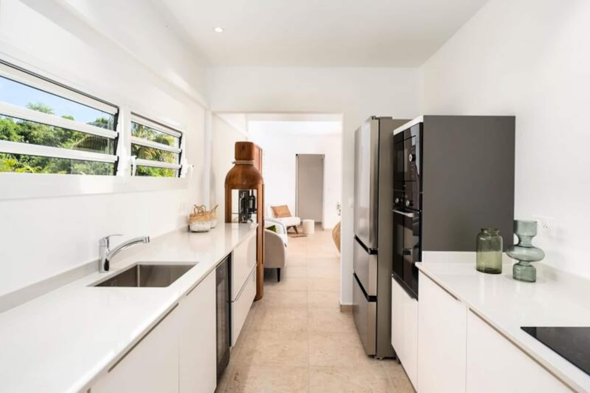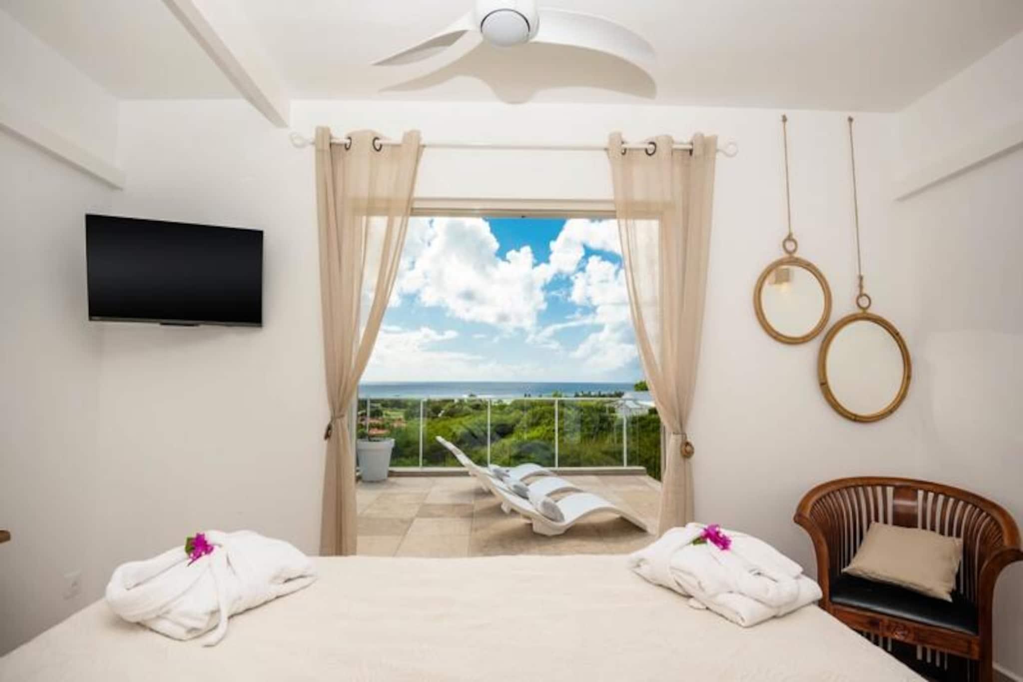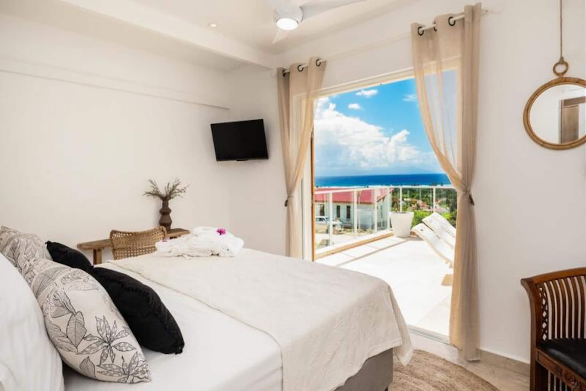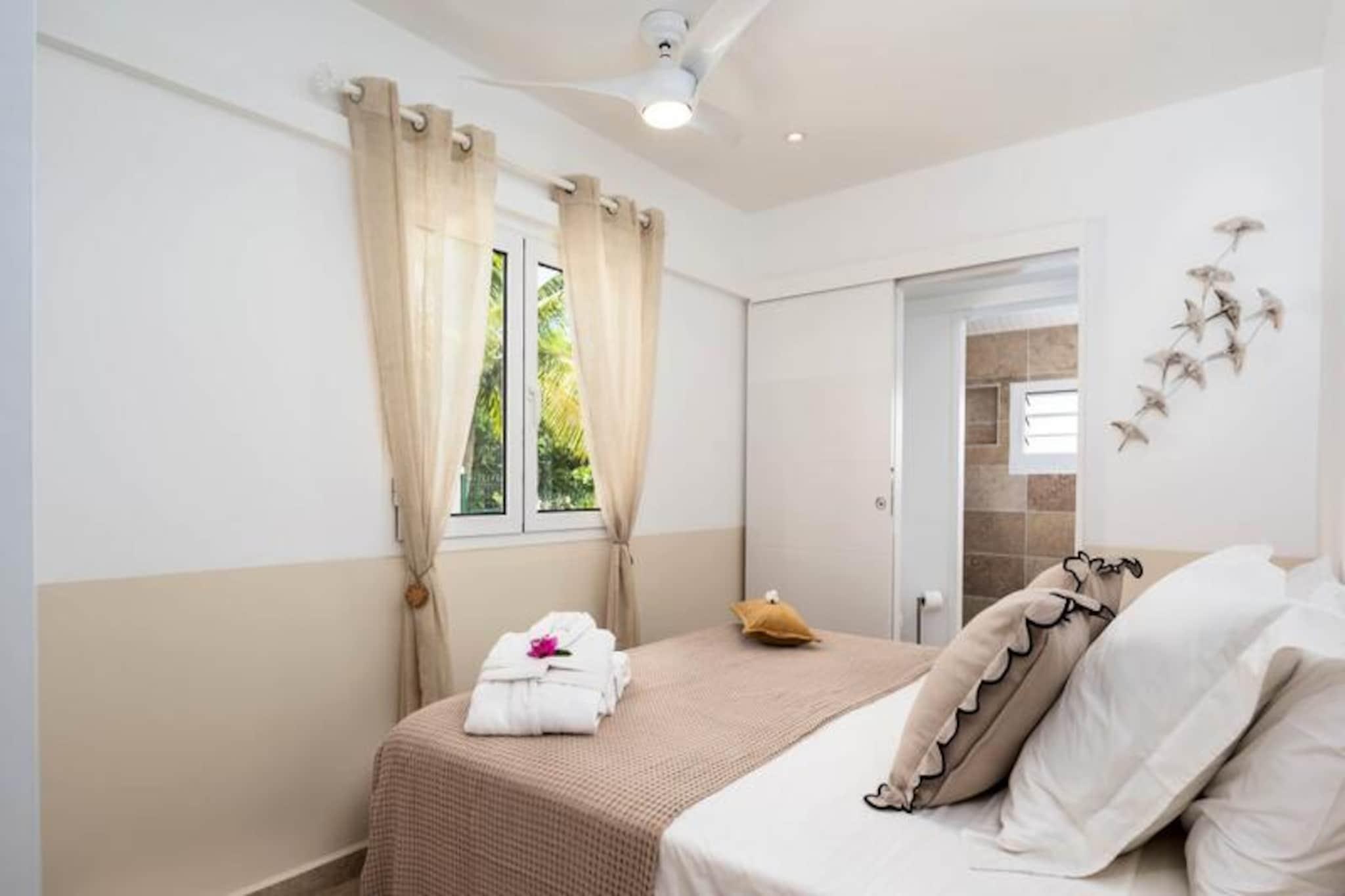 På de fredfyldte højder i Grand-Bourg tilbyder Villa Olina en idyllisk tilflugtssted, hvor ro møder luksus. Omgivet af Marie-Galantes frodige skønhed er denne villa et fristed for dem, der søger afslapning og forbindelse med naturen. Forestil dig at vågne op til panoramaudsigt over øens frodige landskaber, mens den blide caribiske brise inviterer dig til at træde udenfor og omfavne dagen. Dette er mere end et feriehus; det er dit private tilflugtssted under Guadeloupes sol. Med tre elegant designede soveværelser, der hver har en dobbeltseng og eget badeværelse, sikrer Villa Olina maksimal komfort og privatliv for op til seks gæster. Den rummelige og lyse stue skaber en indbydende atmosfære, mens det moderne, fuldt udstyrede køkken åbner ud til en stor terrasse, perfekt til fælles måltider og øjeblikke med samvær. Udenfor venter en glitrende swimmingpool, der tilbyder det perfekte sted at slappe af og nyde solen. Hver detalje, fra aircondition i alle værelser til sengetøj af høj kvalitet, er omhyggeligt udvalgt for at give en problemfri og luksuriøs oplevelse. Villaen ligger kun fem minutter fra Grand-Bourgs charmerende bymidte og er ideelt placeret til at udforske øens skatte. Gå en tur gennem lokale markeder, nyd kreolske delikatesser på nærliggende restauranter, eller besøg de uberørte strande La Feuillère og Anse Canot, der er perfekte til svømning og solbadning. Naturentusiaster vil nyde vandrestierne og sukkerrørsmarkerne, der definerer Marie-Galantes unikke charme. Uanset om du søger eventyr eller ro, tilbyder Villa Olina den perfekte balance. Med eksklusive concierge-services, herunder udflugter, billeje og lufthavnstransport, er alle aspekter af dit ophold skræddersyet til dine behov. Lad Villa Olina være din port til en uforglemmelig caribisk oplevelse.