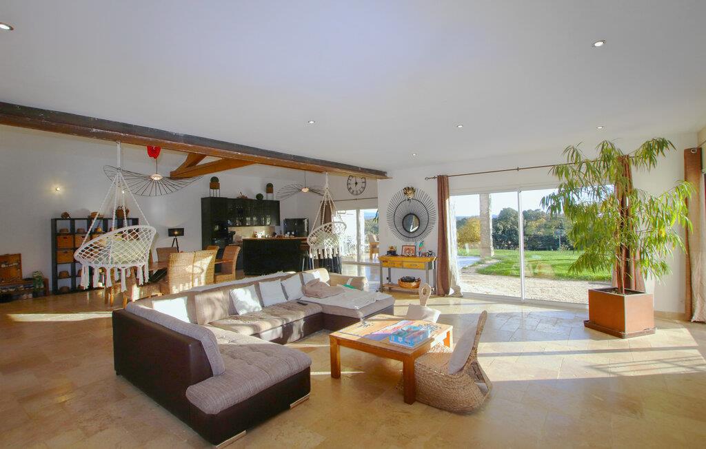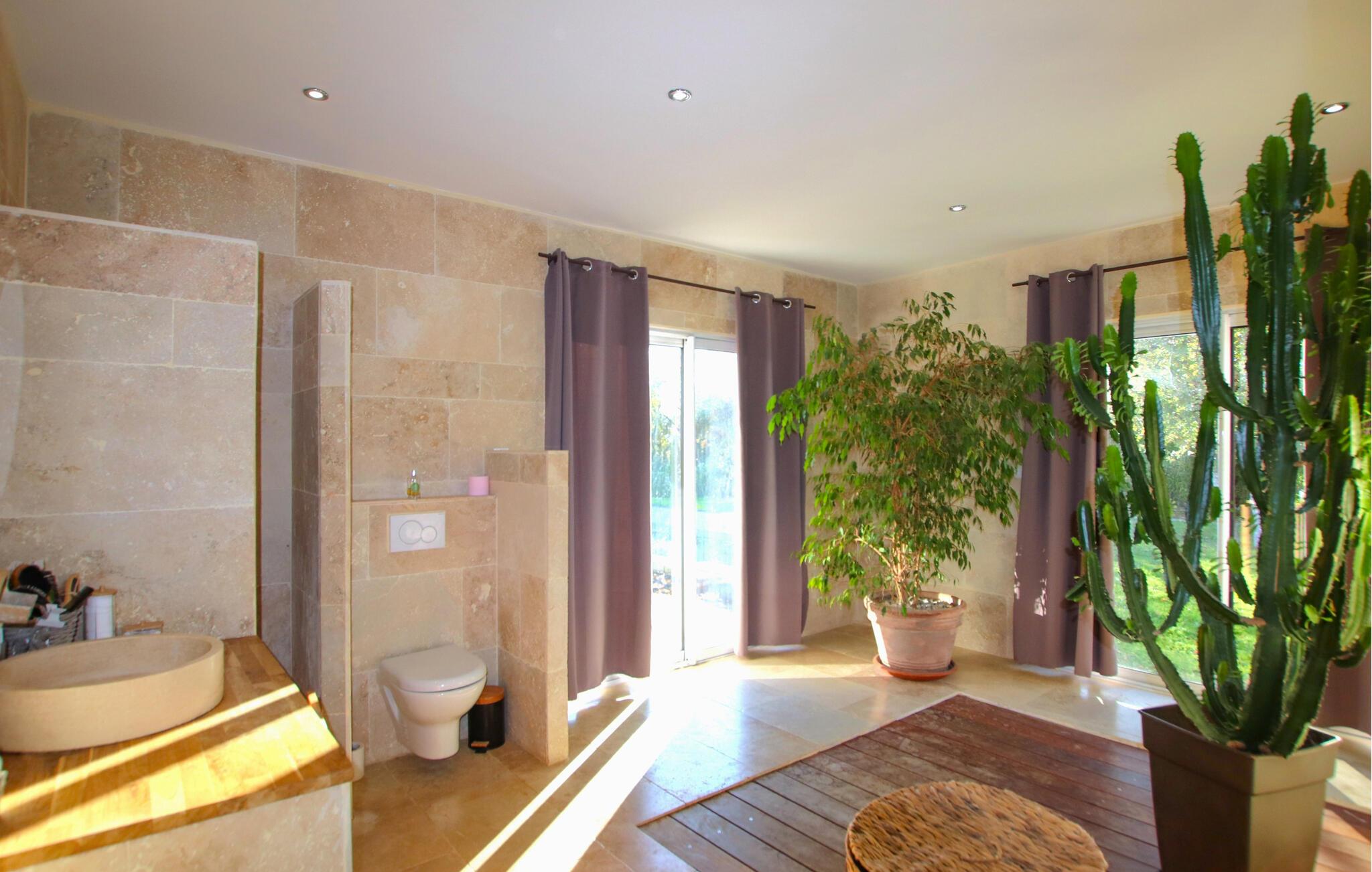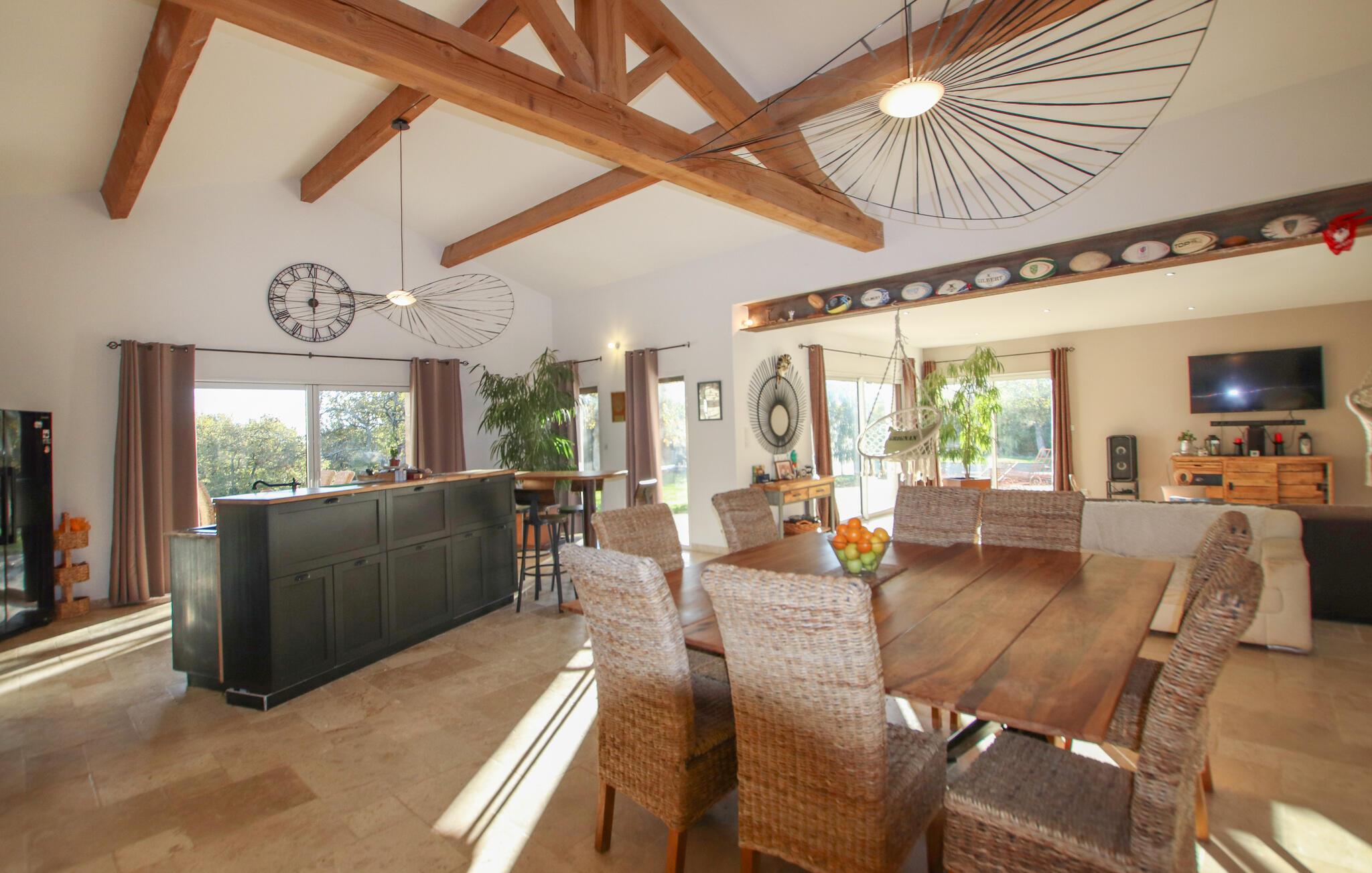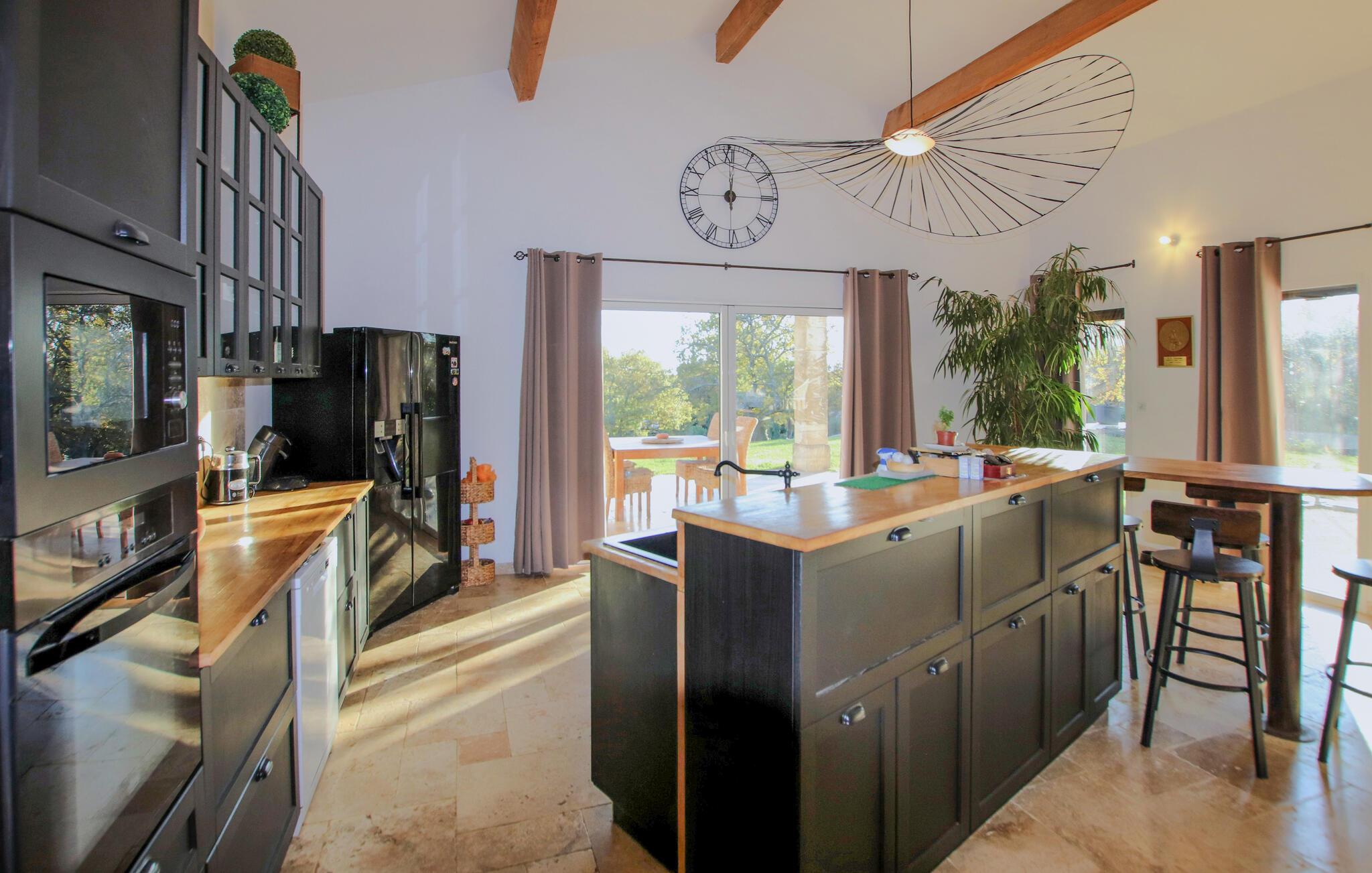 Forkæl jer selv med en dejlig ferie i dette moderne feriehus med pool. De lyse værelser er elegant indrettet med materialer af høj kvalitet og stilfulde møbler. Slap af i den hyggelige stue med et glas vin, stream jeres yndlingsserie, eller nyd en sjov spilleaften sammen. Tilbered lækre måltider i det veludstyrede køkken og spis sammen ved det store spisebord. Hvis I har lyst til lidt venskabelig konkurrence, så prøv et spil billard. Den rummelige have byder på masser af muligheder for fritidsaktiviteter. Nyd morgenmaden på den solrige terrasse, svøm et par baner i poolen, eller spil vandpolo med børnene. Hold grillfester med venner eller familie, og afslut dagen med at slappe af under stjernerne. I Grignan vil I opleve Drôme Provençales umiskendelige charme. Højt over landsbyen ligger et storslået renæssanceslot, hvis esplanade tilbyder en betagende udsigt over det vidtstrakte landskab. Tag på udflugter til de omkringliggende landsbyer i "Pavernes Enklave", oplev vinruten Côtes I Rhône, og lad jer fortrylle af den provencalske livsstil. Uanset om det er en slentretur på markedet i Vaison-la-Romaine, et besøg på krokodillefarmen i Pierrelatte eller en svømmetur i Lez-floden – her finder I utallige muligheder for nydelse, kultur og afslapning.