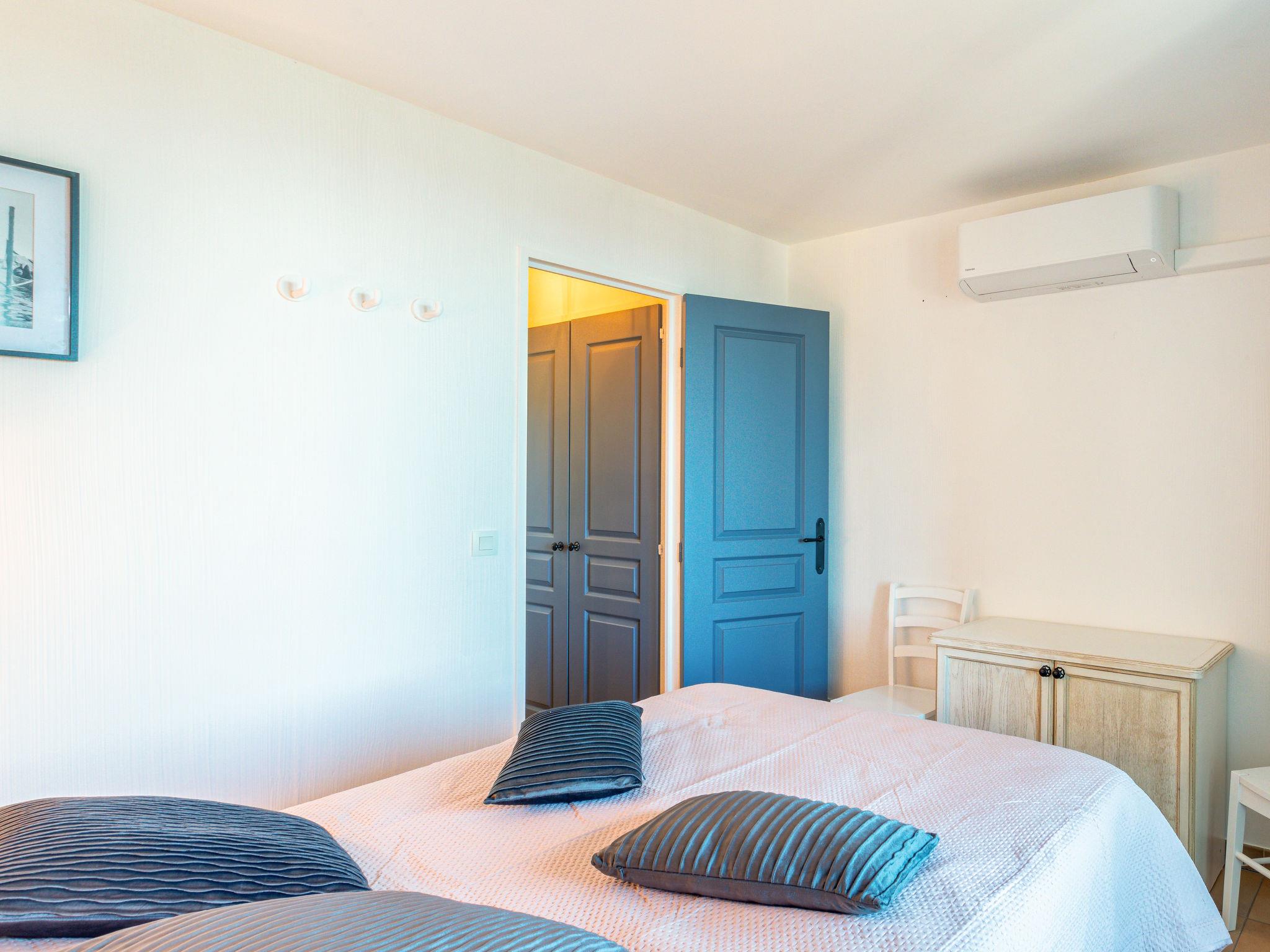 "Les Restanques 8", 3-room apartment 46 m2 on 2 levels. Beautiful furnishings: living/dining room with 1 double sofabed (140 cm, length 190 cm), TV (flat screen). Exit to the balcony. 1 small room with 1 double bed (140 cm, length 190 cm). Kitchenette (dishwasher, 4 ceramic glass hob hotplates, toaster, kettle, microwave, electric coffee machine). Shower/WC. Upper floor: 1 room with 1 french bed (140 cm, length 190 cm). Exit to the balcony. Shower/WC. Electric heating, air-conditioning. Balcony 7 m2, balcony 5 m2. Balcony furniture. Beautiful view of the sea and the countryside. Facilities: washing machine, iron. Internet (WiFi, extra). Parking (roofed). Please note: maximum 1 pet/ dog allowed. Smoke alarm. Offer by a commercial proprietor according to Art. 155, IV, CGI 83068001333S3