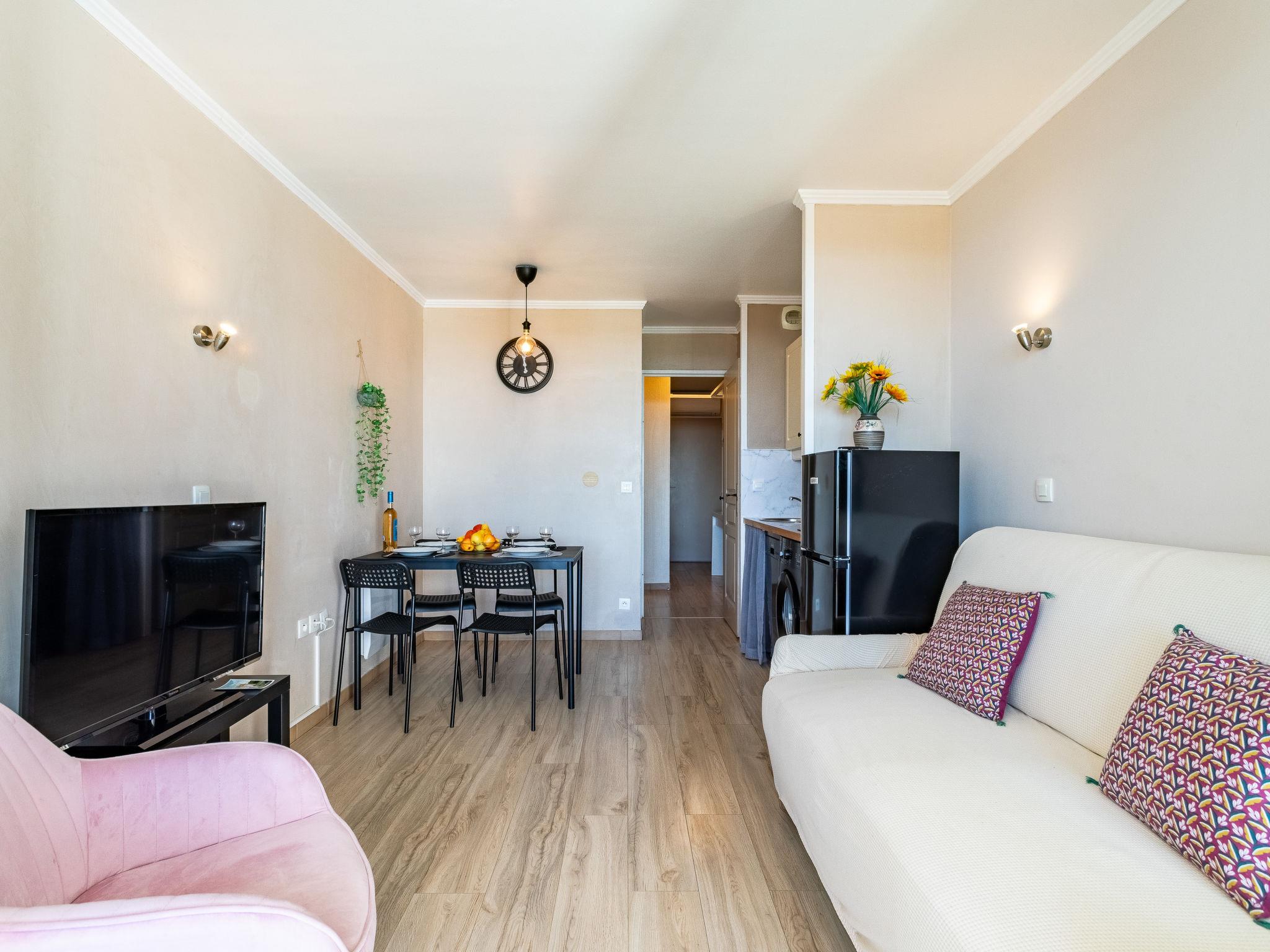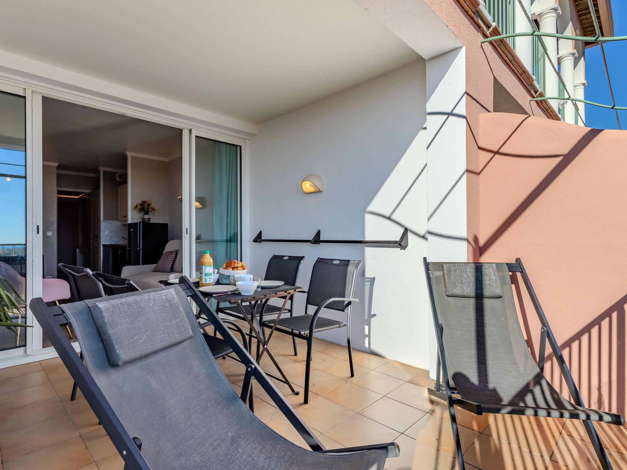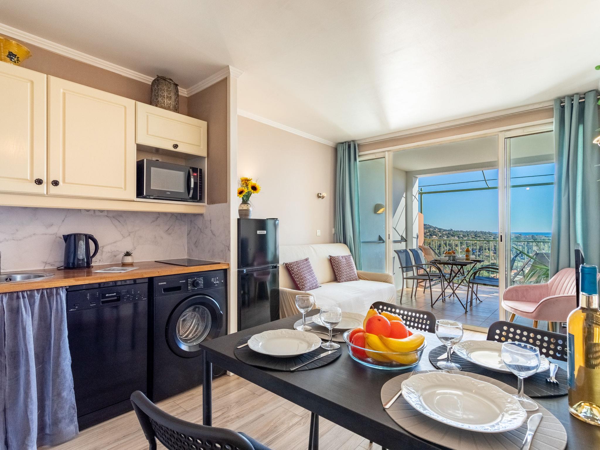 "Les Restanques 9", 2-room apartment 30 m2, on the ground floor. Beautiful furnishings: living/dining room with 1 double sofabed (140 cm, length 190 cm), TV (flat screen), air conditioning. Exit to the balcony. 1 small room with 1 double bed (140 cm, length 190 cm). Kitchenette (dishwasher, 2 ceramic glass hob hotplates, toaster, kettle, microwave, electric coffee machine). Bathroom, sep. WC. Electric heating. Balcony 7 m2. Balcony furniture. Beautiful view of the sea and the countryside. Facilities: washing machine, baby cot for up to 2 year olds. Internet (WiFi, extra). Parking space n 4311 (roofed). Please note: non-smokers only. Smoke alarm. Offer by a private individual according to Art. 155, IV of CGI. 83068001182GW