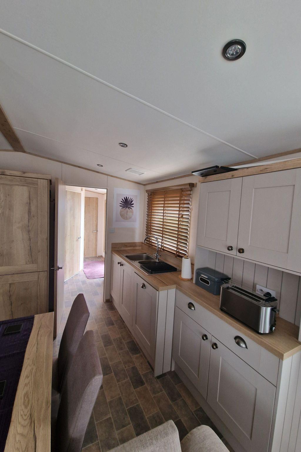 Inside, the mobile home has a kitchen that leaves nothing to be desired: you will find a gas hob, oven, fridge, freezer, microwave, Nespresso machine, toaster and kettle. Of course, there is a dishwasher for your convenience, leaving more time for relaxation. Comprehensive entertainment in the evening is provided by a TV with IPTV. The two bedrooms and two bathrooms ensure that everyone has their own space, which is particularly beneficial when on holiday with friends or family.