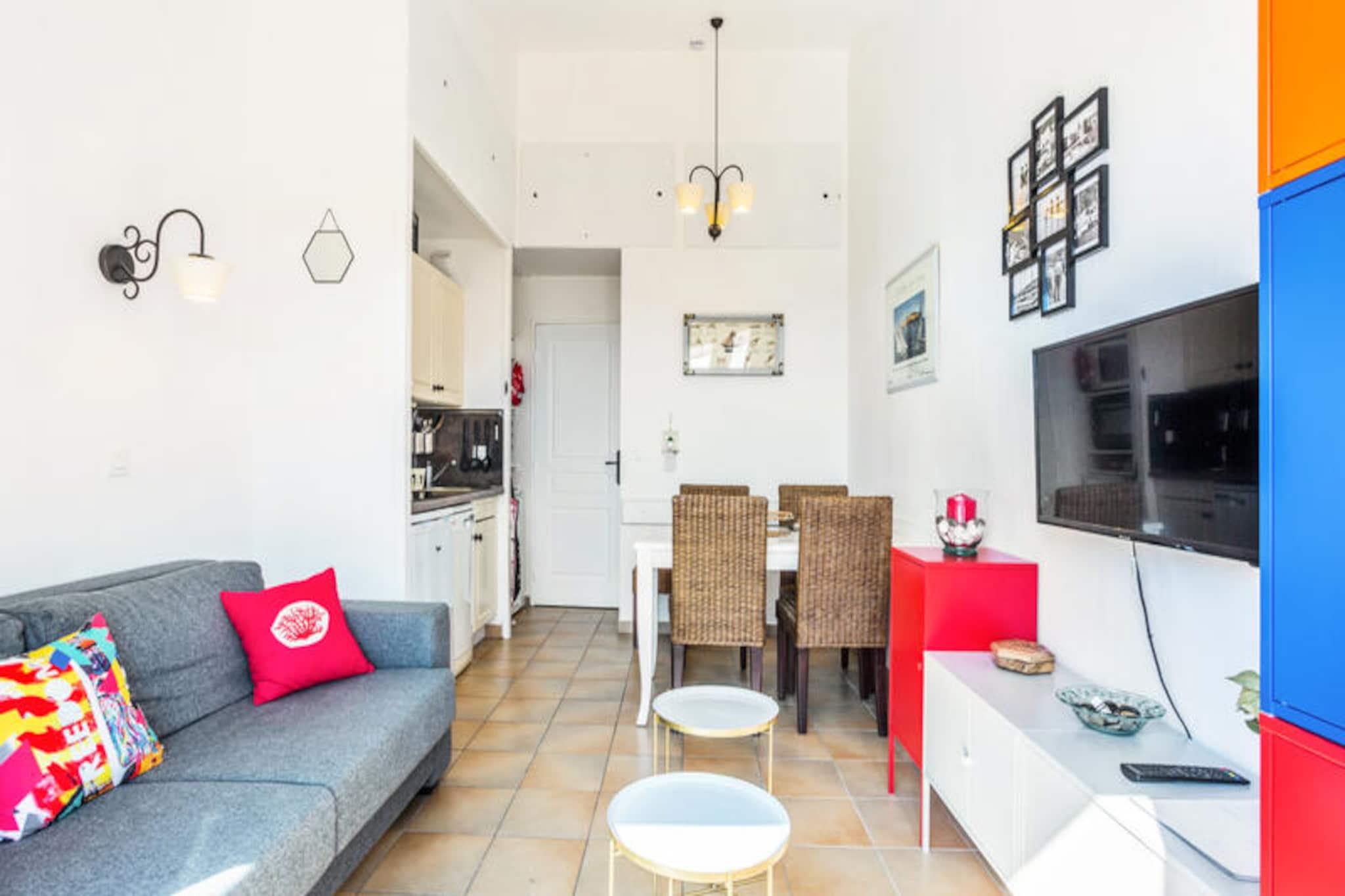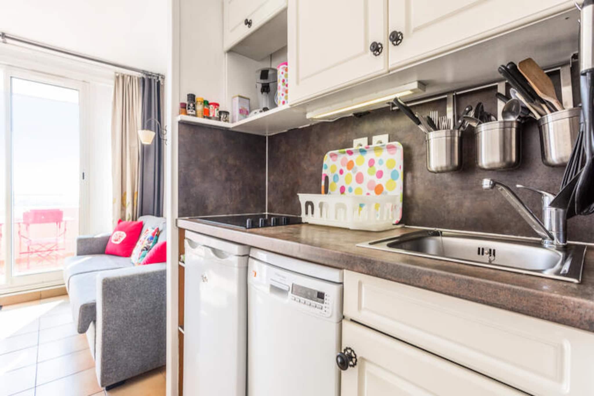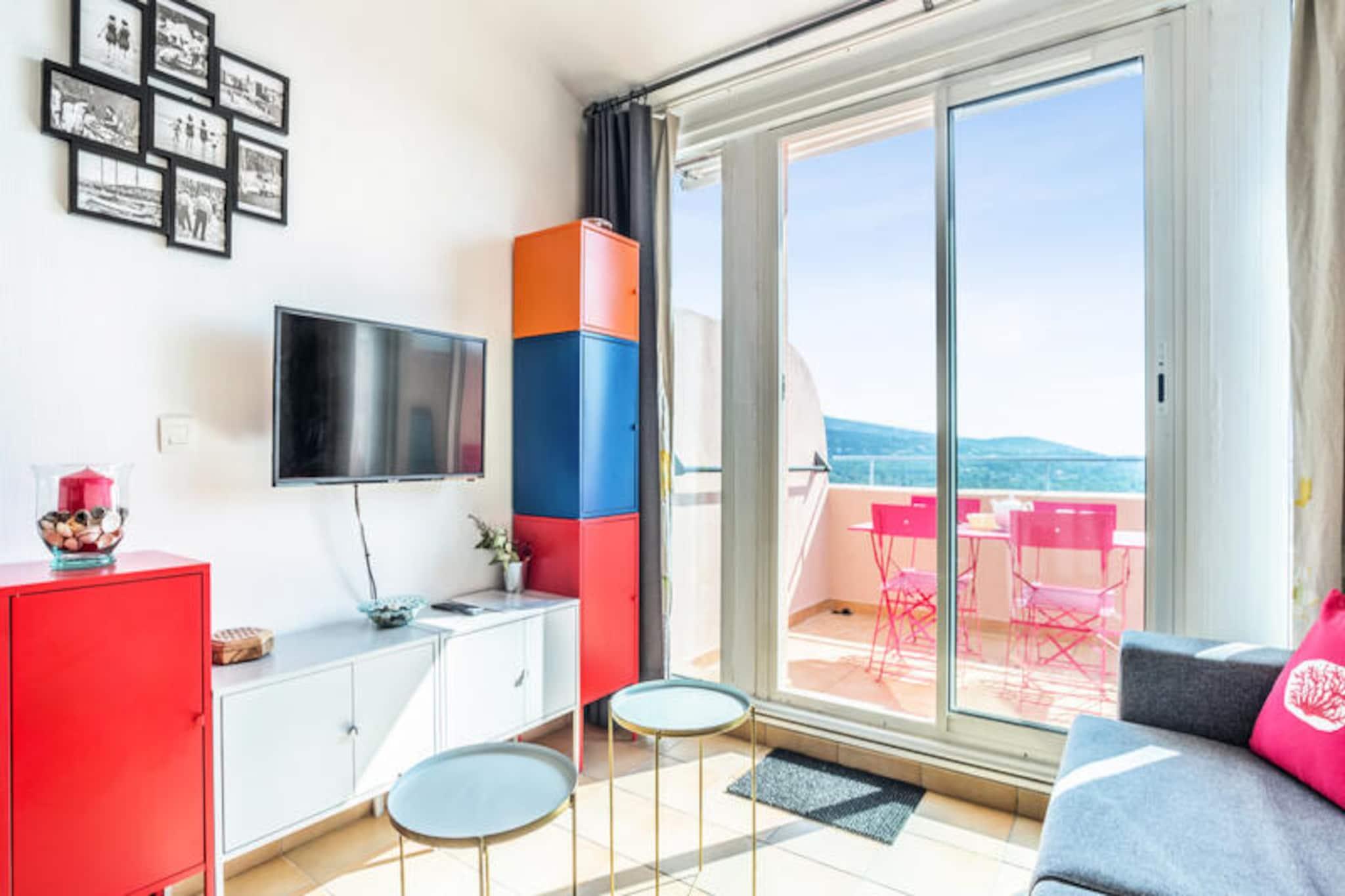 Denne rummelige lejlighed på 28 m² kan rumme op til 4 gæster. Det har en stue med en sovesofa, et soveværelse med køjesenge, et separat toilet og en balkon med en fantastisk udsigt over Saint-Tropez-bugten. Lejligheden ligger på første sal og kan nås med elevator (ikke nævnt i beskrivelsen, men underforstået ved at have etager). Kæledyr er tilladt mod et ekstra gebyr. Mens en bil anbefales, tilbyder ejendommen parkering på stedet. Denne bolig er beliggende i et anlagt område med enestående omgivelser. Gæsterne kan besøge den provencalske landsby Grimaud, udforske det omkringliggende område som Croix Valmer, Ramatuelle og Plan de la Tour eller slappe af på stranden, der ligger 3 km væk. Luna Park tivoli og Grimaud havn er også nærliggende attraktioner. Lejligheden indeholder et funktionelt køkken åbent til stuen, et badeværelse med badekar-bruser og et separat toilet. Gæsterne kan nyde forskellige faciliteter på stedet mod et ekstra gebyr, herunder et swimmingpoolkompleks, tennisbaner, børneklubber og animationsprogrammer. Ejendommen tilbyder også en restaurant med provencalsk køkken og et supermarked (åbent efter sæsonen).