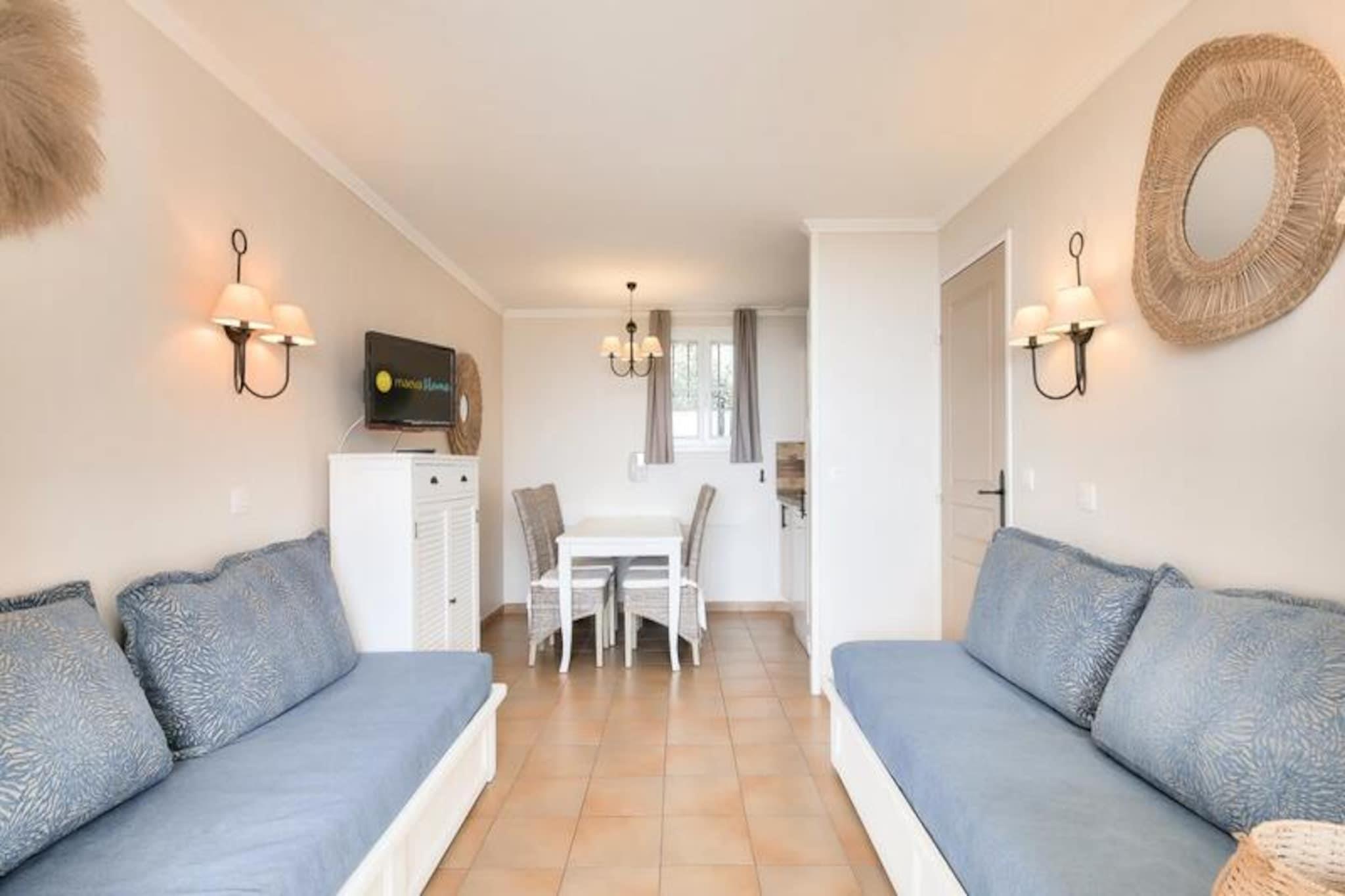 Denne rummelige lejlighed tilbyder et smukt ophold i en fantastisk beliggenhed, perfekt til familier eller små grupper. Med to soveværelser - det ene med en dobbeltseng og det andet med køjesenge - kan det komfortabelt rumme op til seks gæster. Opholdsområdet omfatter to sovesofaer, ideel til yderligere sovearrangementer. For din bekvemmelighed er lejligheden kæledyrsvenlig (mod tillægsgebyr) og kommer med væsentlige faciliteter såsom Wi-Fi-adgang (tilgængelig mod et tillæg), to badeværelser og et separat toilet. Derudover forbedrer en privat have og en overdækket terrasse med havudsigt dit ophold. Ejendommen ligger kun 3 km fra stranden og tilbyder nem adgang til attraktioner såsom landsbyerne Grimaud, Saint-Tropez og Plan de la Tour. Gæsterne kan udforske nærliggende strande, herunder Lavandou, eller nyde Luna Park. Udendørs aktiviteter som tennis, petanque og multisport er tilgængelige, og lokale restauranter, såsom La Calade med naturskønne udsigter, serverer lækre provencalske retter. Lejligheden har et åbent køkken med spiseplads, fuldt udstyret med moderne bekvemmeligheder såsom opvaskemaskine, induktionskomfur, mikroovn og køleskab. Begge badeværelser har praktiske faciliteter, herunder bruser og badekar. For ekstra bekvemmelighed tilbyder lejligheden også et babysæt (afhængigt af tilgængelighed) og overdækket parkering. Valgfri tjenester som leje af sengetøj og slutrengøring sikrer et behageligt, problemfrit ophold.