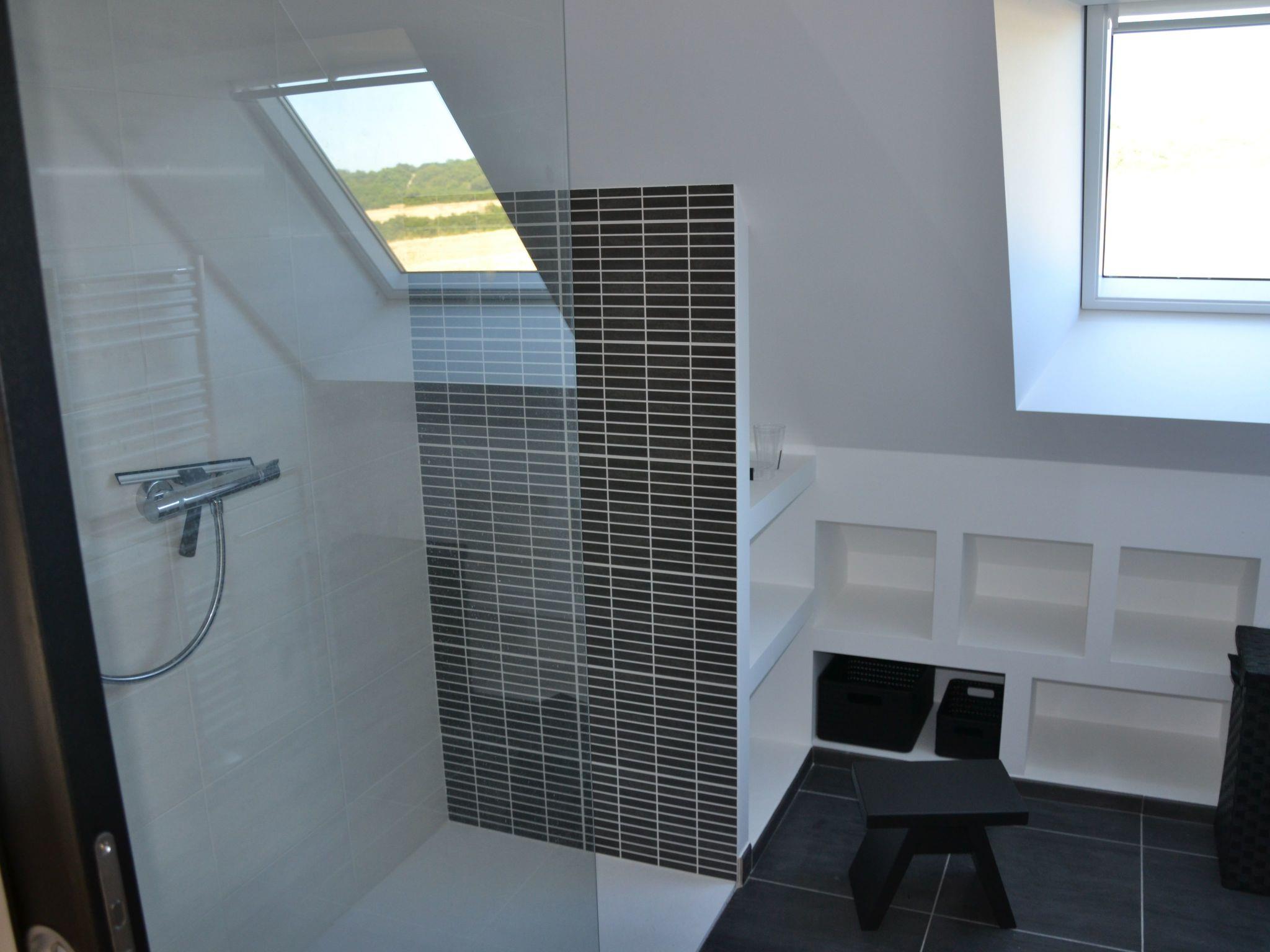 Practical double garage for 2 cars, bicycles, sailing, surfing, kite-surfing, golfing equipment, etc. Hard-surface access to the house (scraped concrete) and pathway suitable for wheelchairs Ground floor accessible to People with Reduced Mobility (PRM) Wide doors on the ground floor to make it easier to move a wheelchair On the ground floor, a private area comprising a separate toilet, a bedroom and a shower room with walk-in shower has been designed to allow wheelchair access.