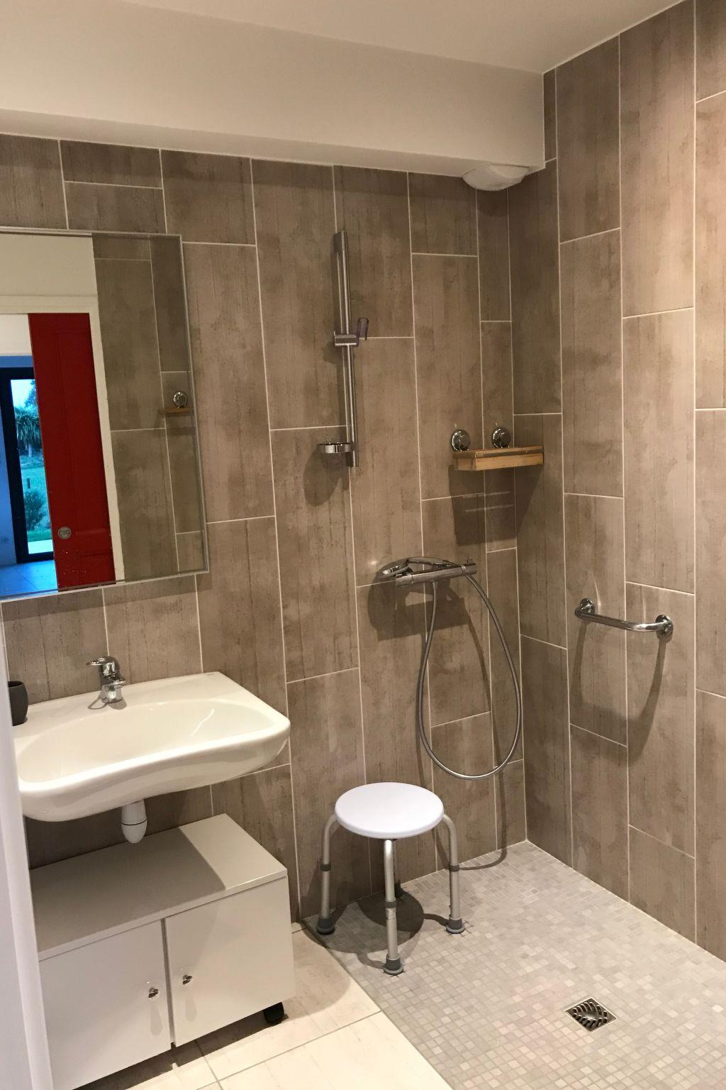 Grab rails in the WC and shower room Sufficient space under the washbasin in the shower room to allow a wheelchair to pass (there is a movable piece of furniture on castors).