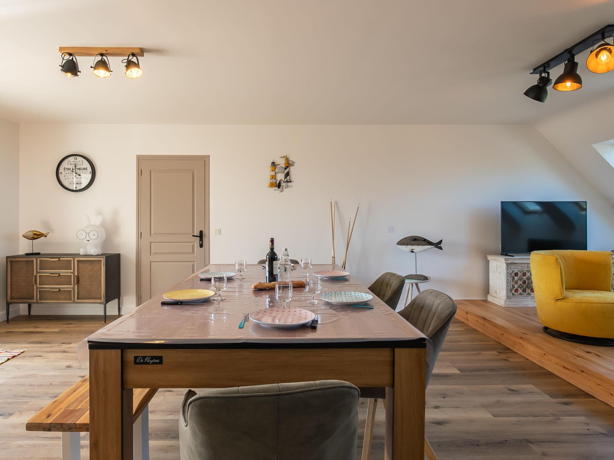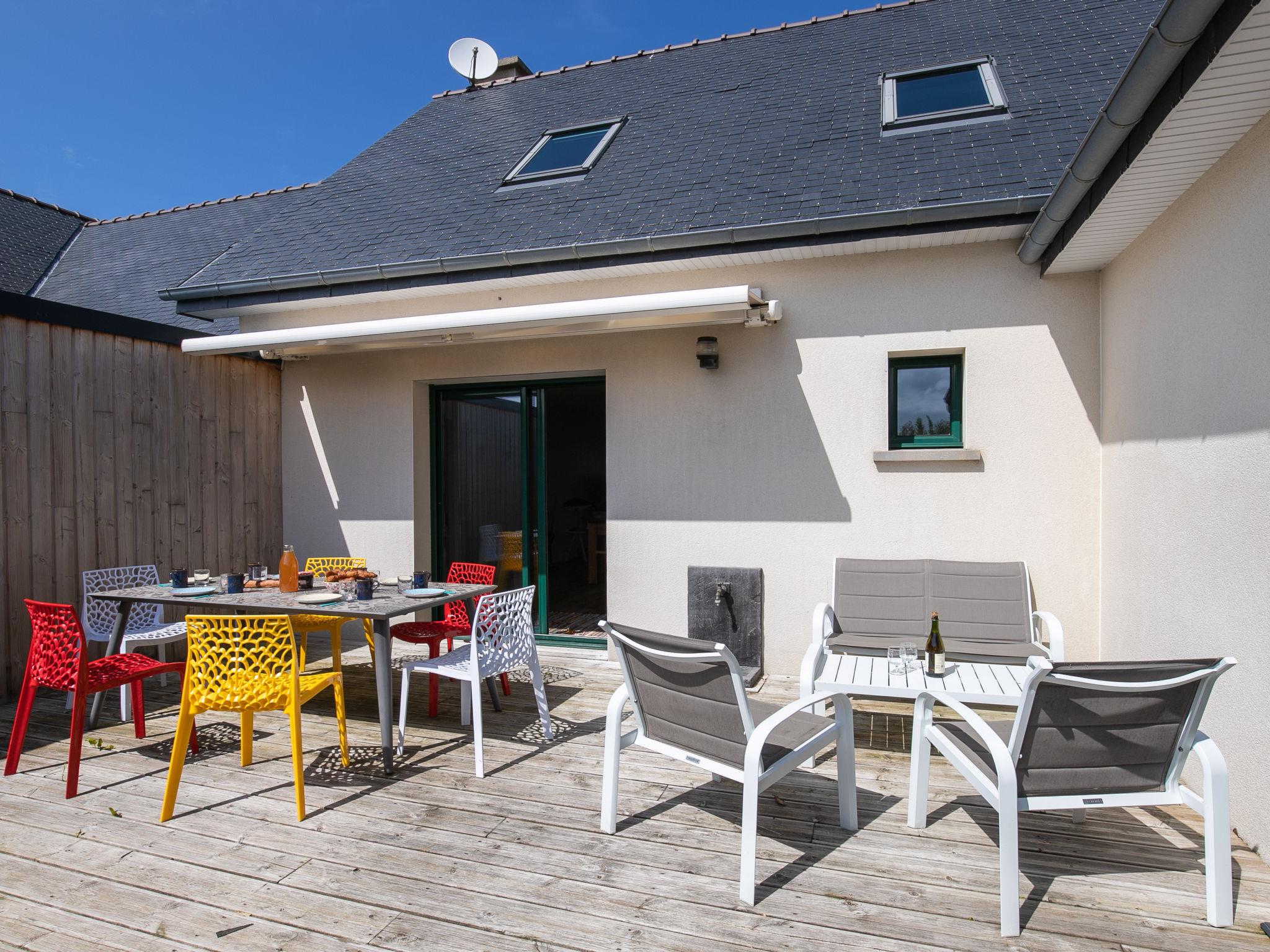 "Ty Mat", 5-room house 80 m2. Fully renovated in 2022, beautiful and tasteful furnishings: large living/dining room with dining table, TV and flat screen. Exit to the terrace, to the swimming pool. Open kitchen (oven, dishwasher, 4 induction hot plates, toaster, kettle, microwave, electric coffee machine, Capsules for coffee machine (Philipps) extra). Sep. WC. Upper floor: 1 room with 1 french bed (160 cm, length 200 cm). 2 rooms, each room with 2 beds (90 cm, length 200 cm). Bath/shower, sep. WC, double hand-basin. Electric heating. Terrace 15 m2, south facing position. Terrace furniture, barbecue (portable), deck chairs (2). View of the sea. Facilities: washing machine, dryer, iron, children's high chair, baby cot for up to 2 year olds, hair dryer. Internet (WiFi, free). Please note: non-smoking house. Maximum 1 pet/ dog allowed. Smoke alarm. Offer by a private individual according to Art. 155, IV of CGI.