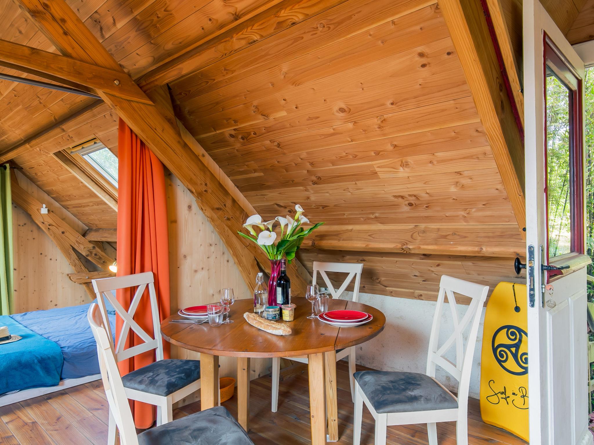 "La Part des Anges", 1-room apartment 55 m2. Object suitable for 2 adults + 1 child. Renovated in 2019, cosy and wooden furniture furnishings: living/dining room with sloping ceilings with rooflight with Scandinavian wood stove, dining table, satellite TV, international TV channels, radio and DVD. 1 open room with sloping ceilings with rooflight with 1 bed (80 cm, length 190 cm), 1 french bed (180 cm, length 200 cm), hand-basin and shower. Open kitchen (oven, 4 gas rings, toaster, kettle, microwave, electric coffee machine). Sep. WC. Electric heating. Parquet floors. Barbecue (portable), deck chairs (2), sitting area, box-room. View of the countryside. Facilities: children's high chair, baby cot. Internet (WiFi, free). Please note: non-smokers only. Private entrance. Information: beds at ground level.