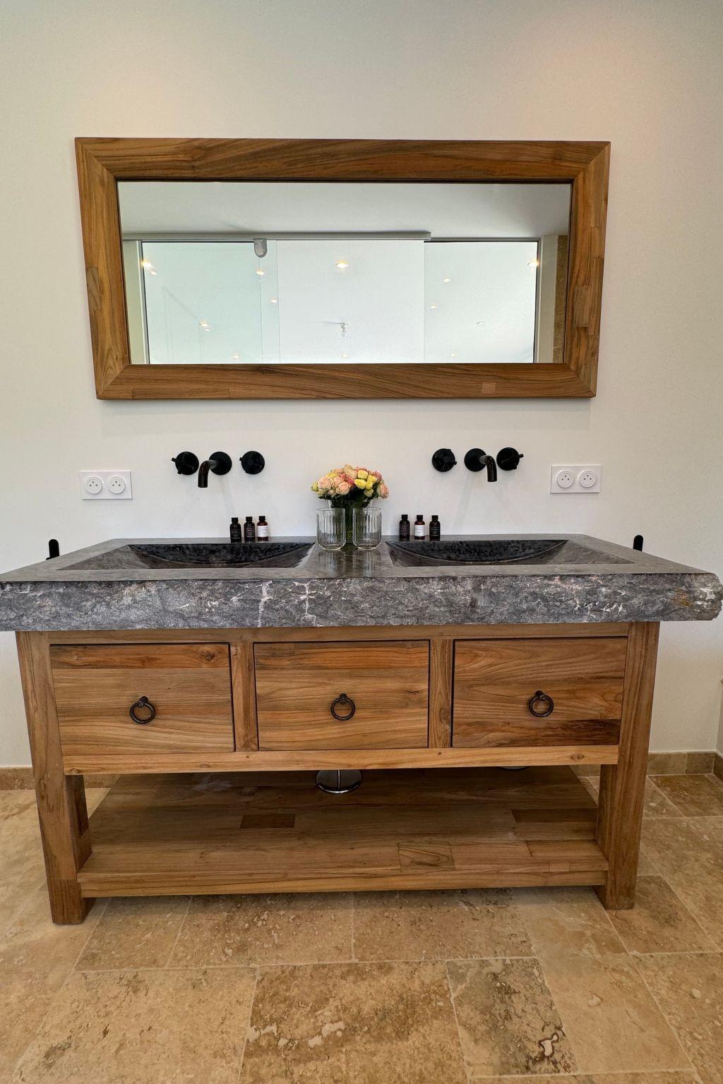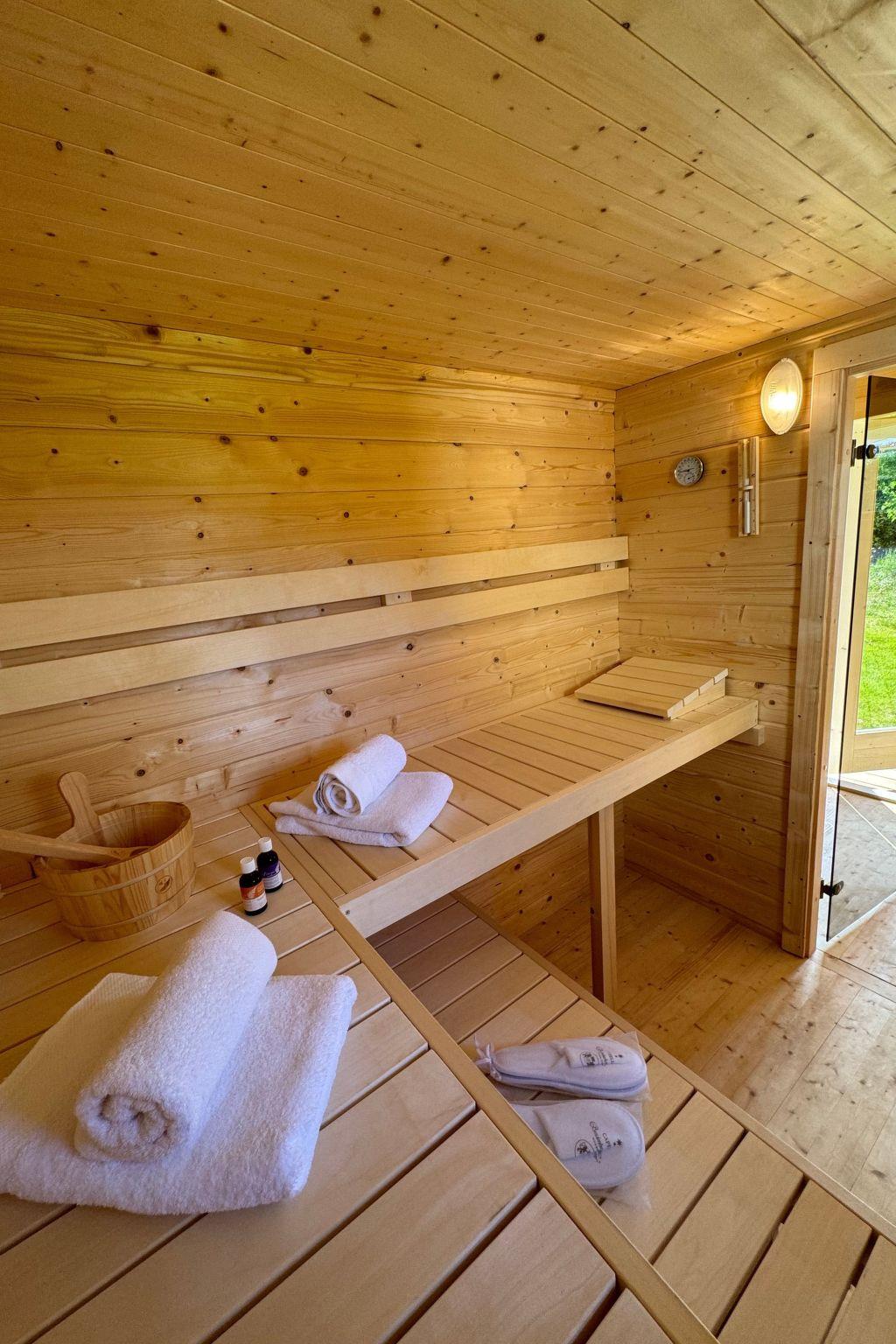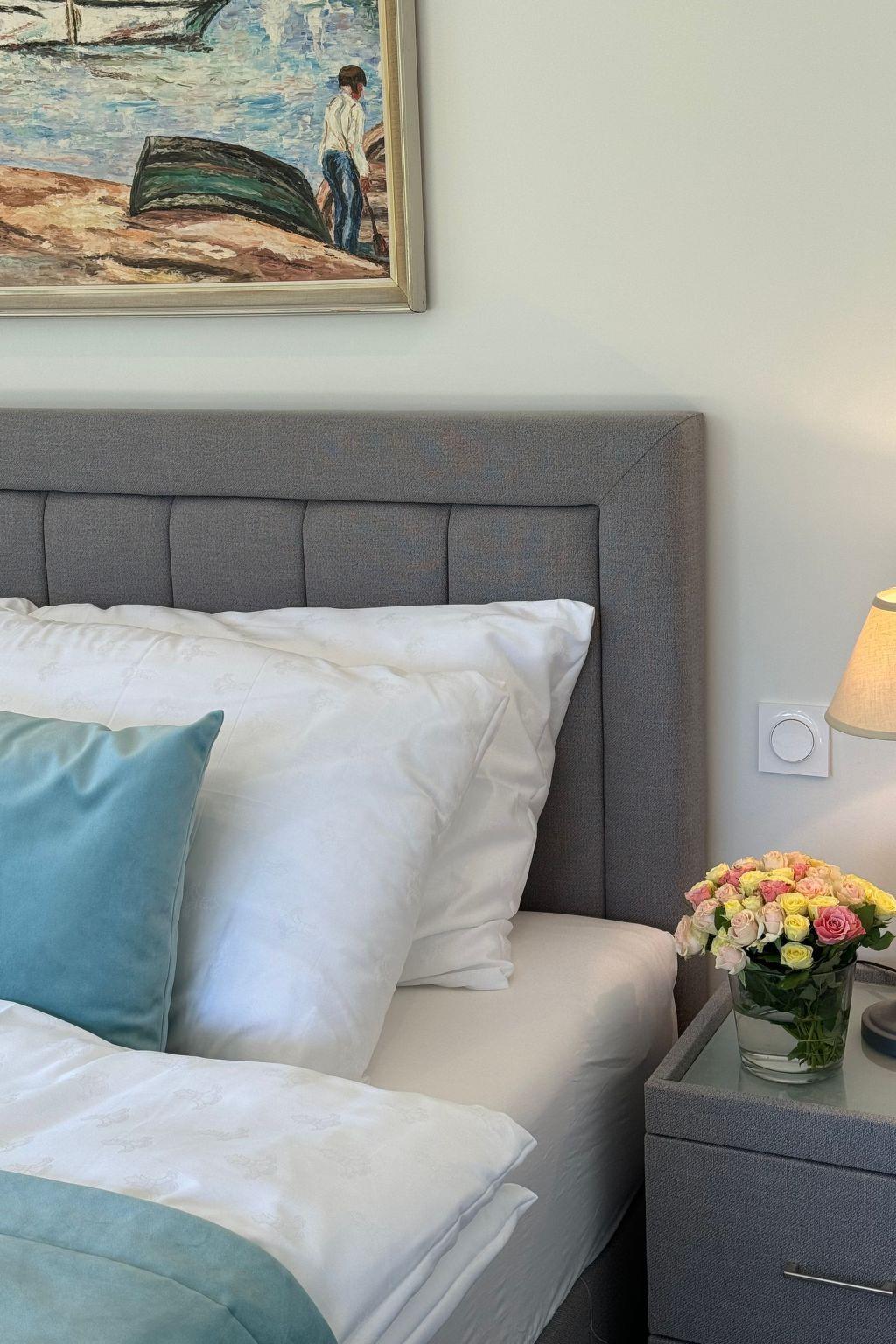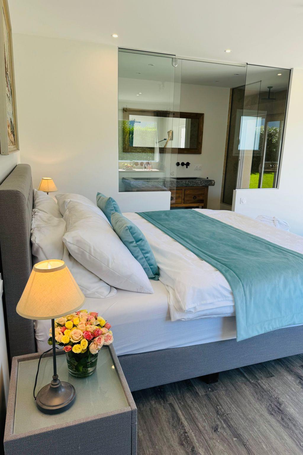 The beach house "entre deux plages" has been completely renovated and has been awarded an incredible 5 stars in the classification! The house was sufficiently insulated and underfloor heating was installed - the entire technology was replaced. Now the house shines with a new extension in which the large master bedroom is located / travertine bathroom with shower + WC and granite washbasin en suite! The highlight - the large, bright room is connected at ground level only by large sliding glass doors to the sun terrace with direct access to the jacuzzi and sauna - incidentally also a great bedroom for guests who have their four-legged friend with them - the sliding door opens directly into the large garden. The second highlight created by the new extension is another sun terrace on a higher level with wonderful sea views. This terrace is accessed from an almost separate, second sleeping area on the upper floor - this consists of the second beautiful, large bedroom with its own travertine bathroom (en suite) - shower and WC and a huge granite washbasin. A small library is attached to this area - with direct access to the sea view terrace.