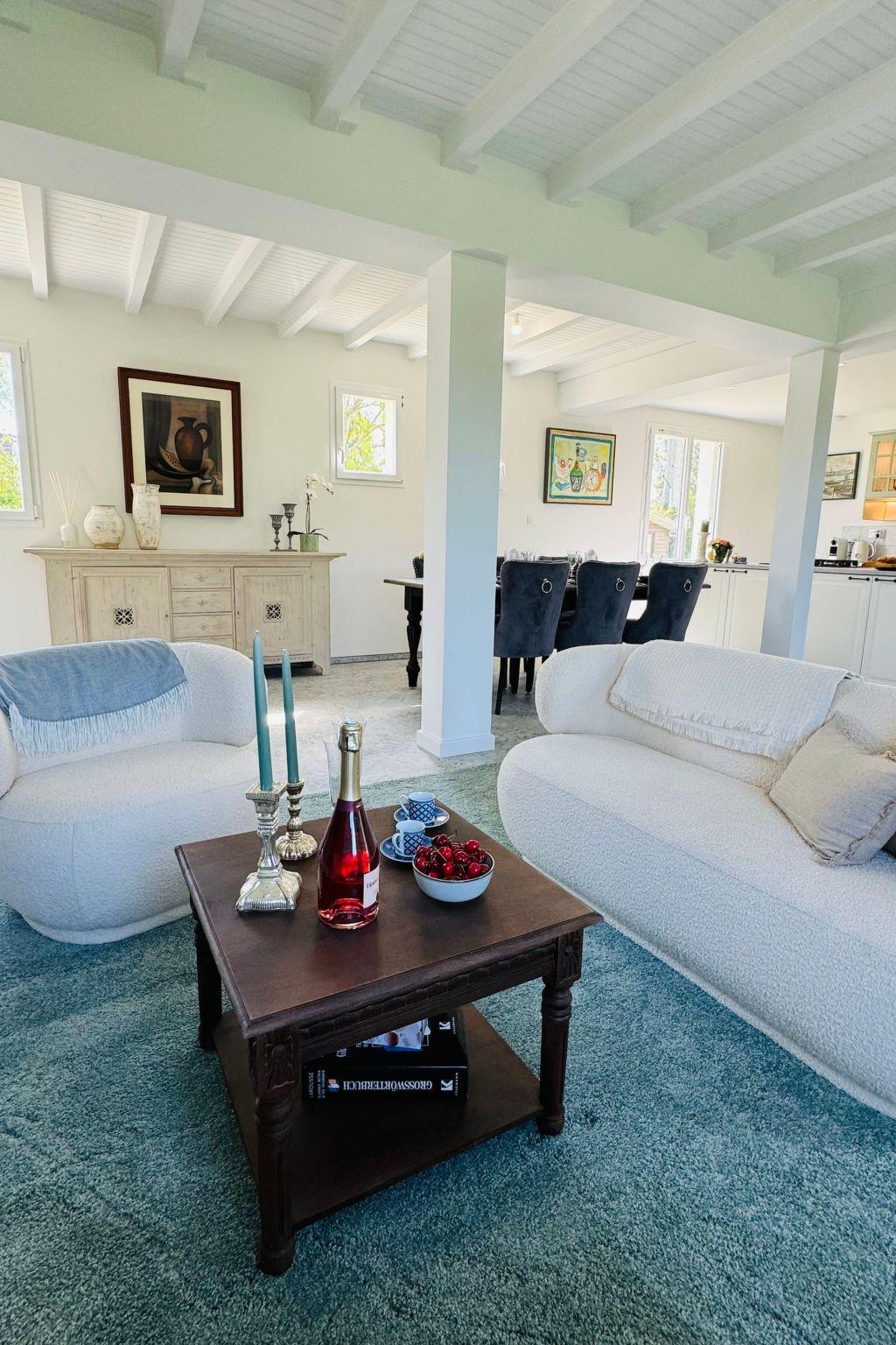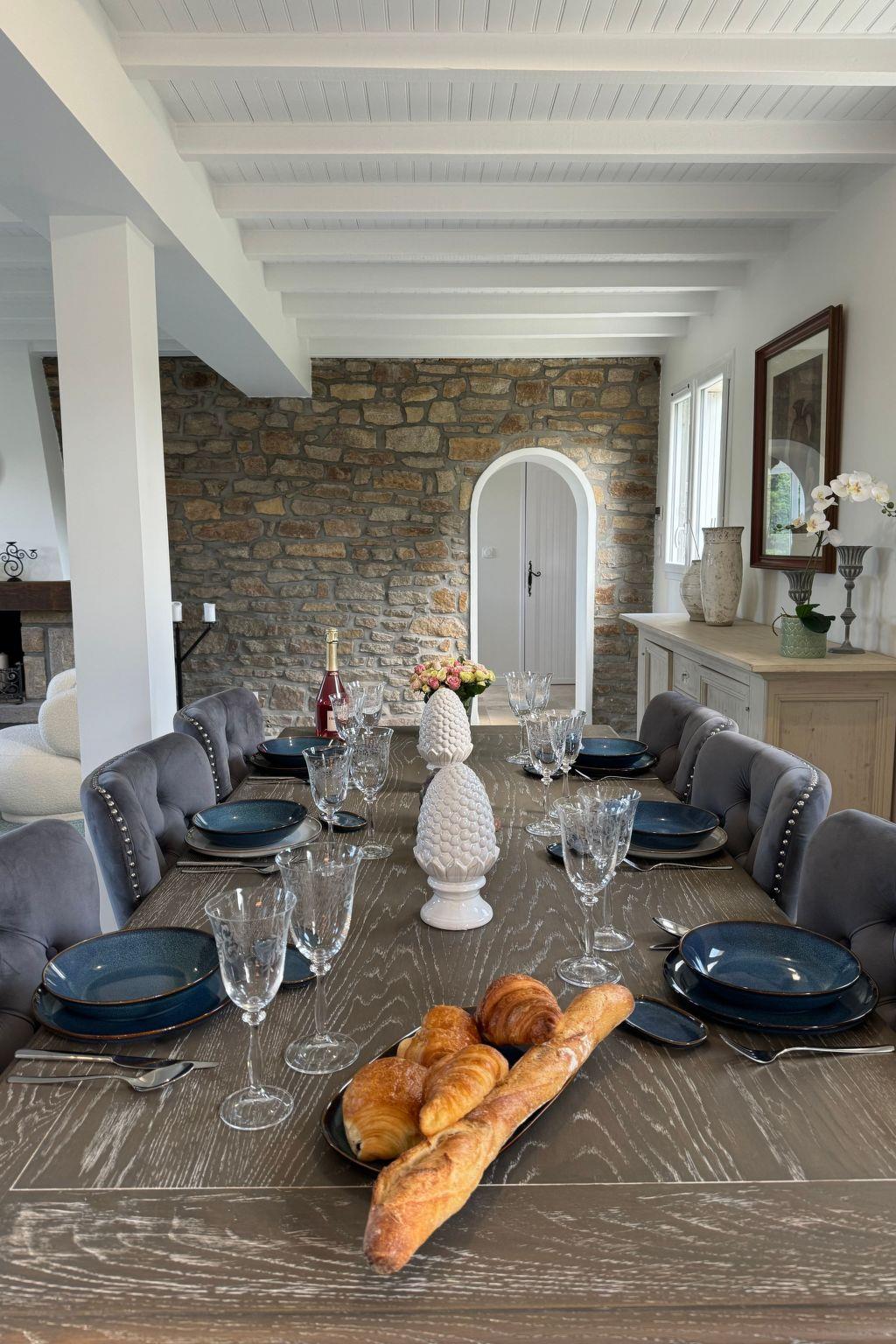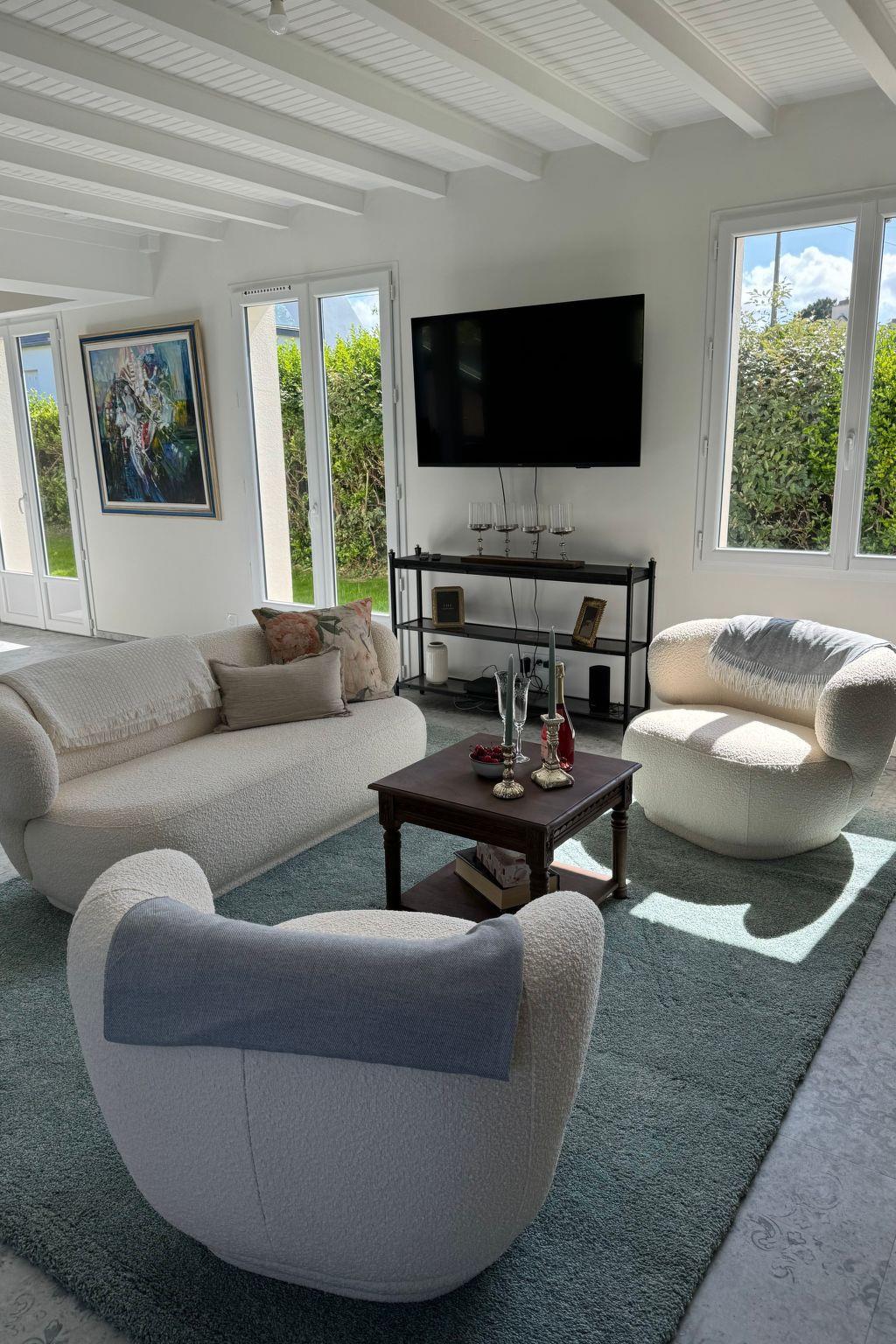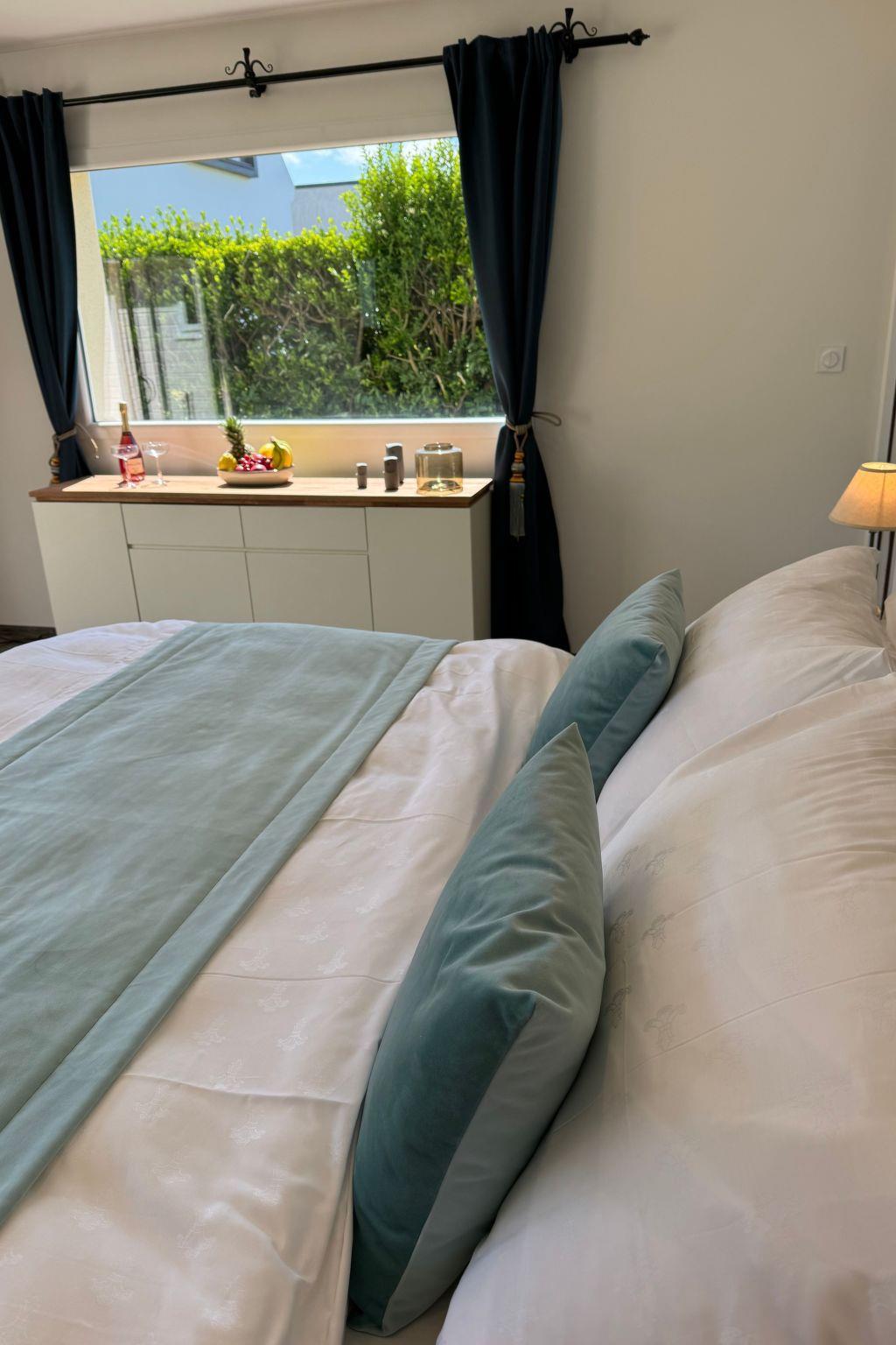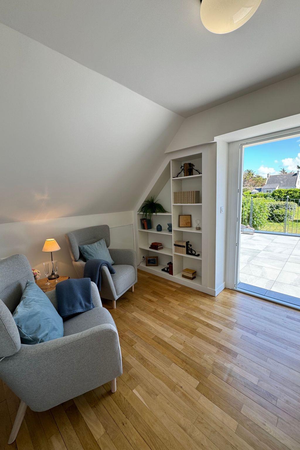 The heart of the house is the large living, dining and cooking area of approx. 60 m², which is accessed via a pretty entrance area with cloakroom - where the guest WC is also located (it is worth mentioning ..... that the washbasin in the WC is cut from a block of granite and weighs over 350 kg). The living area is very open-plan, the kitchen offers plenty of space to cook up a culinary storm and of course there is an extra wine fridge. There is a large dining table and a sofa and armchair combination in front of the Breton granite fireplace. The house has fibre optic internet; for those who love fast internet or need it for business. Very important is of course the beautiful and very quiet location right between two beautiful nearby sandy beaches - one on the left from the entrance gate 60 metres away - and the other on the right 50 metres away.