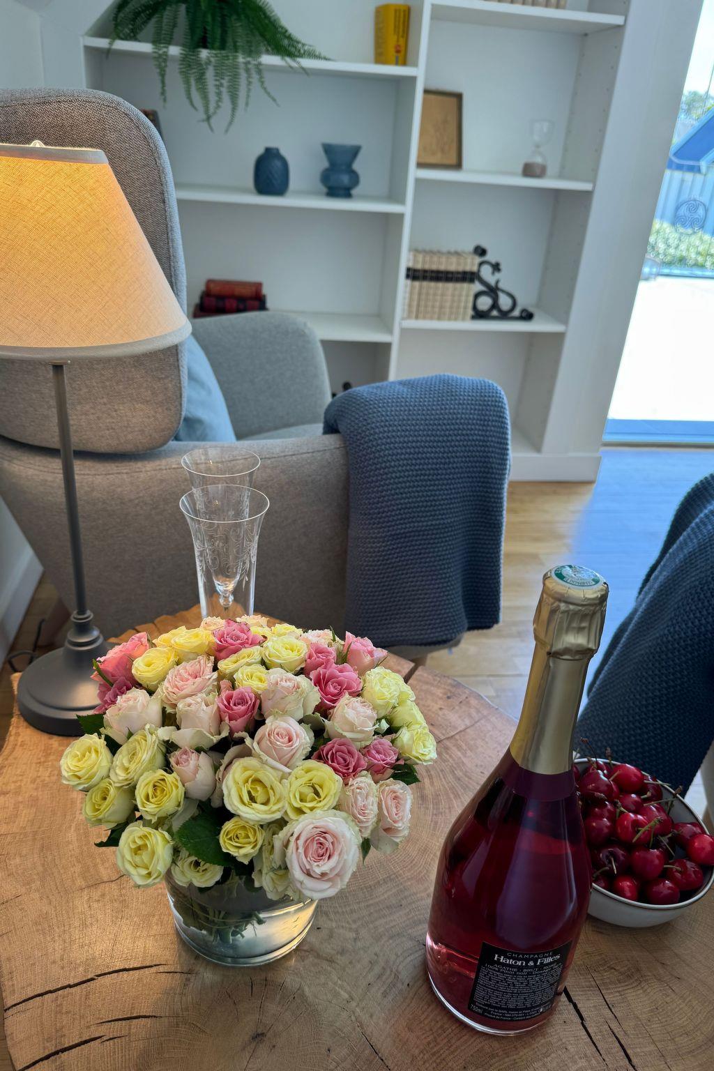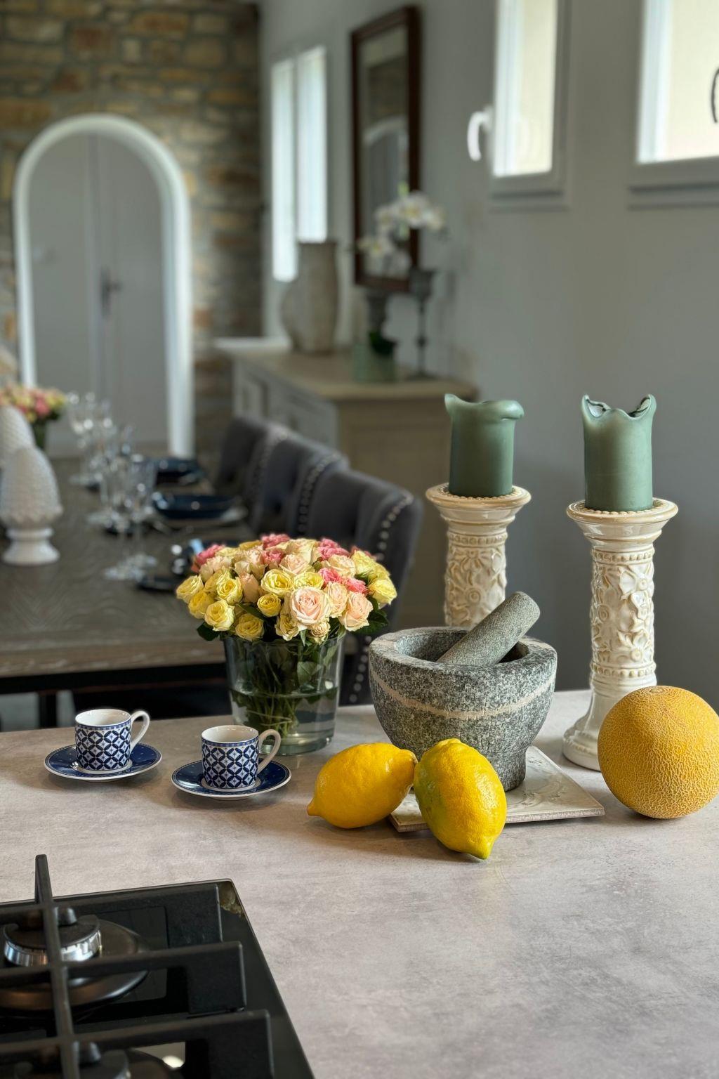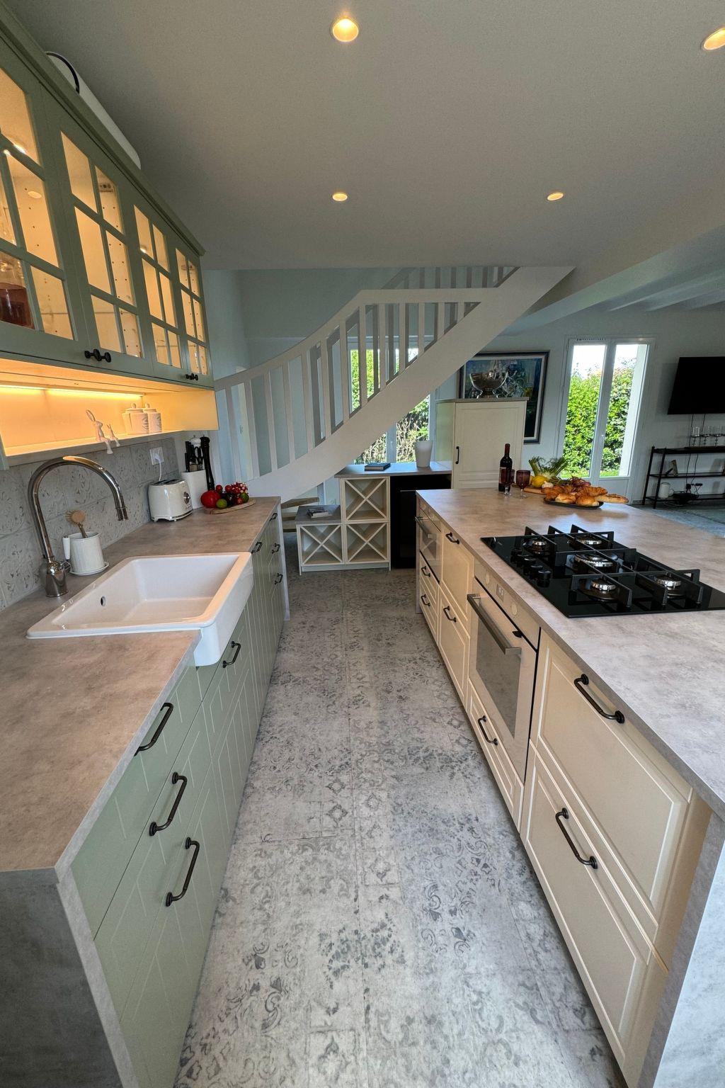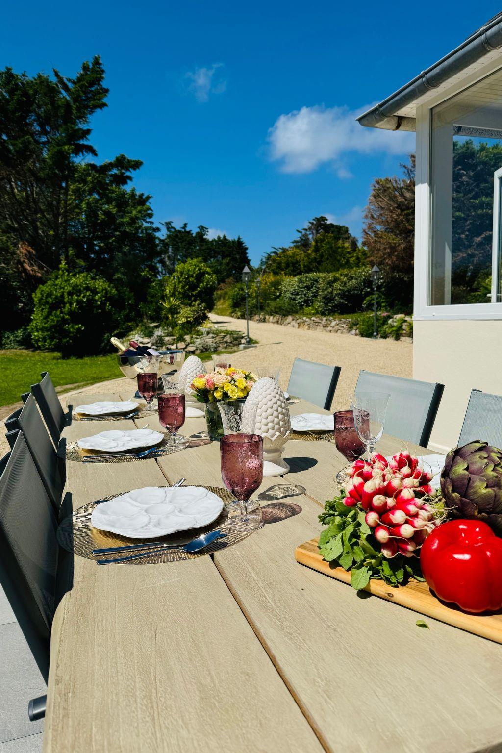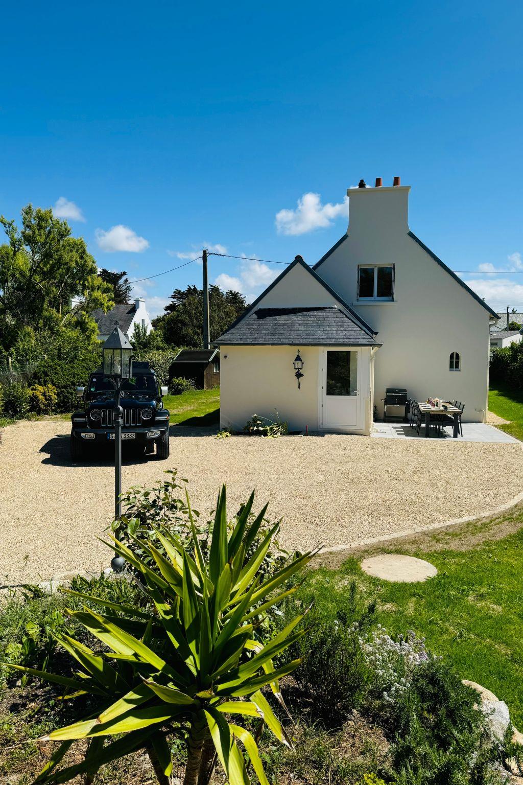 The heart of the house is the large living, dining and cooking area of approx. 60 m², which is accessed via a pretty entrance area with cloakroom - where the guest WC is also located (it is worth mentioning ..... that the washbasin in the WC is cut from a block of granite and weighs over 350 kg). The living area is very open-plan, the kitchen offers plenty of space to cook up a culinary storm and of course there is an extra wine fridge. There is a large dining table and a sofa and armchair combination in front of the Breton granite fireplace. The house has fibre optic internet; for those who love fast internet or need it for business. Very important is of course the beautiful and very quiet location right between two beautiful nearby sandy beaches - one on the left from the entrance gate 60 metres away - and the other on the right 50 metres away.