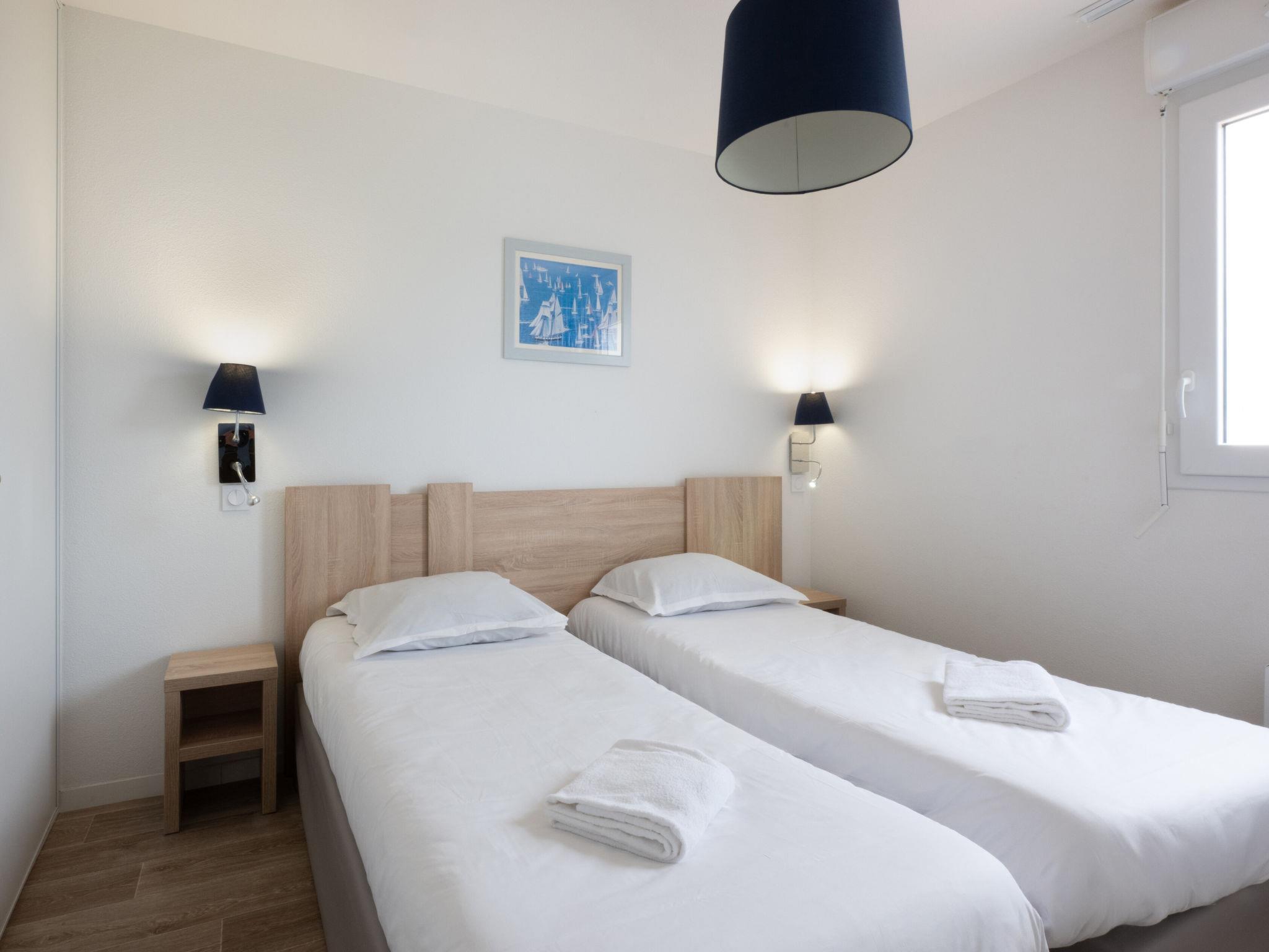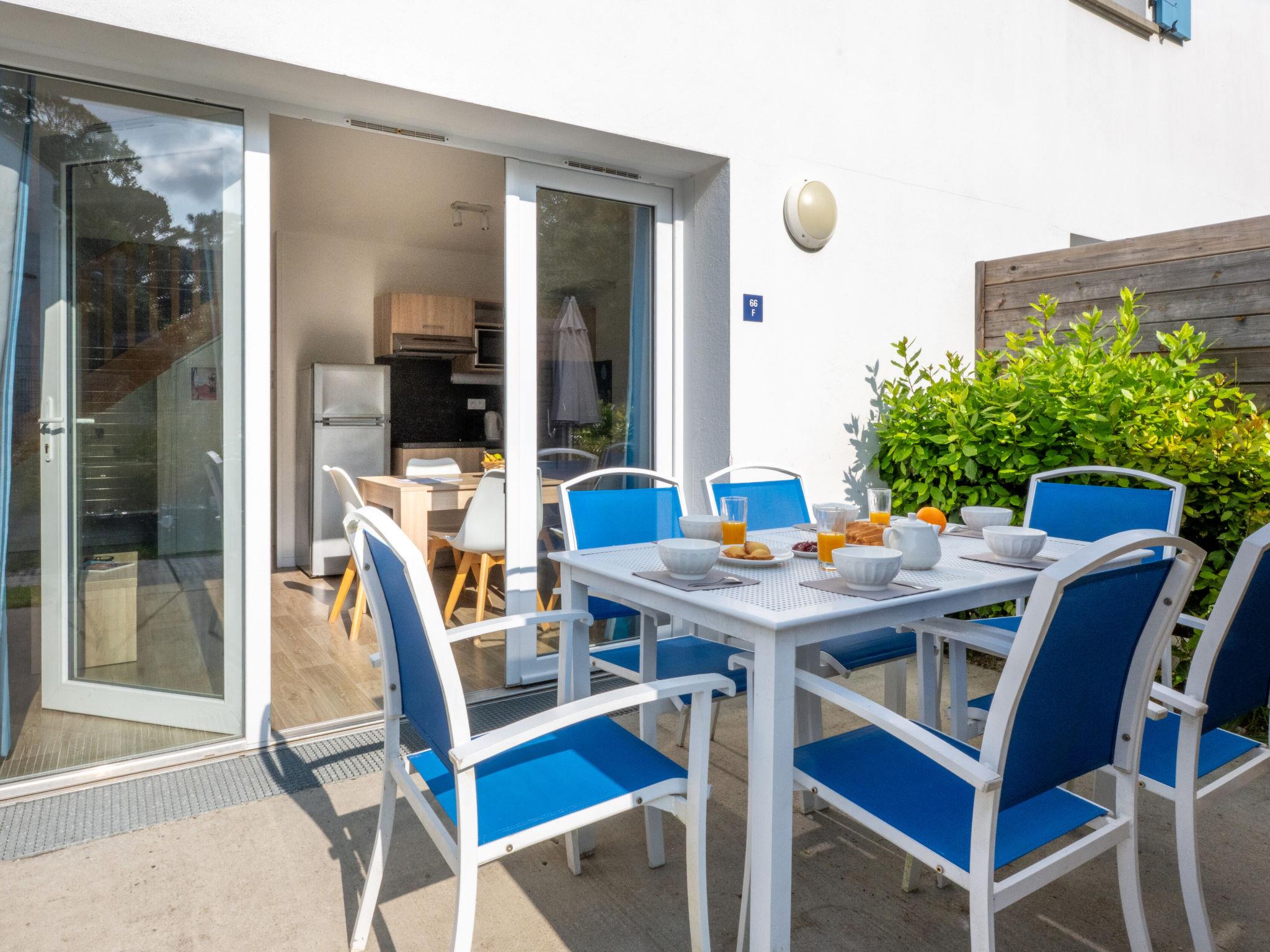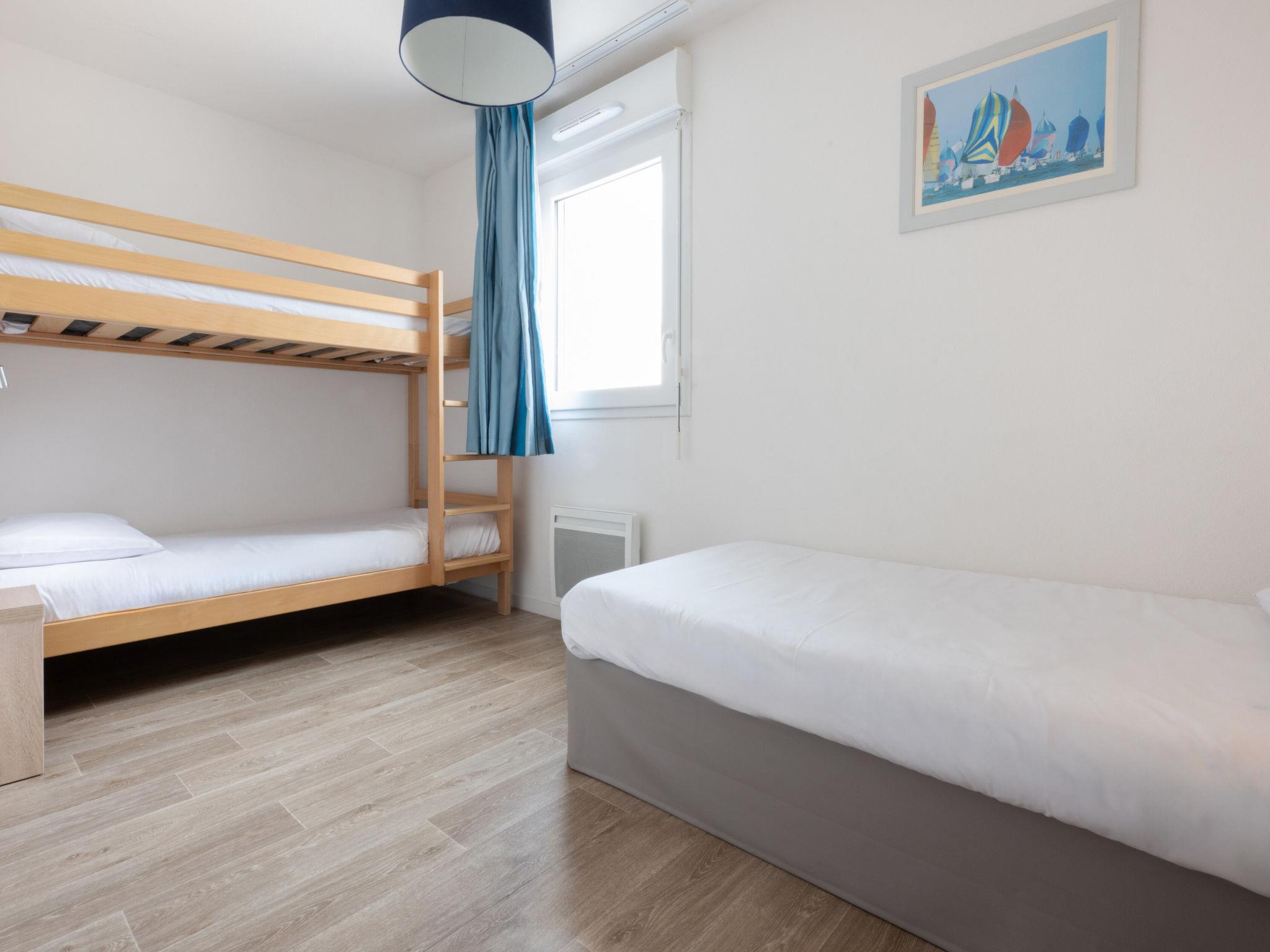 " Odalys Collection Le Domaine des Pins", 3-room apartment 56 m2 on 2 levels. Modern furnishings: living/sleeping room with 1 bed, 1 double sofabed, dining table and satellite TV (flat screen). Open kitchen (dishwasher, 4 ceramic glass hob hotplates, toaster, kettle, electric coffee machine, combination microwave). Upper floor: 1 double bedroom. 1 room with 1 x 2 bunk beds. Bath/WC. Electric heating. Balcony or terrace. Balcony furniture. Facilities: children's high chair, baby cot, hair dryer. Internet (WiFi, free). Parking. Please note: non-smokers only. Maximum 2 pets/ dogs allowed. Smoke alarm, fire extinguisher.