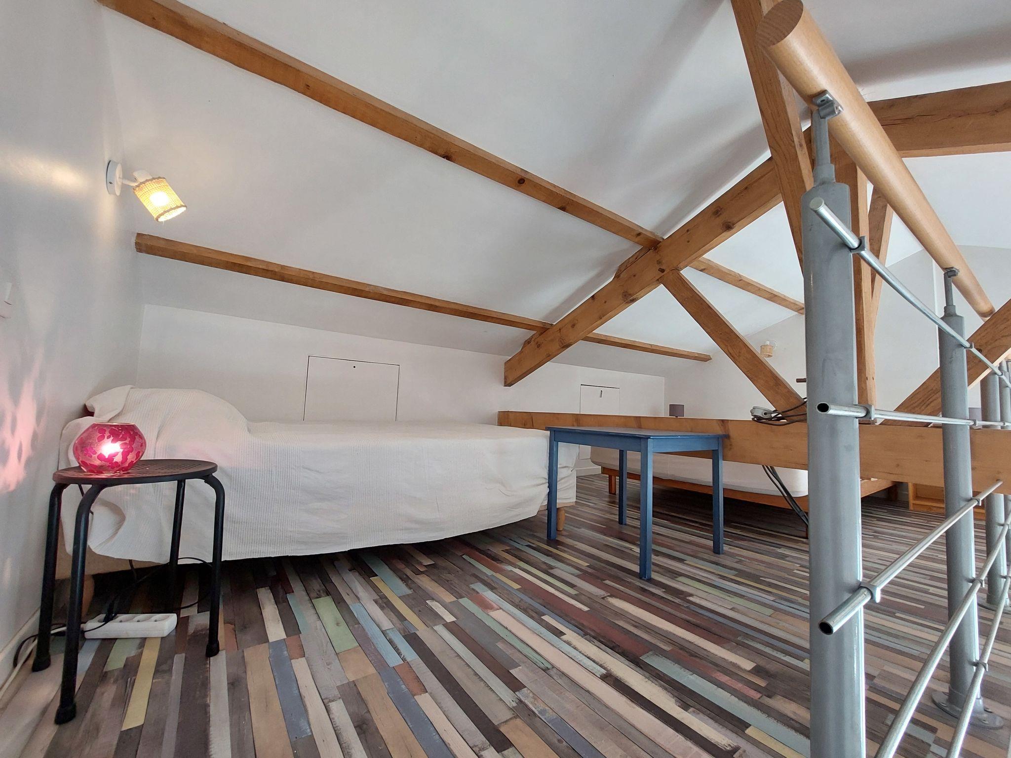 "Les Galivades", 2-room terraced house 35 m2, lower ground floor. Fully renovated in 2025, beautiful furnishings: living/dining room with 1 sofabed (130 cm, length 190 cm), dining nook and kitchen corner. Exit to the terrace. 1 room with 1 french bed (160 cm, length 200 cm). Exit to the garden. Kitchenette (oven, 2 induction hot plates, toaster, kettle, microwave, freezer, electric coffee machine). Shower/WC. Electric heating. Upper floor: (ladder) open gallery with sloping ceilings, ceiling height 140 - 180 cm with 1 bed (130 cm, length 190 cm). Terrace, south-west facing position. Terrace furniture, electric barbecue (portable). Facilities: iron. Internet (WiFi, free). Please note: not suitable for small children. Non-smokers only. Smoke alarm. Offer by a private individual according to Art. 155, IV of CGI. 851630002728D