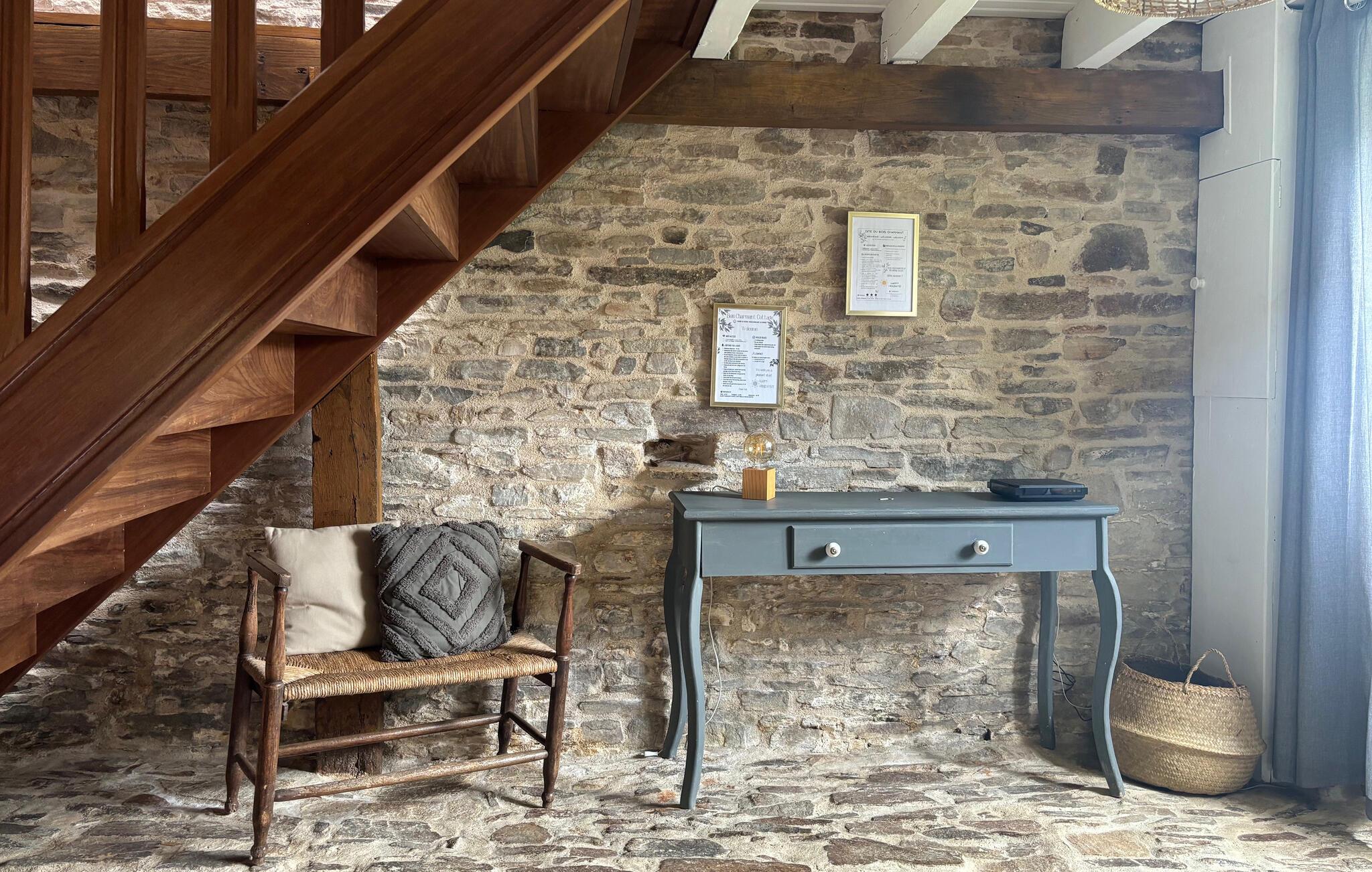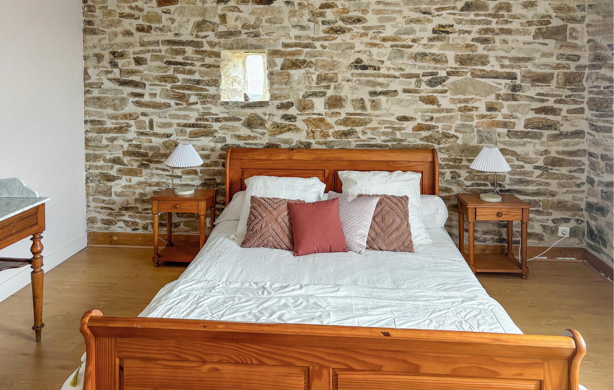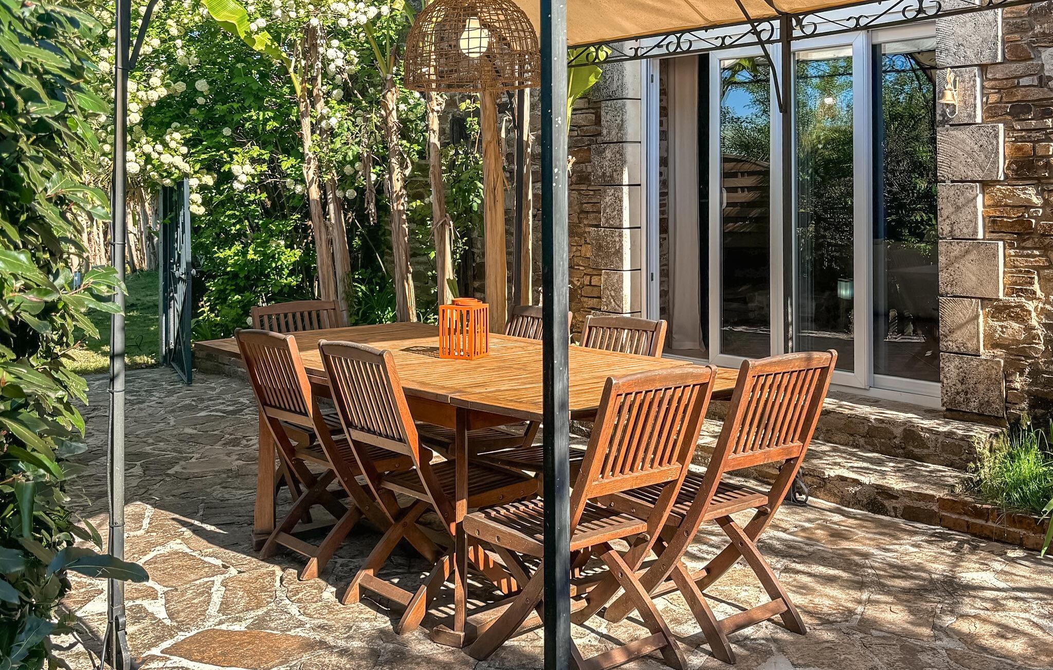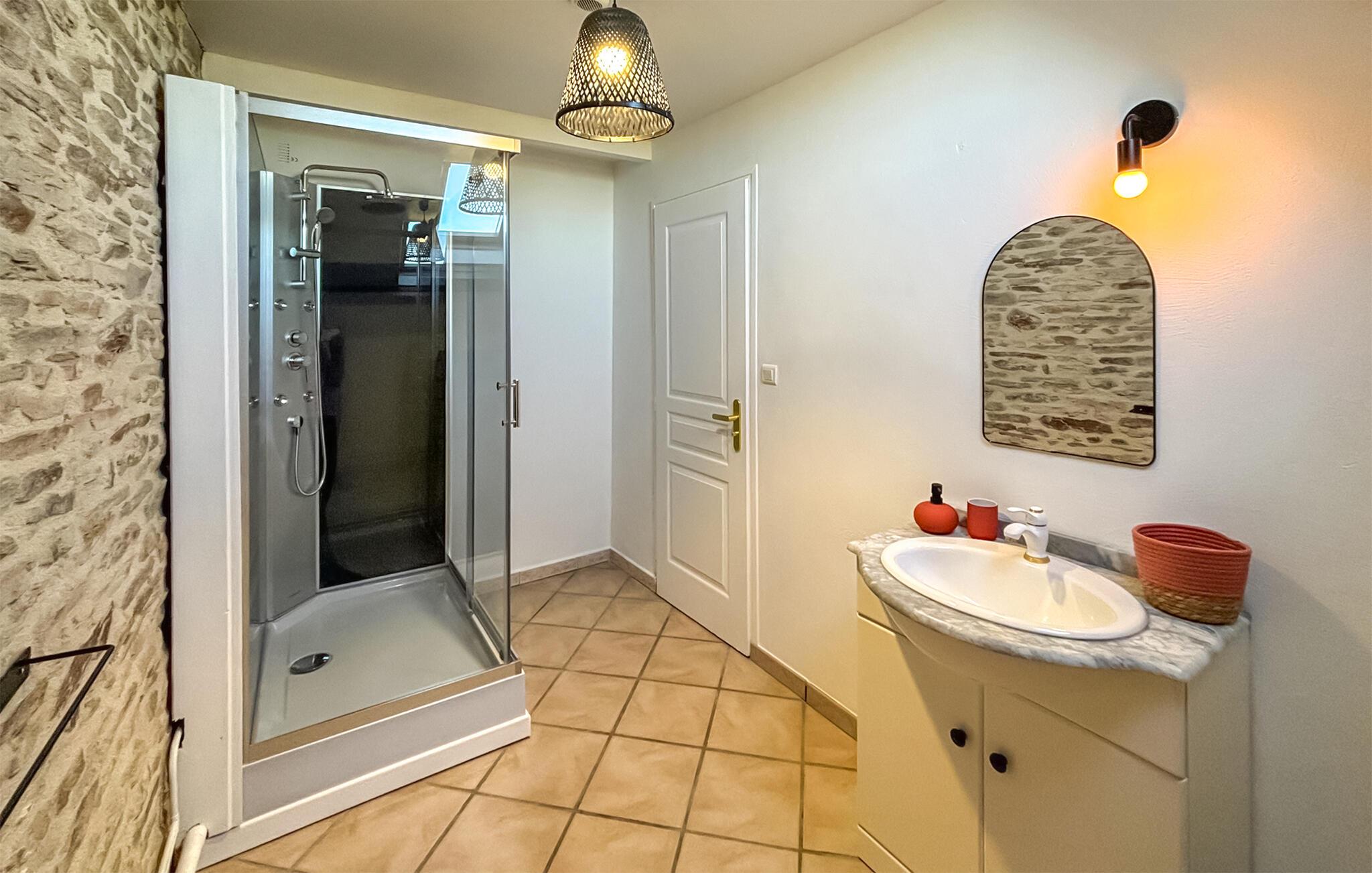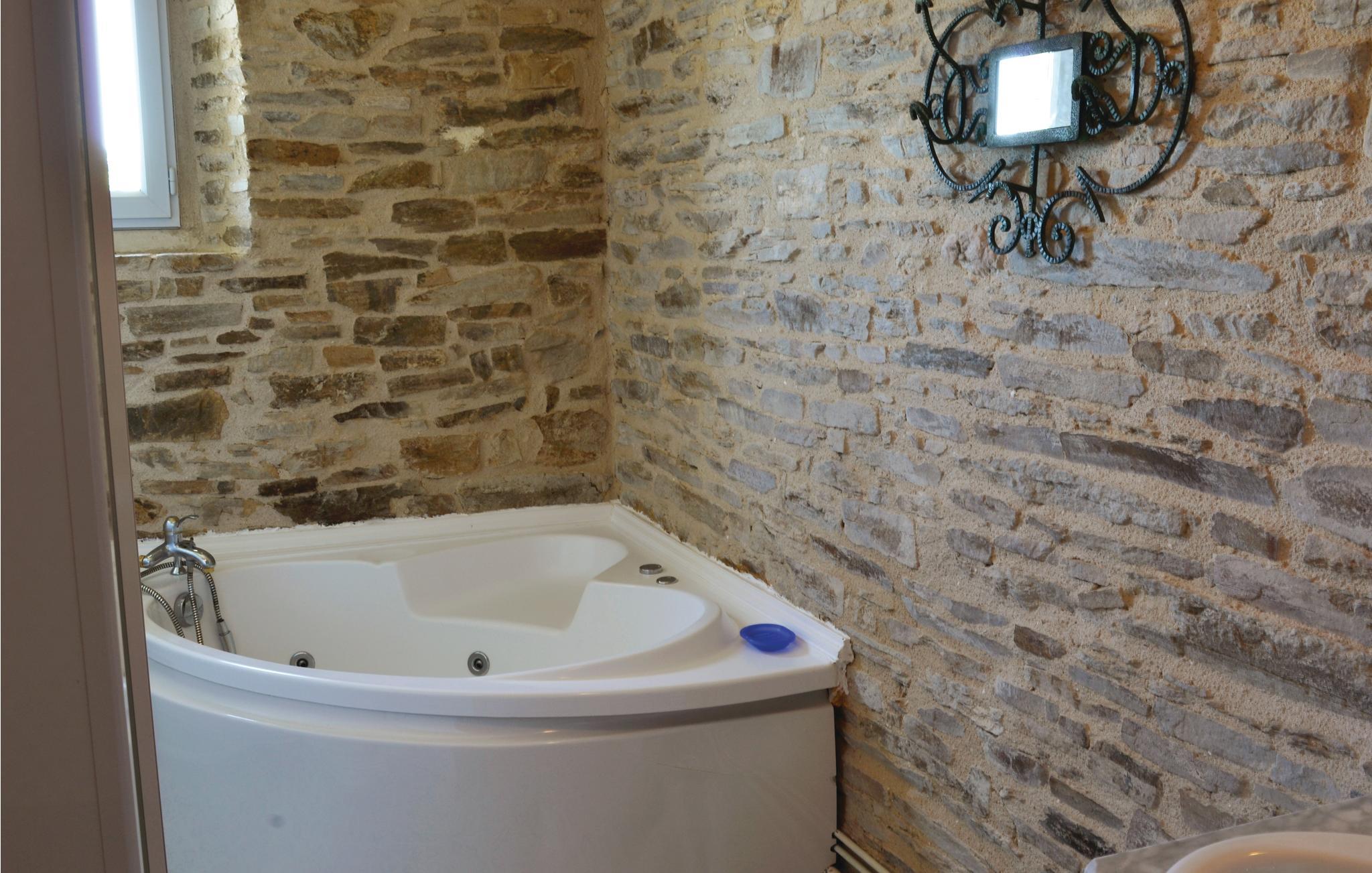 Ejendommen har egen pool, massage bruser og jacuzzi, så her er rig mulighed for både leg og wellness. Huset har beholdt sine gamle karakteristiske træk med flisegulve, bjælkeloft og rå stenvægge, der giver stedet masser af charme og sjæl. Udenfor er der en hyggelig terrasse, hvorfra der er udsigt til markerne i nærheden, hvor ejerens får græsser.