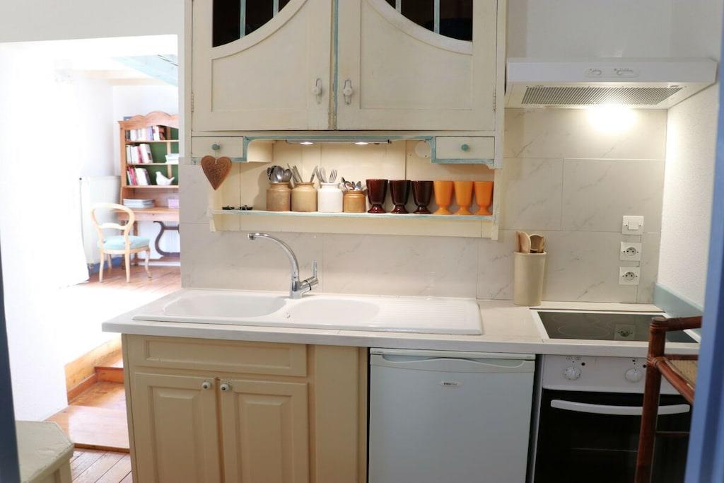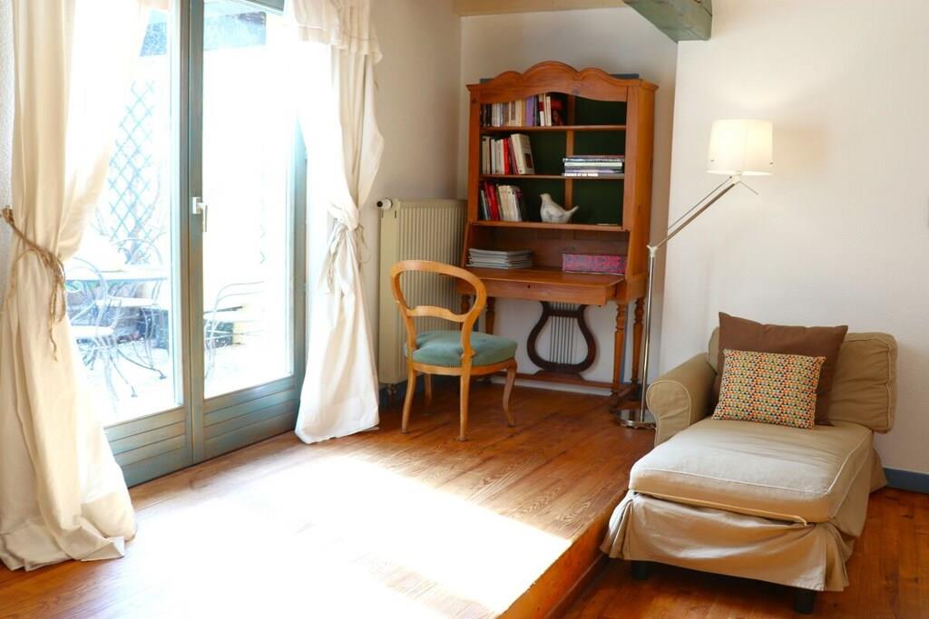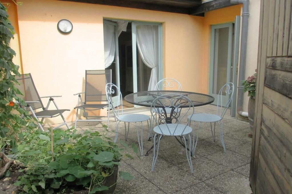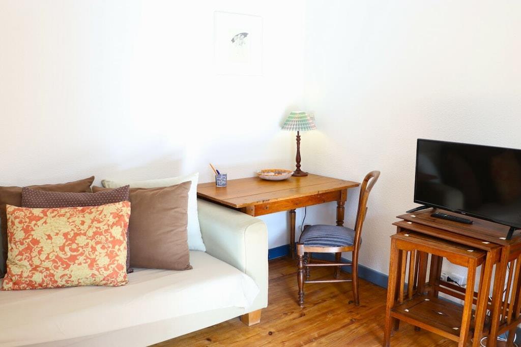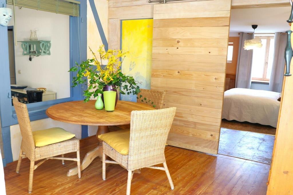 En lille, charmerende lejlighed med et soveværelse og privat terrasse til en meget privat og fredelig ferie. Denne lejlighed er husets mest hemmelige, svær at finde, men meget romantisk. Den er også velegnet til et ophold med en baby eller et lille barn. Gulvene er vokset træ, møblerne er omhyggeligt udvalgt, og atmosfæren er blød og solrig. Soveværelset er separat, østvendt og er også en del af et separat rum med bruser og håndvask. Toilettet er separat. Køkkenet er veludstyret, og stuen er meget rummelig, selv til at arbejde i, hvis man har brug for det (fiberoptisk internetadgang). Pluspunktet er den private gårdhave, som giver mulighed for diskretion, og lige rundt om hjørnet ligger vingårdens fælles have med træer, græs og en dam, og lige rundt om hjørnet ligger vandre- og cykelstierne.