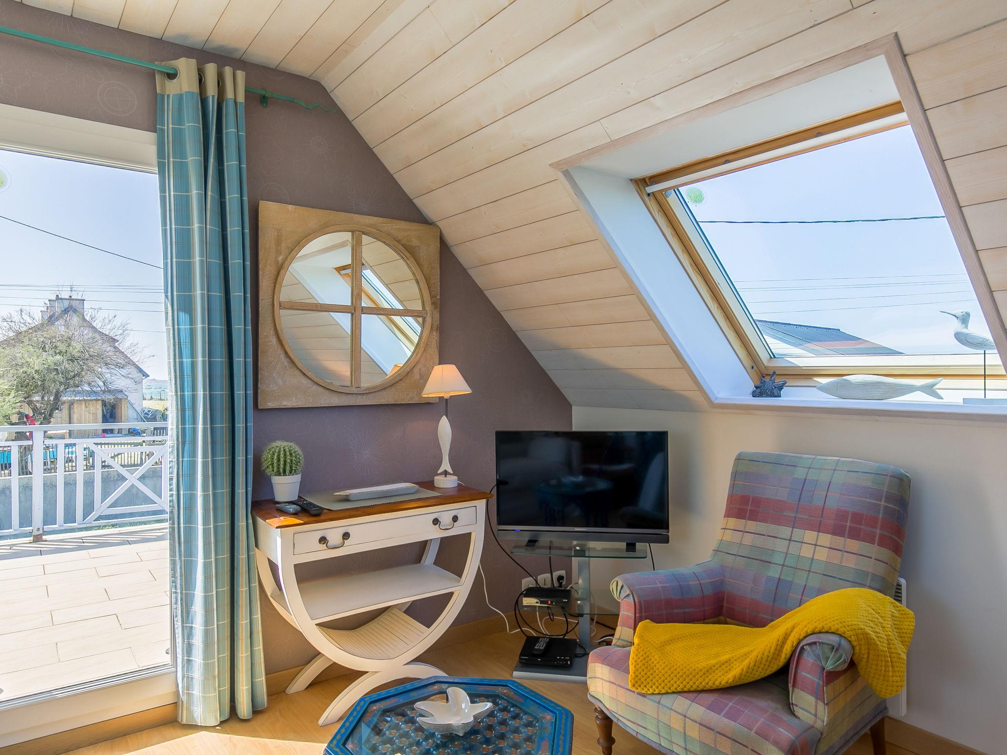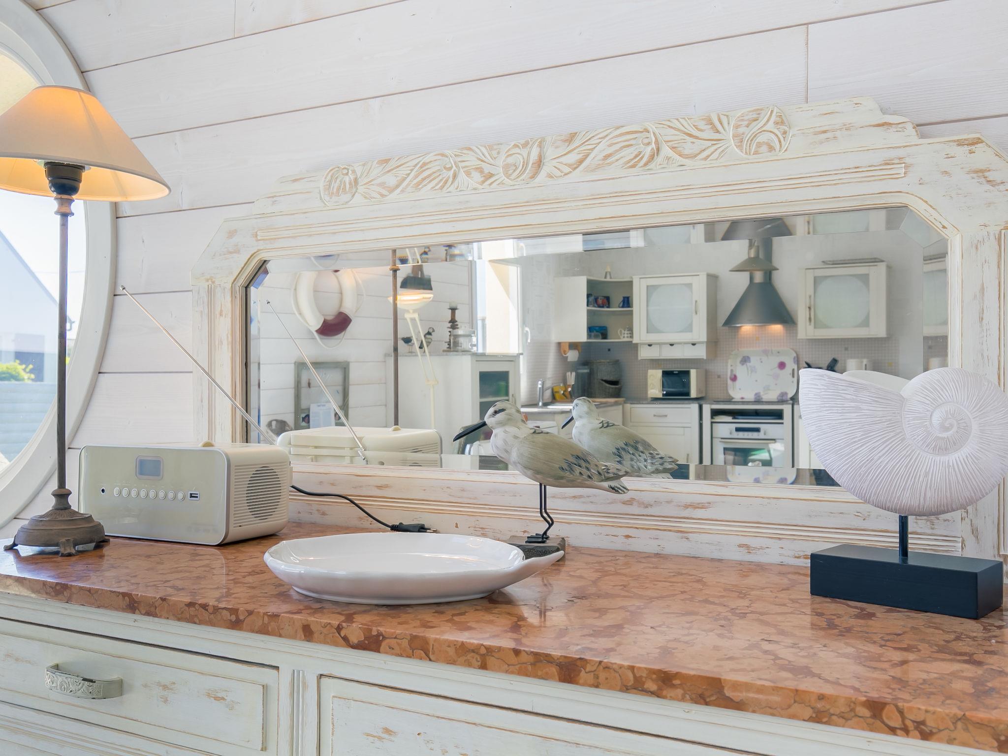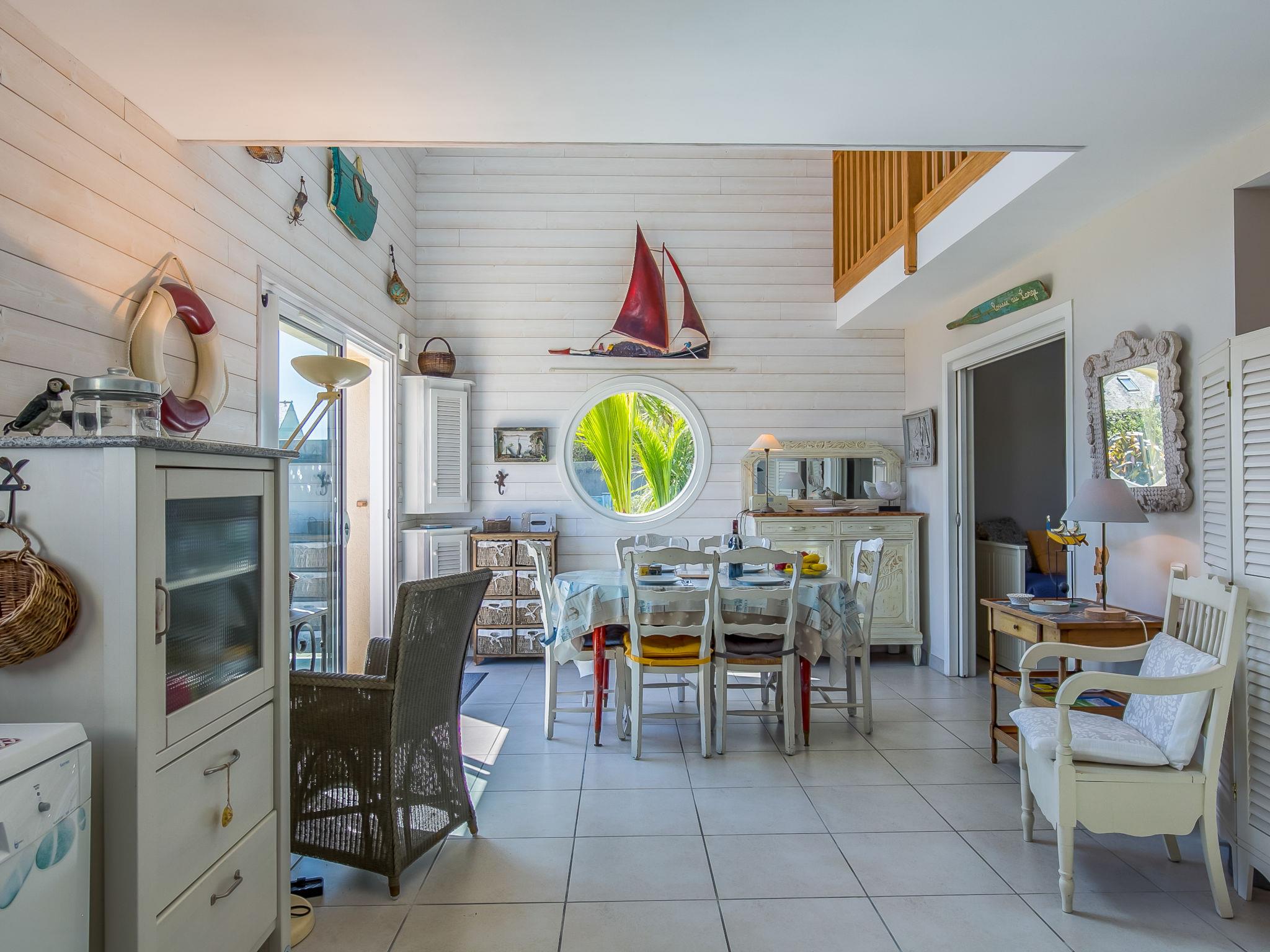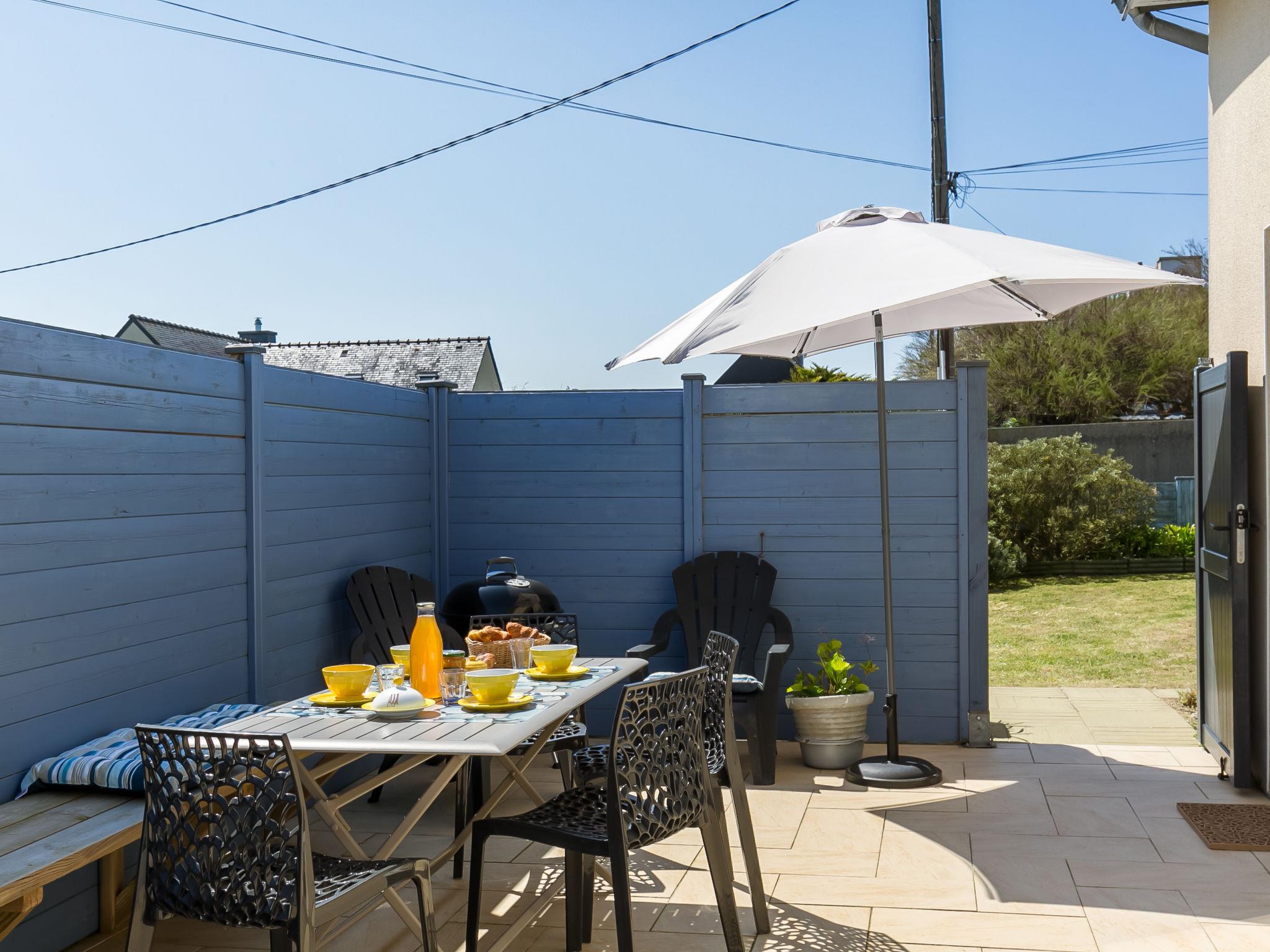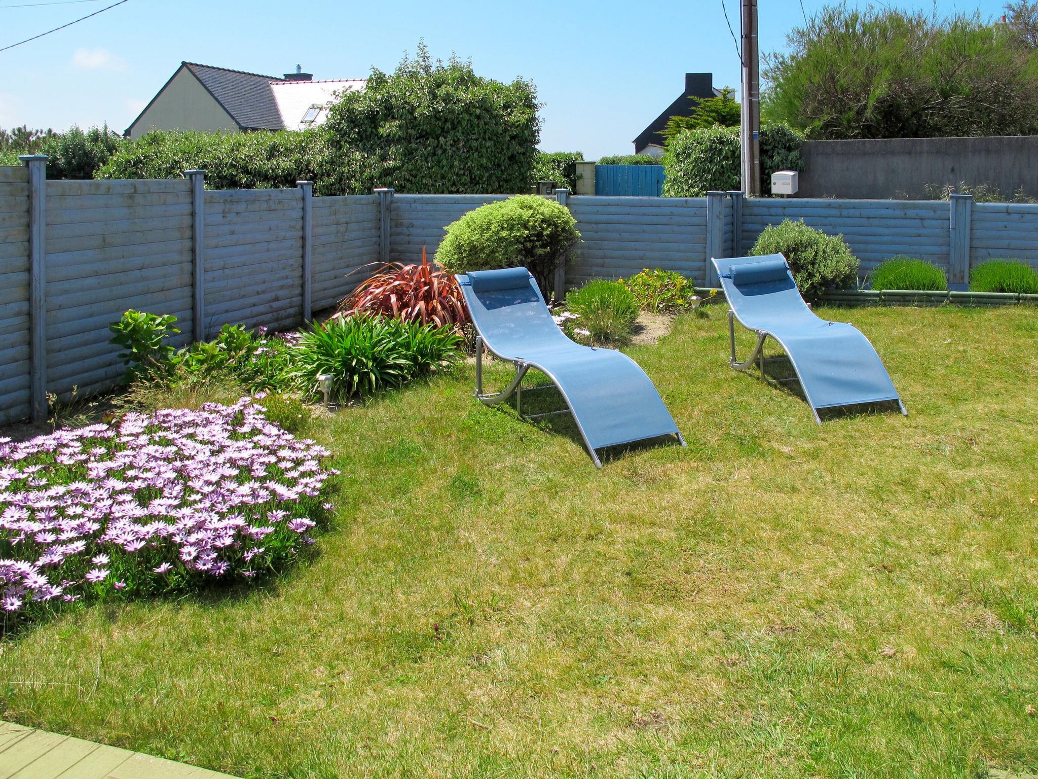 "Penn an Aod", 4-room semi-detached house 75 m2 on 2 levels. Bright, tasteful and cosy furnishings: living/dining room with dining table, satellite TV, radio, CD-player and DVD. Exit to the terrace. 1 room with sliding door with 1 pull-out bed (2 x 80 cm, length 190 cm). Open kitchen (oven, dishwasher, 3 induction hot plates, toaster, kettle, microwave, freezer, electric coffee machine). Shower, sep. WC, double hand-basin. Electric heating. Upper floor: open living room with sloping ceilings with satellite TV, radio, CD-player and DVD. Exit to the balcony. 1 room with sloping ceilings with 2 beds (80 cm, length 190 cm). 1 room with sloping ceilings with 1 french bed (140 cm, length 190 cm). Parquet floors. Balcony, south-west facing position, terrace 20 m2, south-west facing position, garden 200 m2, lawn. Terrace furniture, balcony furniture, barbecue (portable), deck chairs (2), box-room. View of the sea. Facilities: washing machine, iron, children's high chair, baby cot. Please note: non-smoking house. Smoke alarm. Bed layout is flexible. There are more sleeping options available than the maximum number of people allowed which may, however, not be exceeded.