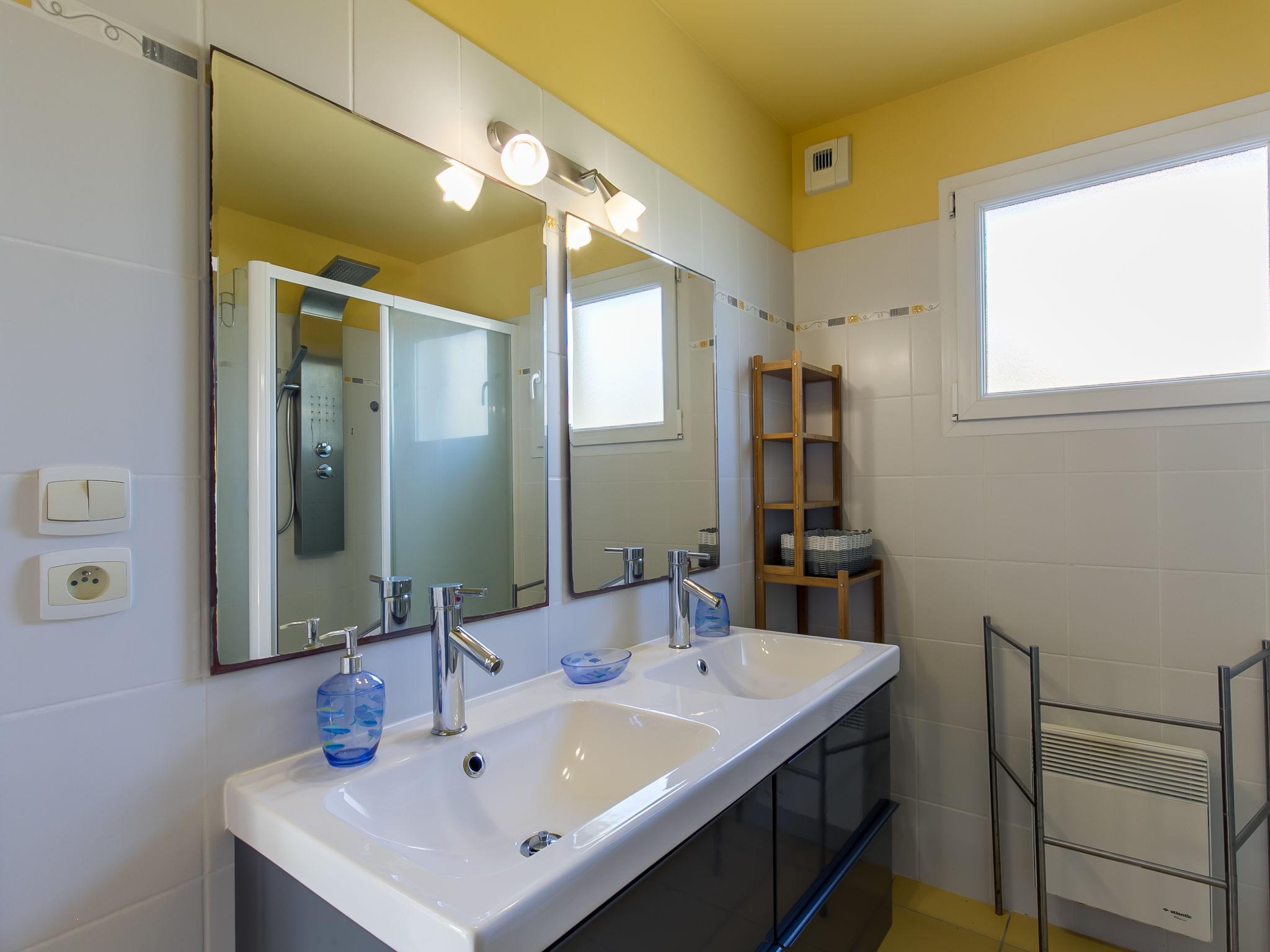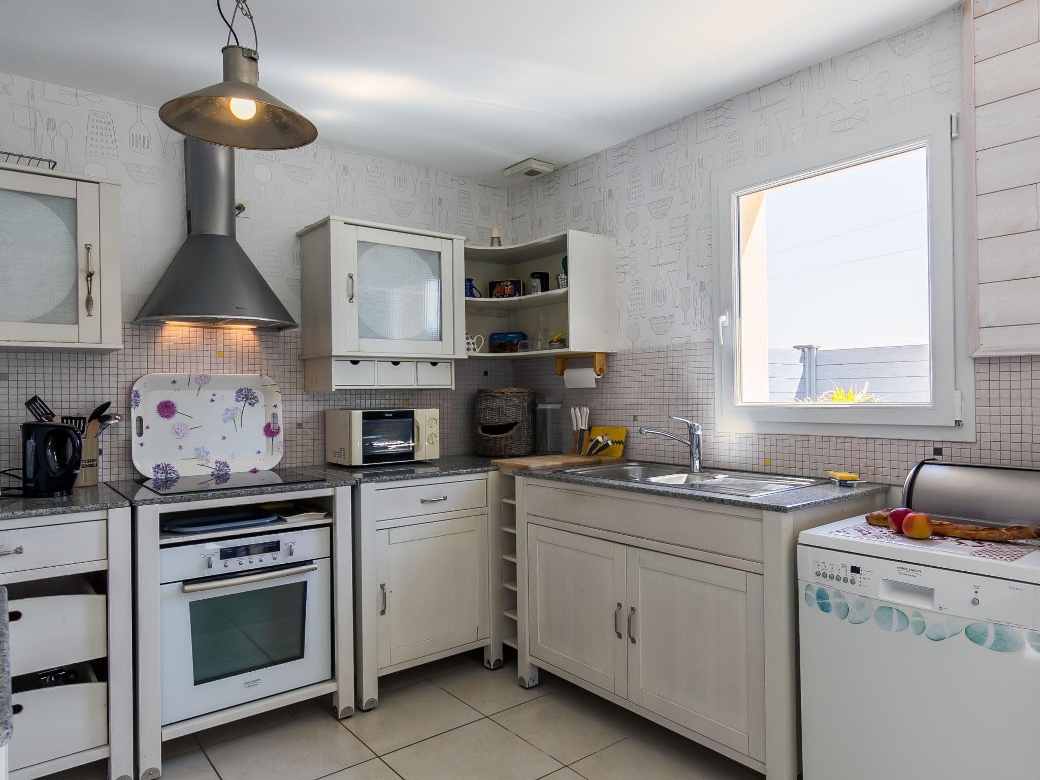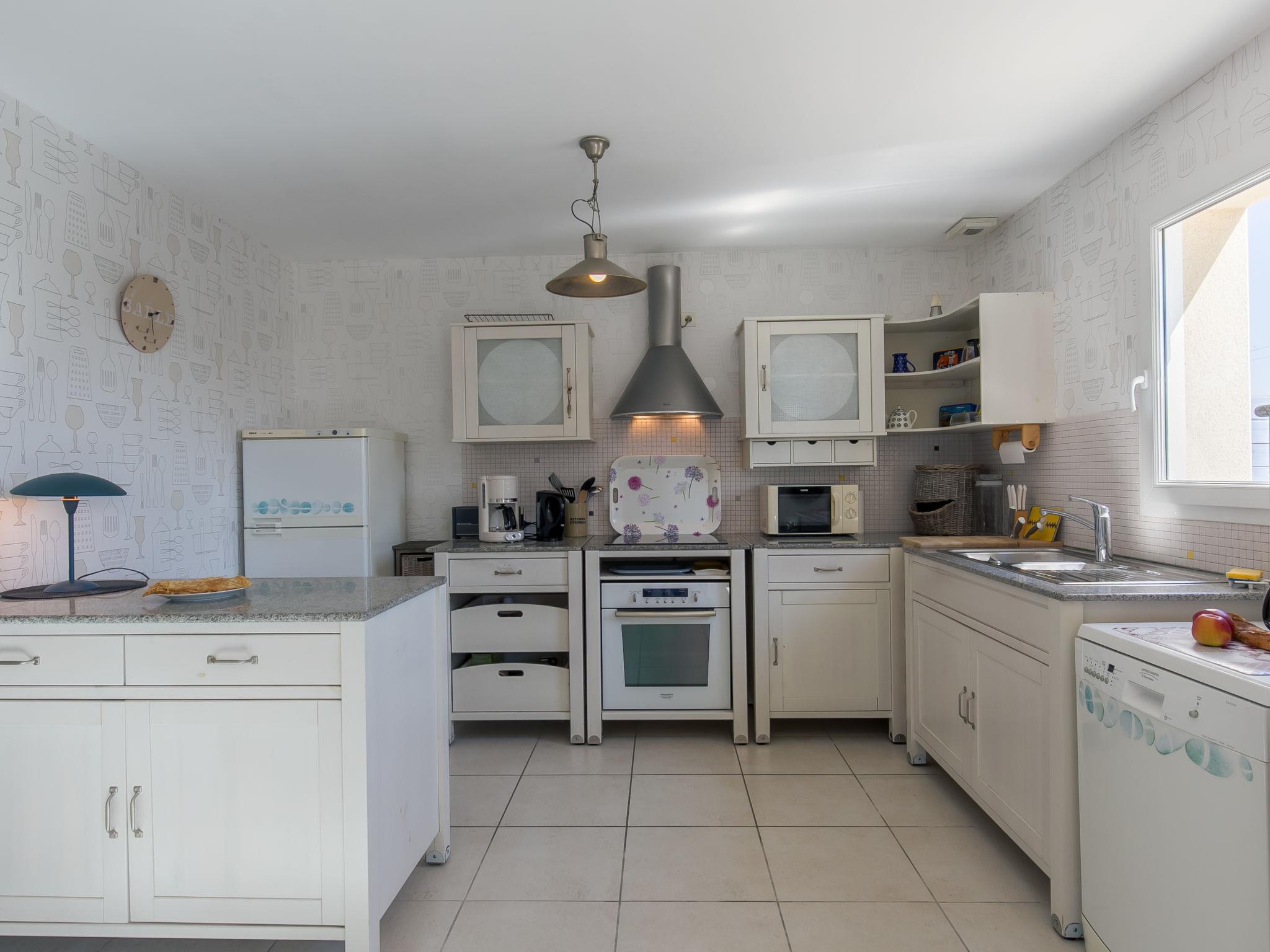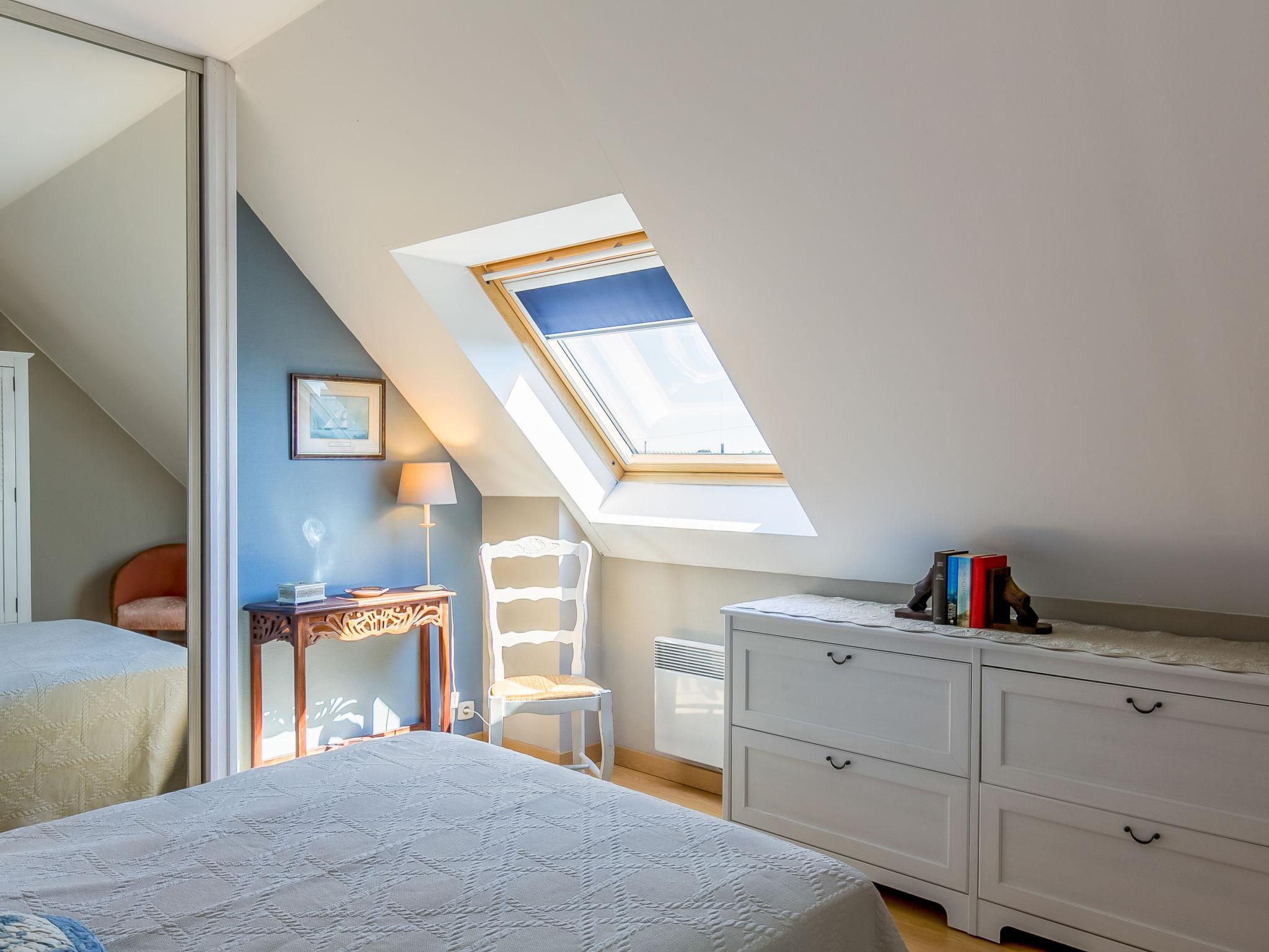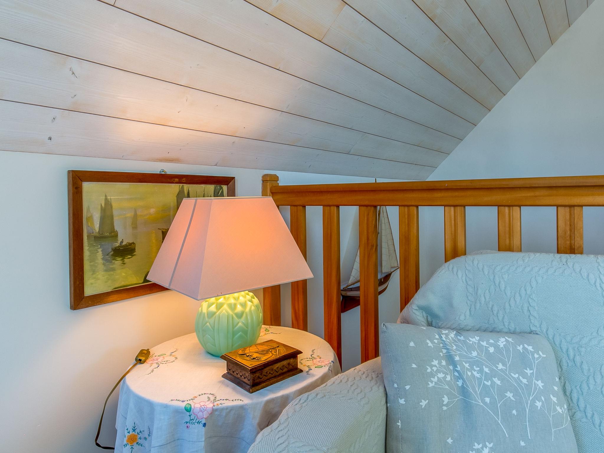 "Penn an Aod", 4-room semi-detached house 75 m2 on 2 levels. Bright, tasteful and cosy furnishings: living/dining room with dining table, satellite TV, radio, CD-player and DVD. Exit to the terrace. 1 room with sliding door with 1 pull-out bed (2 x 80 cm, length 190 cm). Open kitchen (oven, dishwasher, 3 induction hot plates, toaster, kettle, microwave, freezer, electric coffee machine). Shower, sep. WC, double hand-basin. Electric heating. Upper floor: open living room with sloping ceilings with satellite TV, radio, CD-player and DVD. Exit to the balcony. 1 room with sloping ceilings with 2 beds (80 cm, length 190 cm). 1 room with sloping ceilings with 1 french bed (140 cm, length 190 cm). Parquet floors. Balcony, south-west facing position, terrace 20 m2, south-west facing position, garden 200 m2, lawn. Terrace furniture, balcony furniture, barbecue (portable), deck chairs (2), box-room. View of the sea. Facilities: washing machine, iron, children's high chair, baby cot. Please note: non-smoking house. Smoke alarm. Bed layout is flexible. There are more sleeping options available than the maximum number of people allowed which may, however, not be exceeded.