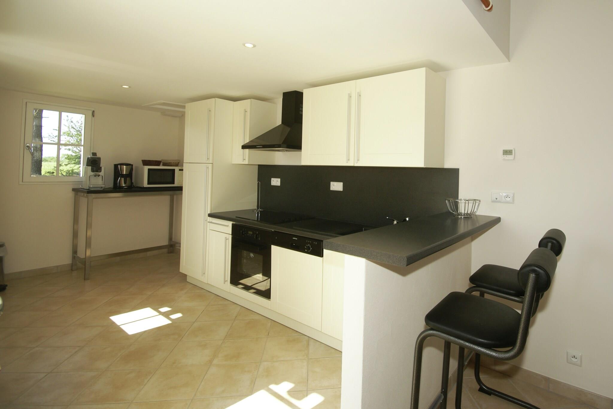 Stueetage: (åbent køkken(ovn, opvaskemaskine ), stue / spisestue, toilet) På 1. etage: (soveværelse(dobbeltseng(140 x 190 cm)), soveværelse(2x enkeltseng(90 x 190 cm)), badeværelse(badekar med bruser, håndvask)) terrasse, have, swimmingpool(deles med andre gæster, opvarmet, opened from May upto and including 1/2 Sep)